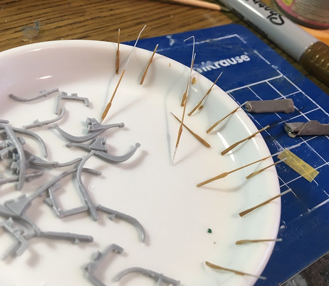 Затем установил на свои места мачты и орудия. Родные флагштоки отправились в помойку, новые изготовил из тянутого литника.