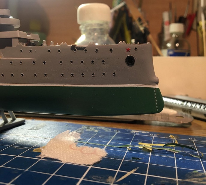 Приступив к сборке поизучал информацию и здесь на форуме, и на сторонних ресурсах, например  Цусимские Форумы,  понял, что пароход неоднократно подвергался модернизации и переделке.  Но повторюсь, пилить ничего не хотел. Единственное, решил для себя по-максимуму облагородить родные детали (сточить излишнюю толщину, выбрать лишний пластик, рассверлить и т.п.)  Растягивать удовольствие на несколько месяцев совсем нет желания. Немного облагородил носовую часть корпуса: покрасил клюз и звезду, остатками какой-то декали имитировал марку осадки.  Ну и куда же бес спешки, на сухую прикинул палубу и надстройку.