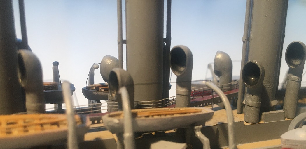 Доброго дня. Сажа в дефлекторах вообще не в тему, от слова совсем. Раз у нас корабль строится на период после ВОВ (судя по тому, что Вы оставили как есть якорное устройство с якорями Холла), дефлекторы следовало бы покрасить внутри красным.