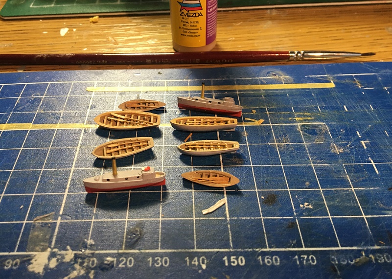 Пока сохнут большие детали, решил заняться мелкими плавсредствами. Очень неудачное место для толкателей выбрал производитель, а именно внутри шлюпки на банках. Попробовал срезать ножом- не выходит, пробовал разогретым шилом, тоже нет. Чтобы хоть как-то убрать это безобразие решил накидать в шлюпки весел. Весла сделал из тянутого литника, приплюснутого с одной стороны молотком. На паровых катерах добавил трубы из тянутого литника. Тяжело, конечно, с такой мелочью работать.