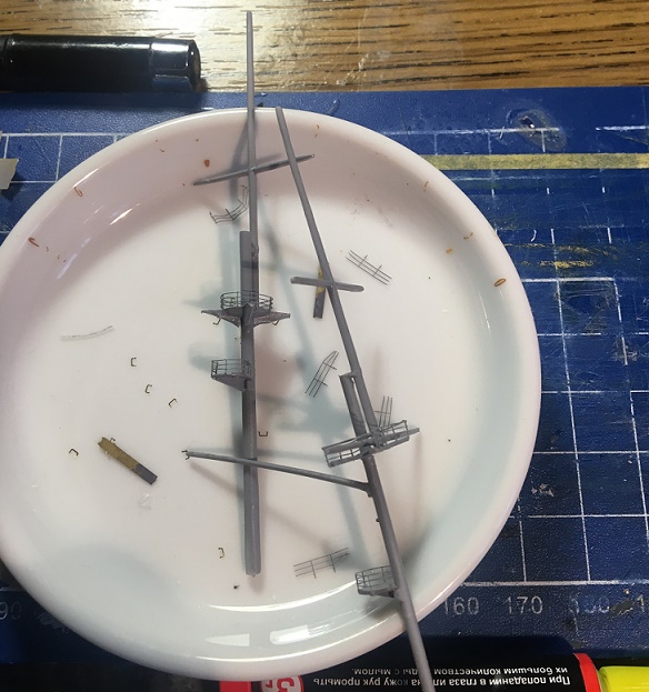 Вырубил из литника детали для мачт. Мачты- это что-то с чем-то. Стачивал ножом и рашпилем лишний пластик, к законцовкам рей и к вершинам пытался придать небольшой конус. Пластик точится без проблем, вот только сильно теряет свою механическую прочность, начинает гнуться очень сильно. Думал заменить на проволоку, но в конце концов решил оставить как есть. Гафель кормовой мачты заменил на тянутый литник, родной очень уж кривой был. Площадки для дозорных (или как они по-научному называются) так же сточил на наждаке и дополнил леерами. Сверху все задул в базовый серый цвет.