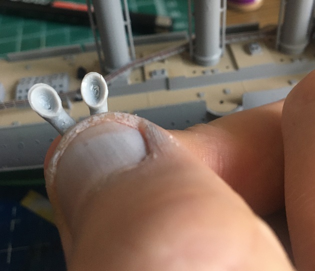На сегодняшний день, с деталей парохода уже сточил пластика на еще один такой же пароход. Очень много стыков пресс-форм, особенно на видимых местах. Так например на раструбах вентиляции помимо толстенных стенок и следов от толкателей есть еще узор от стыка пресс-формы. Лишний пластик выбирал изнутри бор-машинкой с фрезой, затем зачищал наждачкой, следы от толкателей зашпаклевал, так же тонкой полоской малярной ленты имитировал утолщение на ноге раструба. Так хоть какая-то фактура будет. Раструбы окрасил в основной цвет, затем внутри оттонировал сажей от жженого литника. Издалека появился хоть какой-то объем.