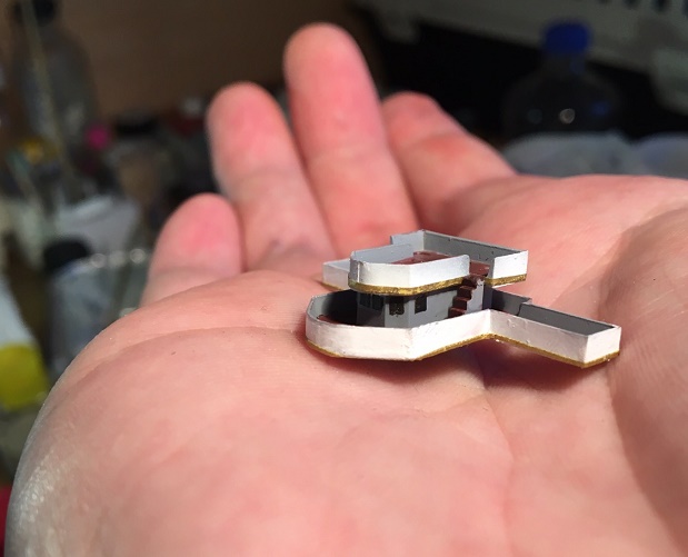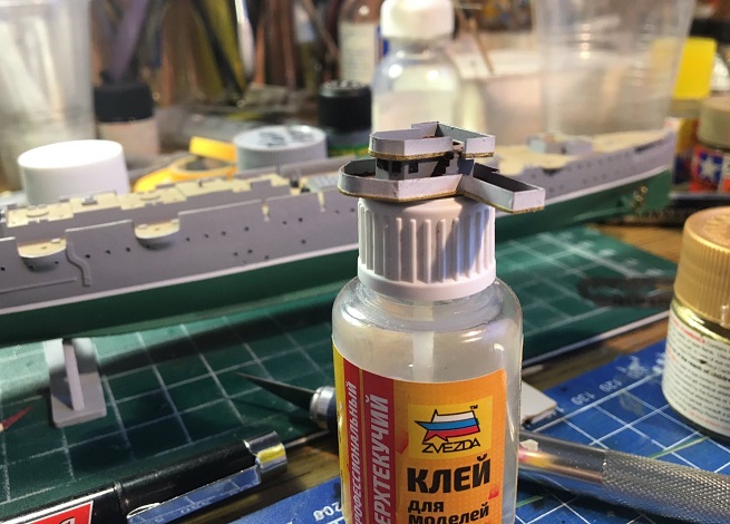 Попутно с окраской рубки окрасил и кормовой мостик и палубу кормовой надстройки. Чтобы лишний раз краску не мешать, крашу сразу несколько заготовок одного цвета. Переход к кормовому мостику снял для избегания его повреждения при монтаже других деталей. Склеил трубы, расточил ножом и круглым рашпилем отверстие сверху, немного оттонировал краской и сажей верхнюю часть. Попутно зарисовал маркером иллюминаторы и световые окна по бортам и на палубе.