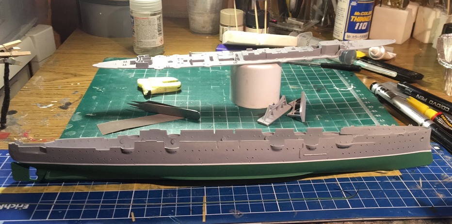 Cборку начал с фюзеляжа корпуса. На удивление склеились 2 половины без проблем, шпаклевать не стал, просто наждаком обработал шов. На корпусе порадовало наличие имитации ватерлинии, что несомненно упрощает процесс ее нанесения. Задул сначала середину белым тамиевским акрилом, затем на глаз намешал звездовкий акрил для окрашивания подводной части парохода. Серый-шаровый, тоже намешал на глаз из остатков. Сразу оговорюсь собрать хочу просто красиво, аккуратно, без привязки к конкретному историческому периоду, без перепилов и гор афтермаркета; собирательный образ так сказать.