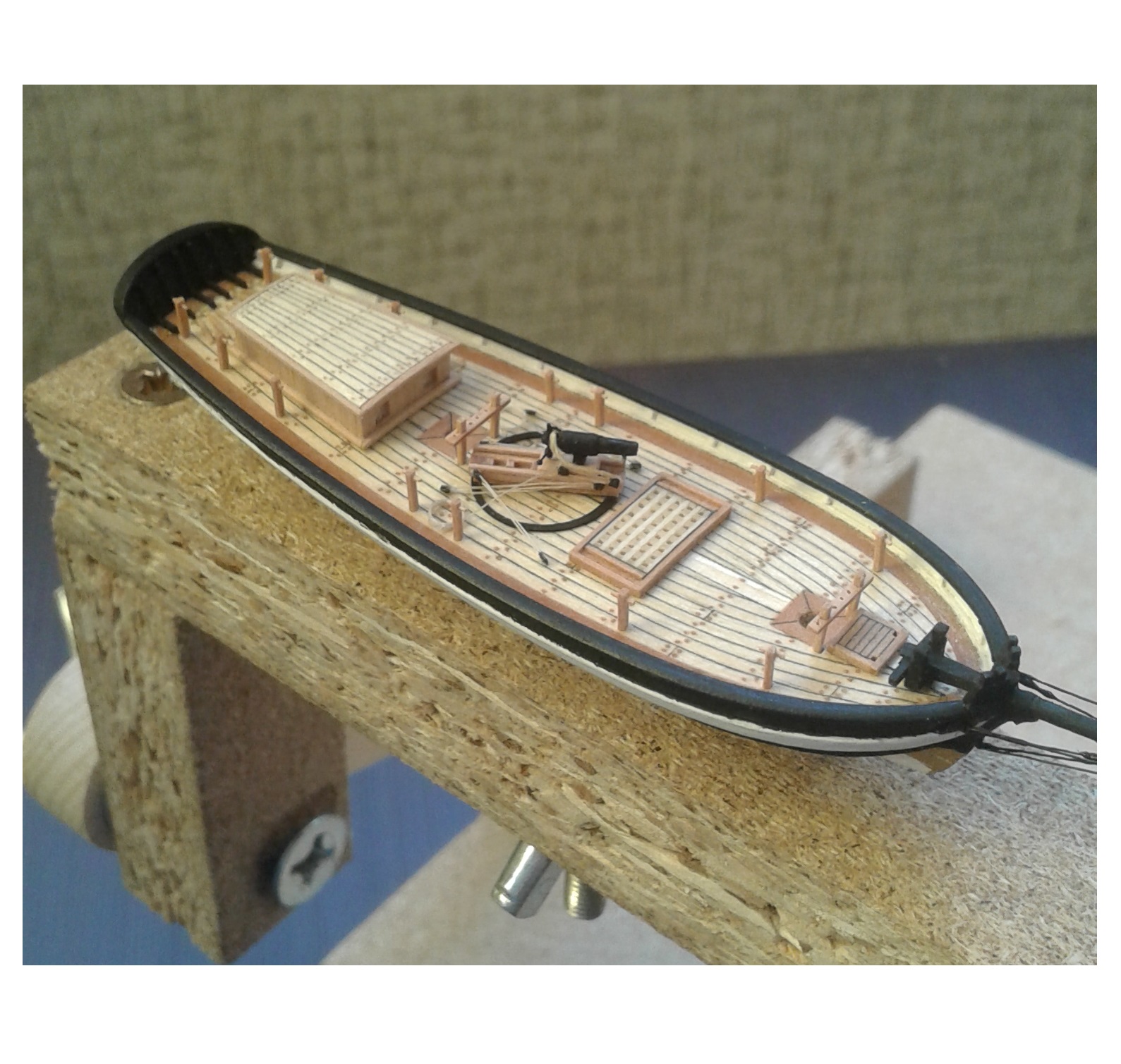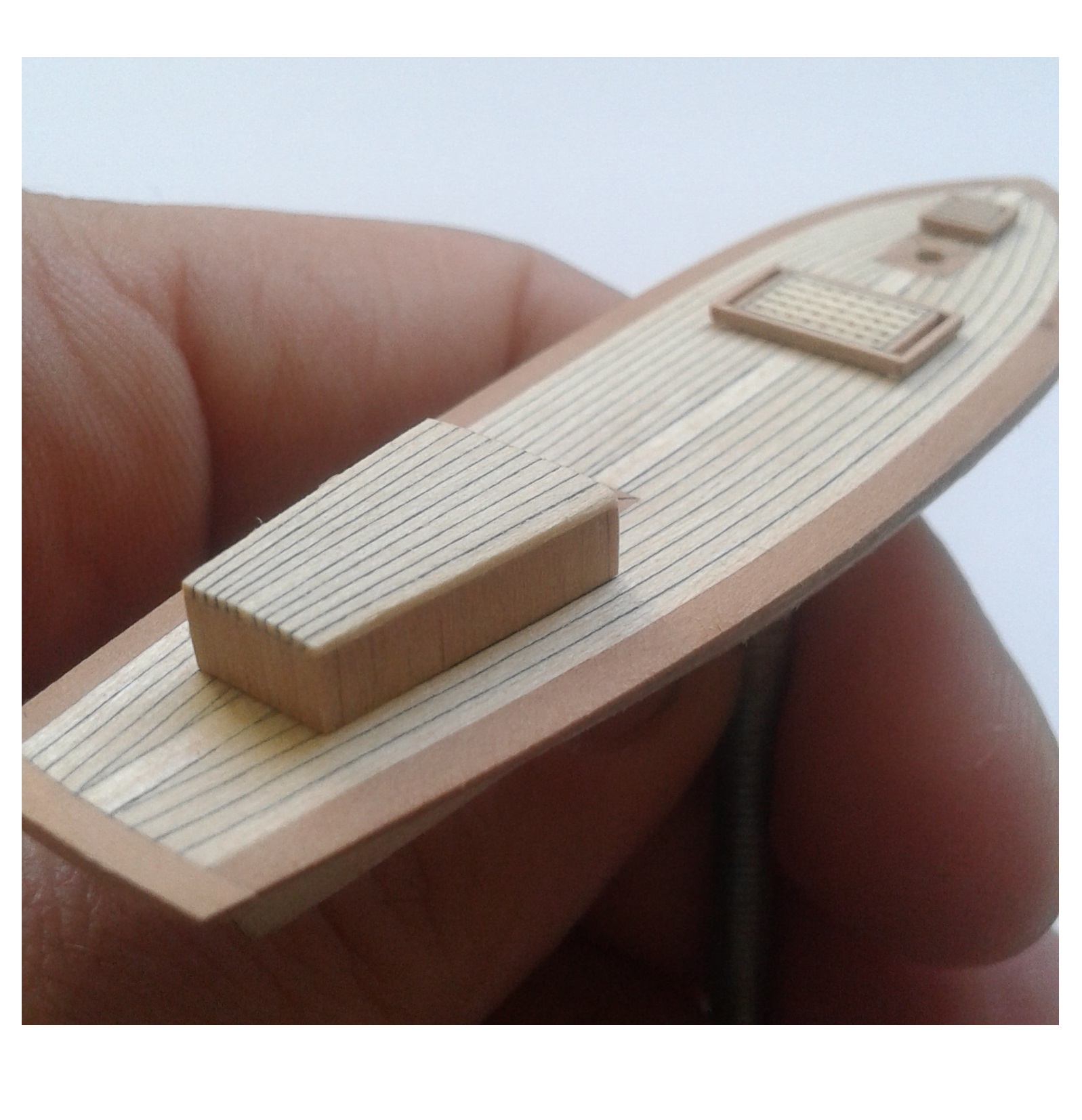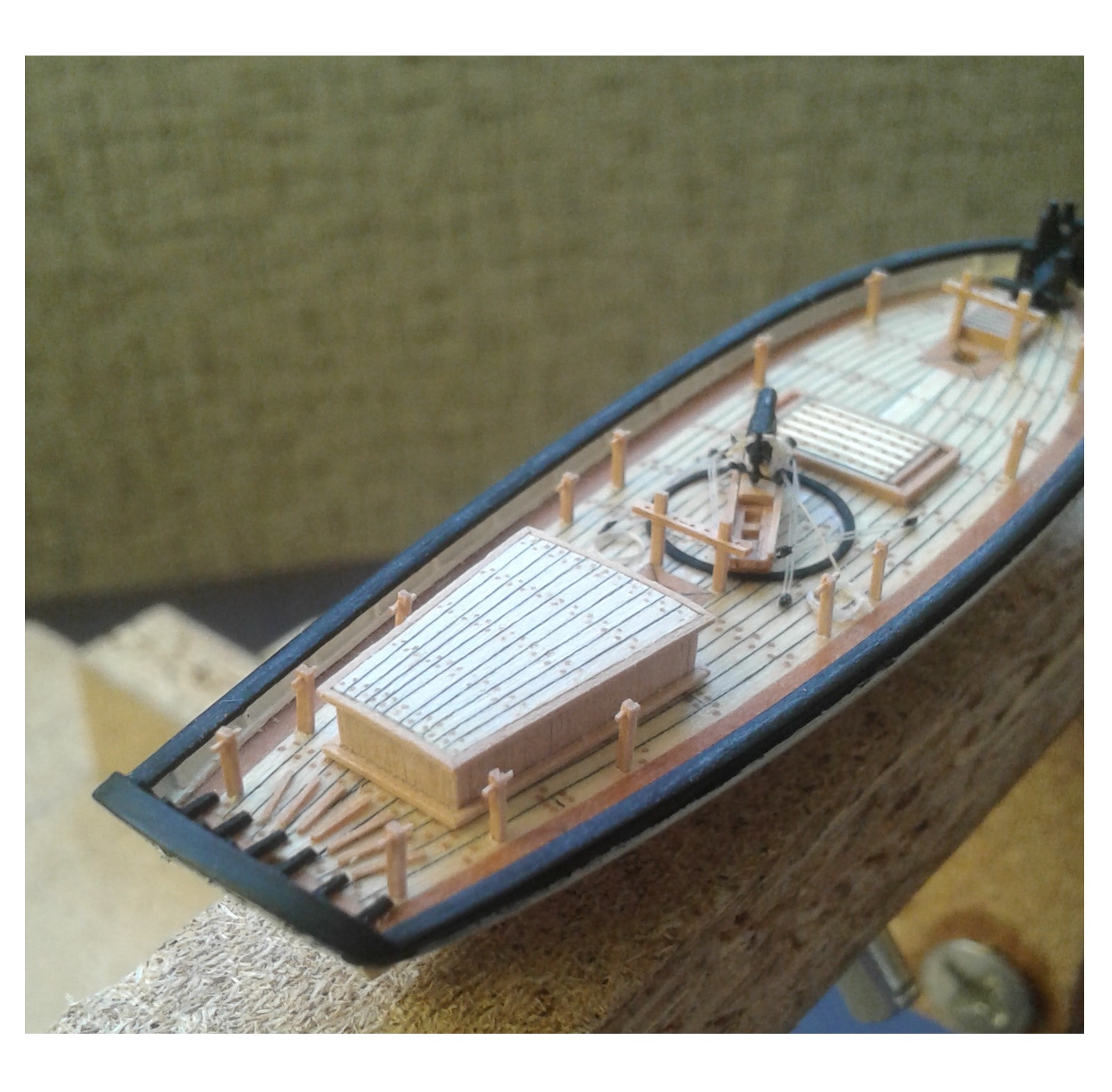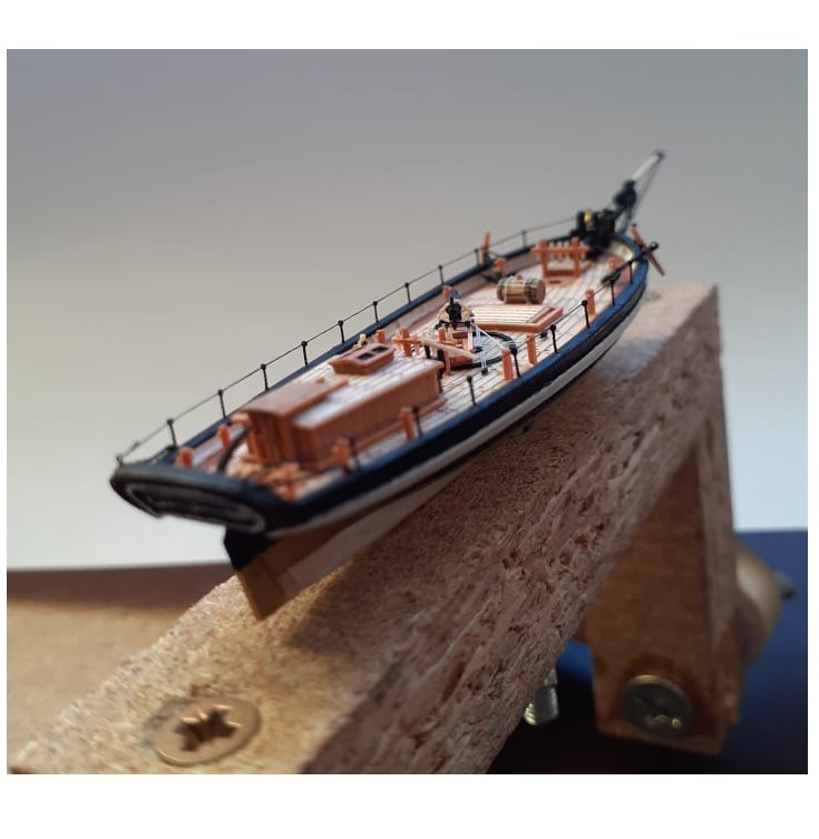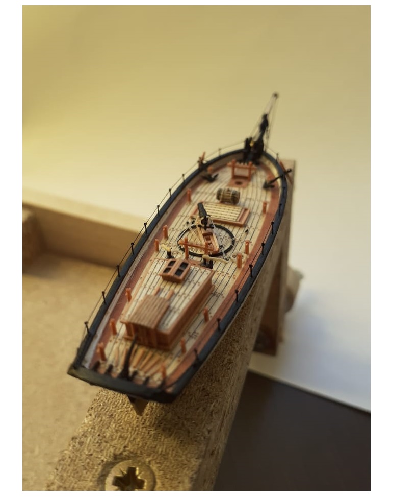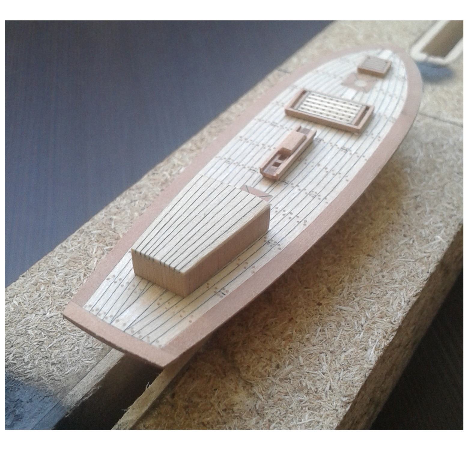 Масштаб 1:192. Судно довольно маленькое, порядка 15 метров. Длинна по палубе около 7,5 см. Черновой корпус из липы, палуба наборная - светлый граб и розовая груша. Доски шириной 1мм, гнул в кондукторе по линии борта и собирал в пакет отдельно правую и левую по диаметральной плоскости, далее все на черновой корпус. Ватервейсы из розовой груши, тоже цельногнутые, распаривал и гнул поэтапно до получения необходимого изгиба. Конопатка между досок - тонкая черная бумага. После сборки палубе придал погиб и подправил седловатость, отцикливал.