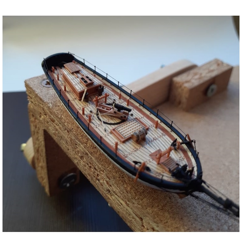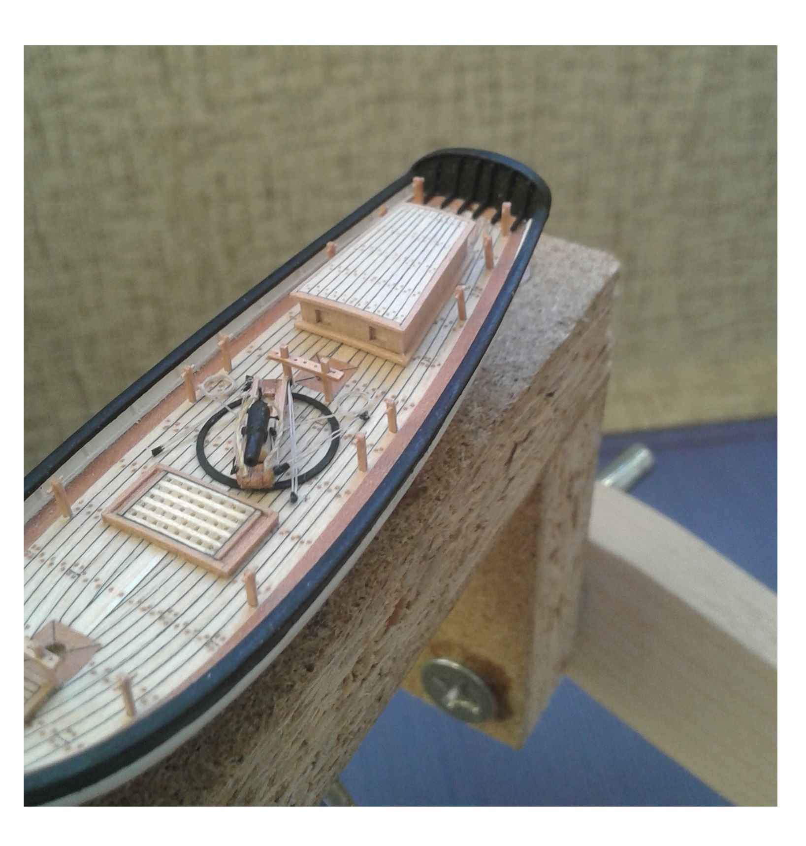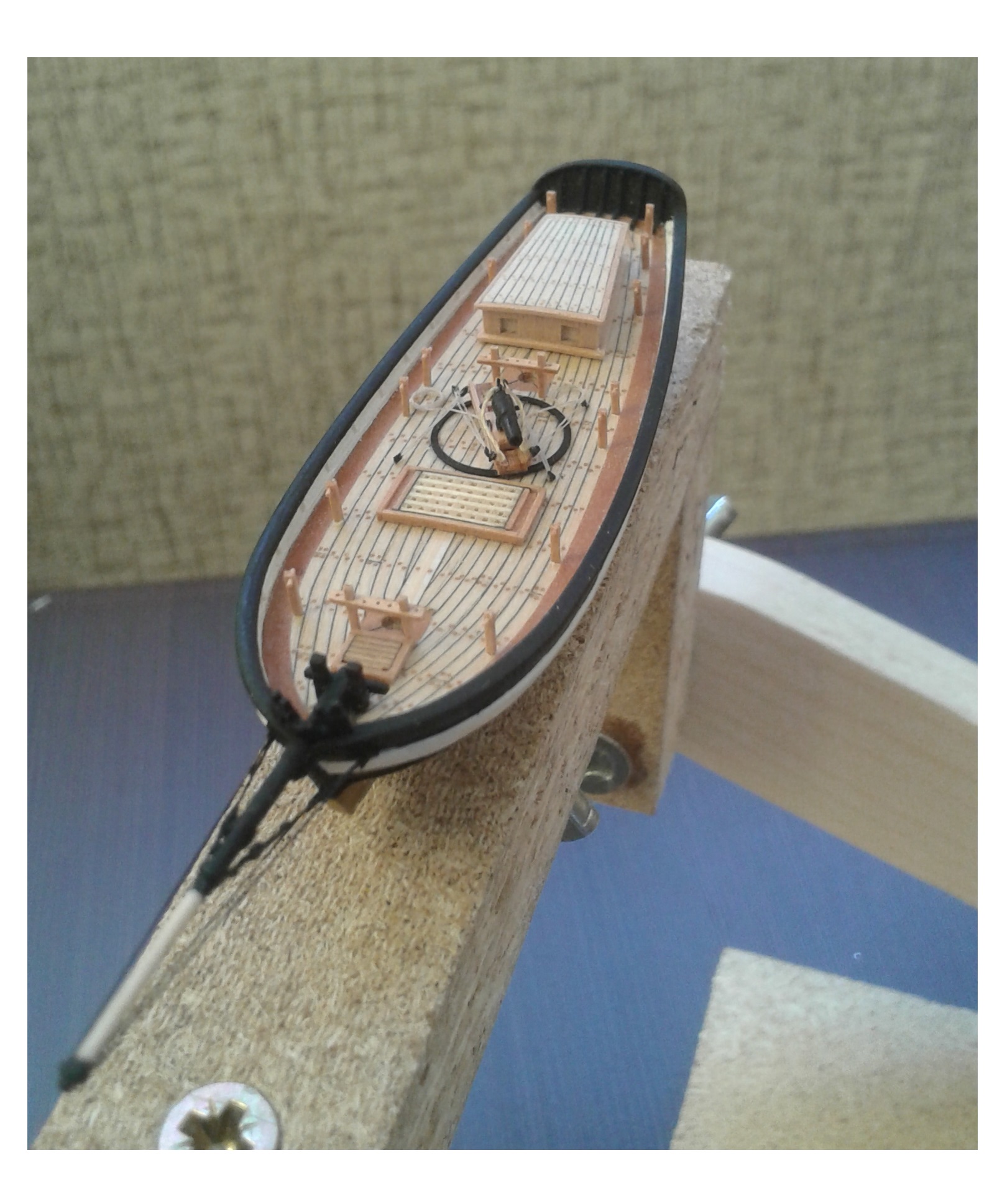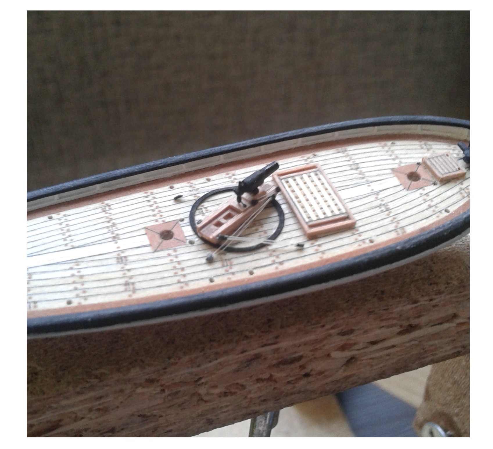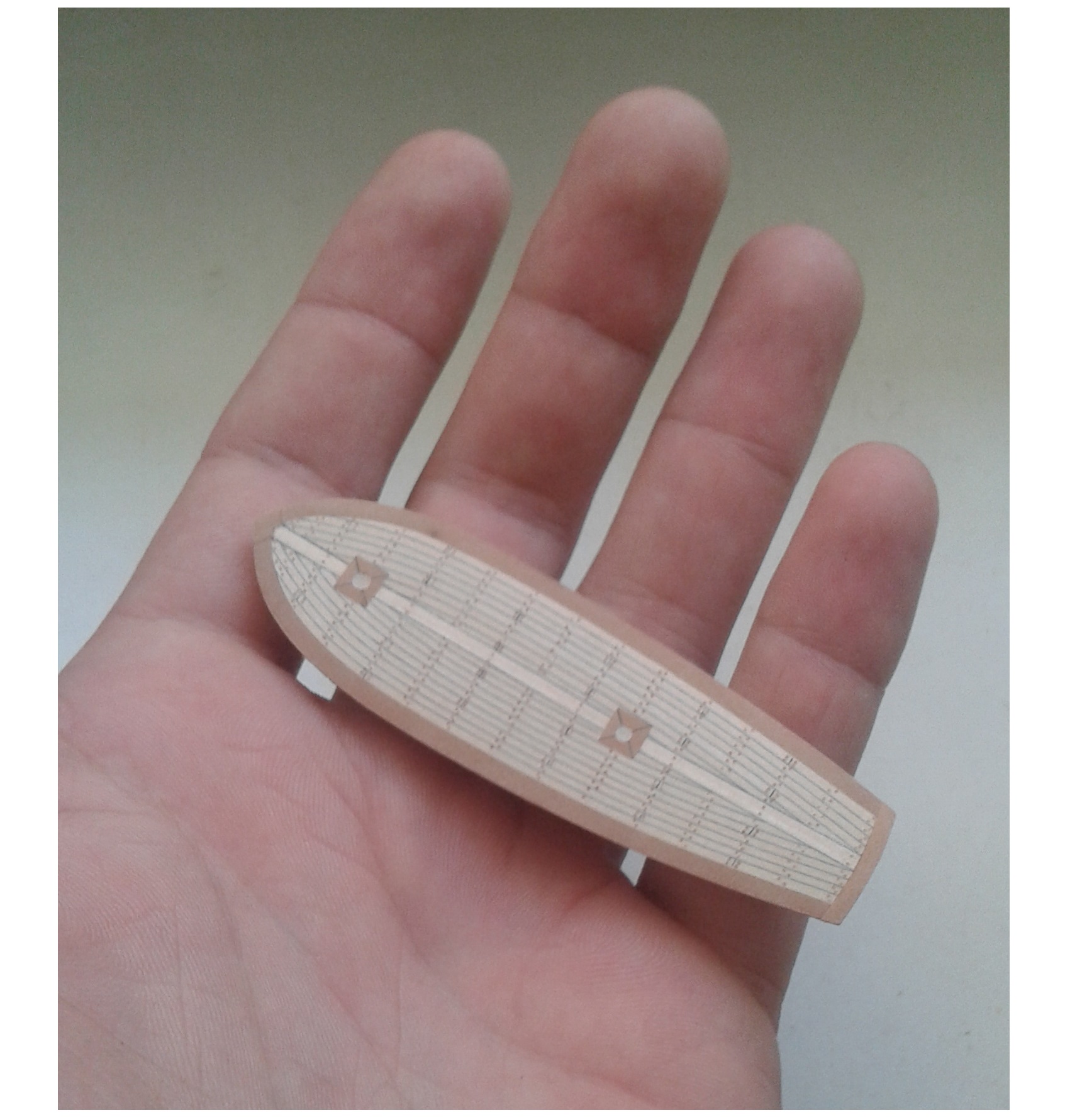 Масштаб 1:192. Судно довольно маленькое, порядка 15 метров. Длинна по палубе около 7,5 см. Черновой корпус из липы, палуба наборная - светлый граб и розовая груша. Доски шириной 1мм, гнул в кондукторе по линии борта и собирал в пакет отдельно правую и левую по диаметральной плоскости, далее все на черновой корпус. Ватервейсы из розовой груши, тоже цельногнутые, распаривал и гнул поэтапно до получения необходимого изгиба. Конопатка между досок - тонкая черная бумага. После сборки палубе придал погиб и подправил седловатость, отцикливал.
