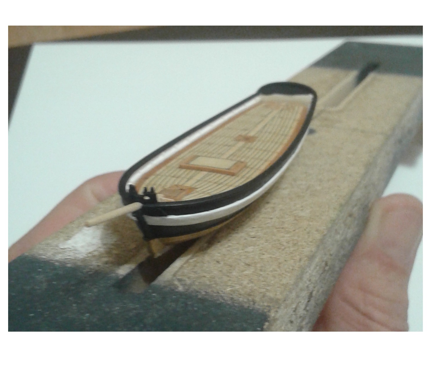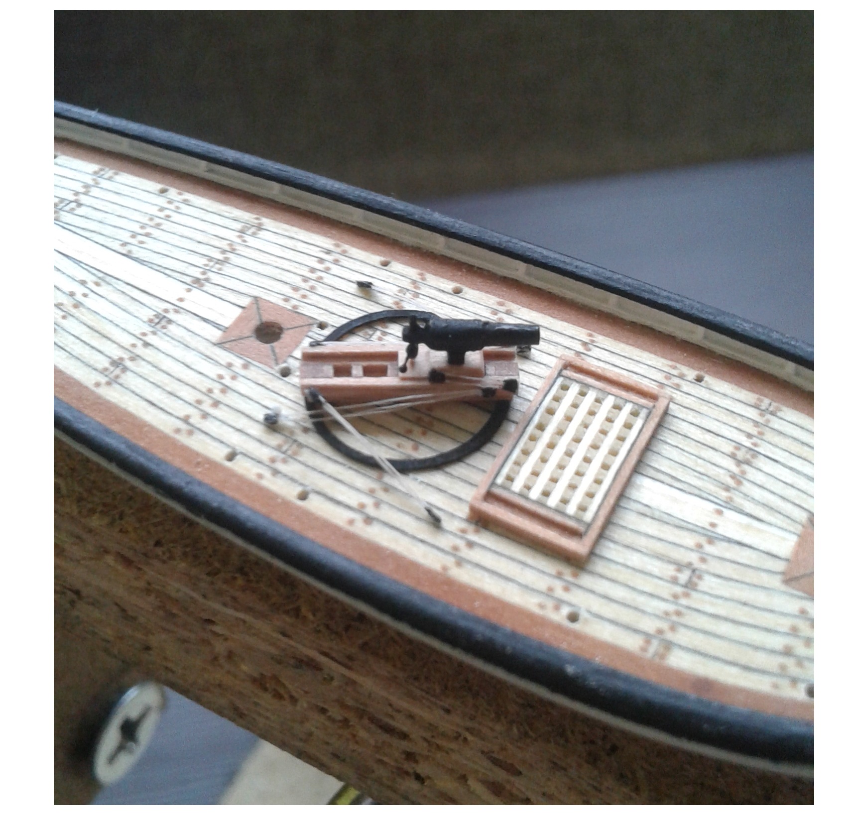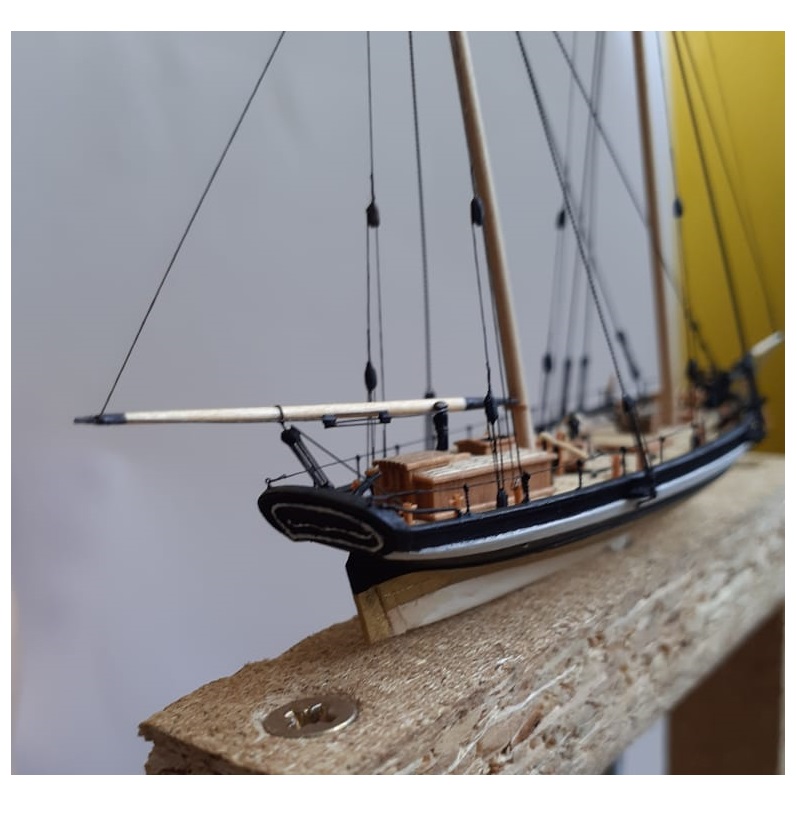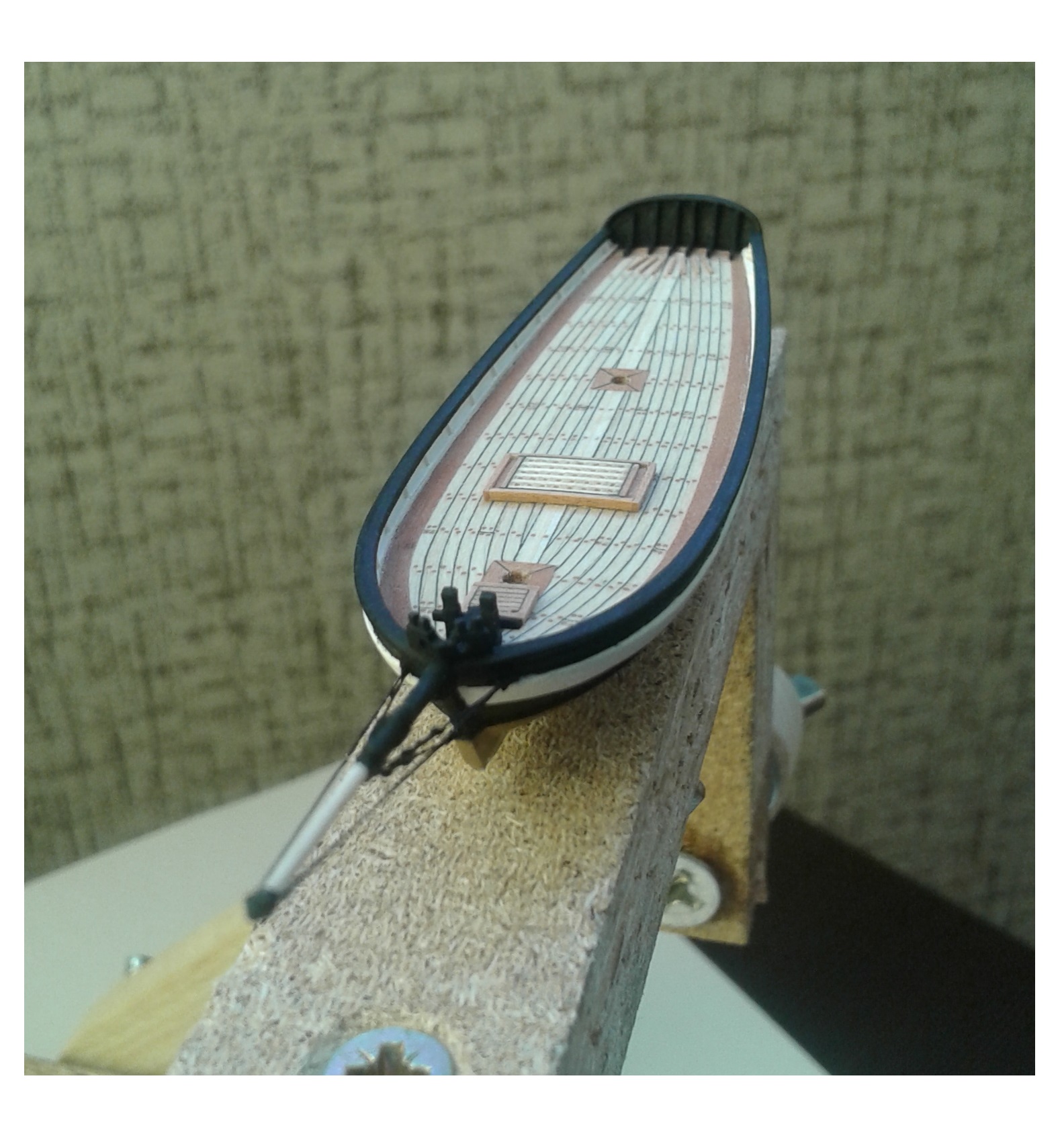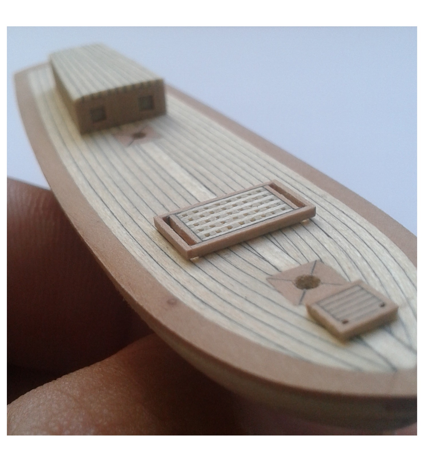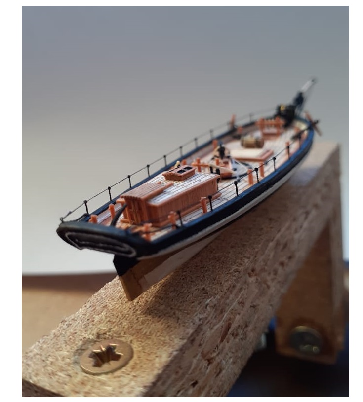 Масштаб 1:192. Судно довольно маленькое, порядка 15 метров. Длинна по палубе около 7,5 см. Черновой корпус из липы, палуба наборная - светлый граб и розовая груша. Доски шириной 1мм, гнул в кондукторе по линии борта и собирал в пакет отдельно правую и левую по диаметральной плоскости, далее все на черновой корпус. Ватервейсы из розовой груши, тоже цельногнутые, распаривал и гнул поэтапно до получения необходимого изгиба. Конопатка между досок - тонкая черная бумага. После сборки палубе придал погиб и подправил седловатость, отцикливал.