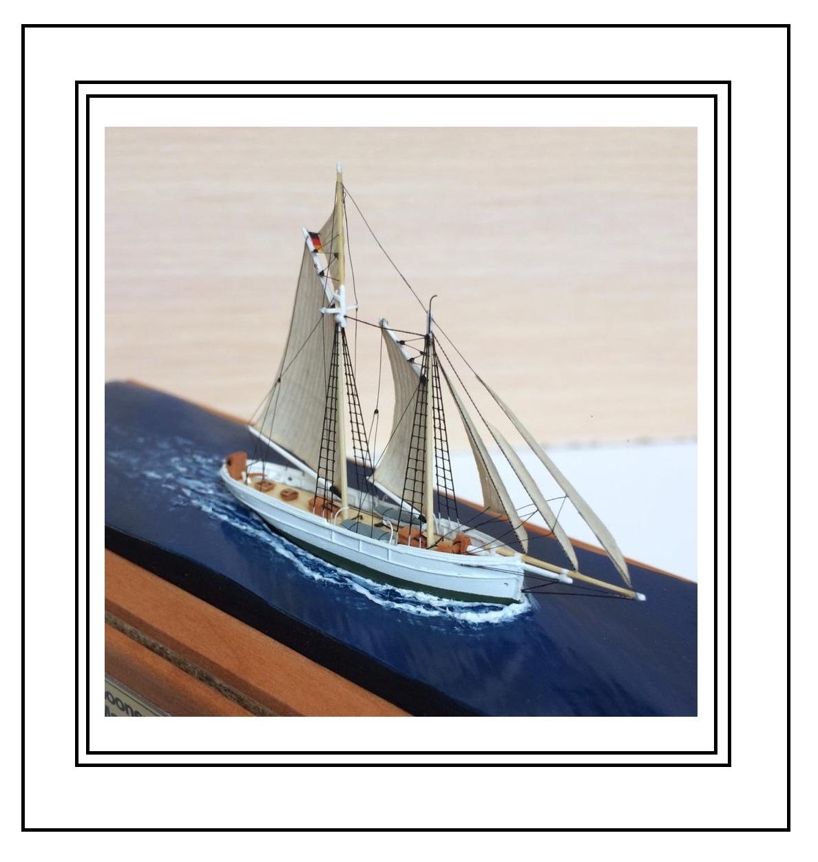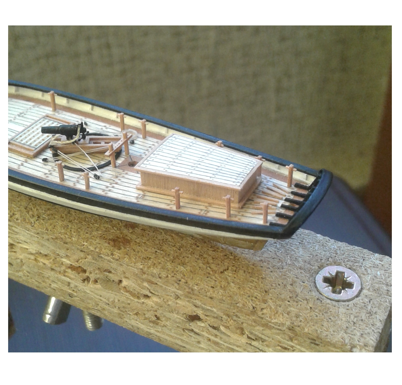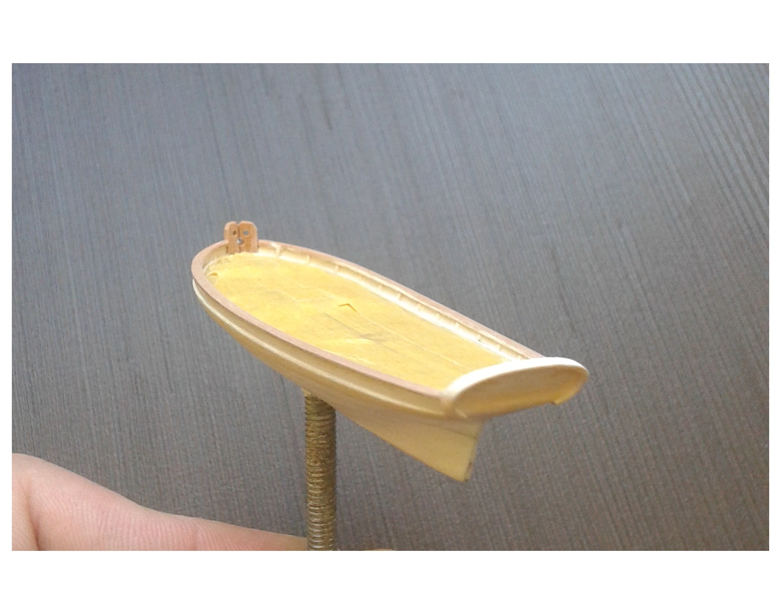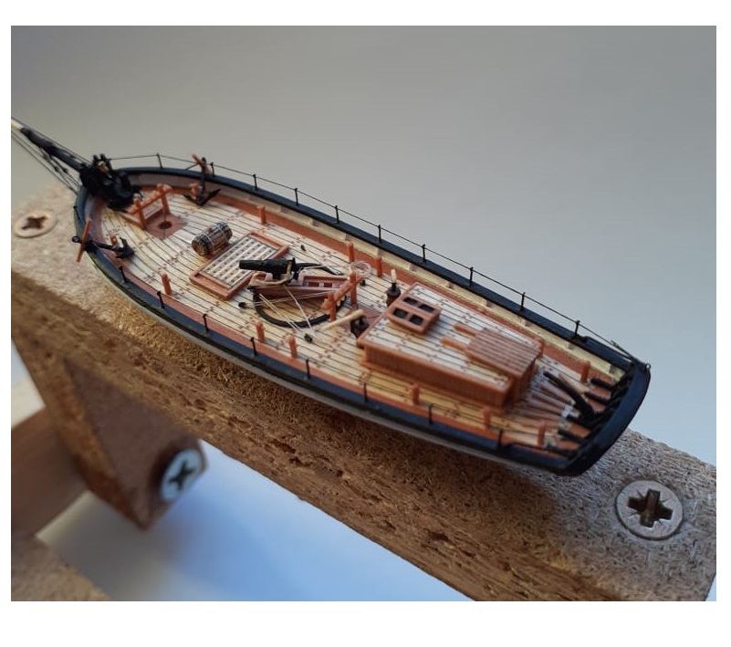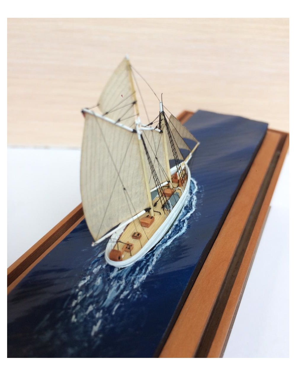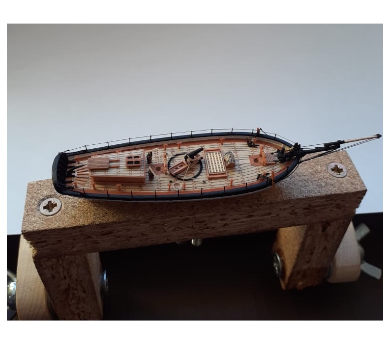 Масштаб 1:192. Судно довольно маленькое, порядка 15 метров. Длинна по палубе около 7,5 см. Черновой корпус из липы, палуба наборная - светлый граб и розовая груша. Доски шириной 1мм, гнул в кондукторе по линии борта и собирал в пакет отдельно правую и левую по диаметральной плоскости, далее все на черновой корпус. Ватервейсы из розовой груши, тоже цельногнутые, распаривал и гнул поэтапно до получения необходимого изгиба. Конопатка между досок - тонкая черная бумага. После сборки палубе придал погиб и подправил седловатость, отцикливал.