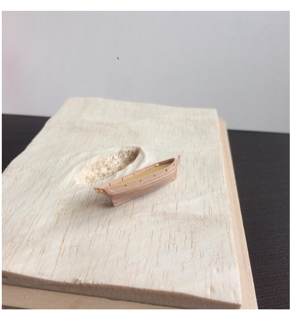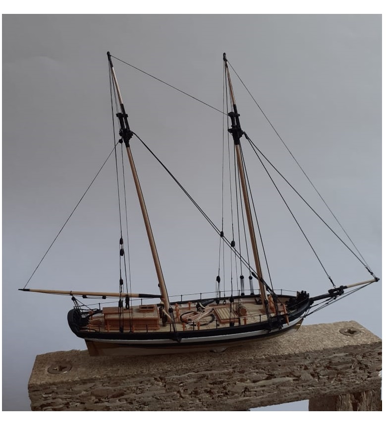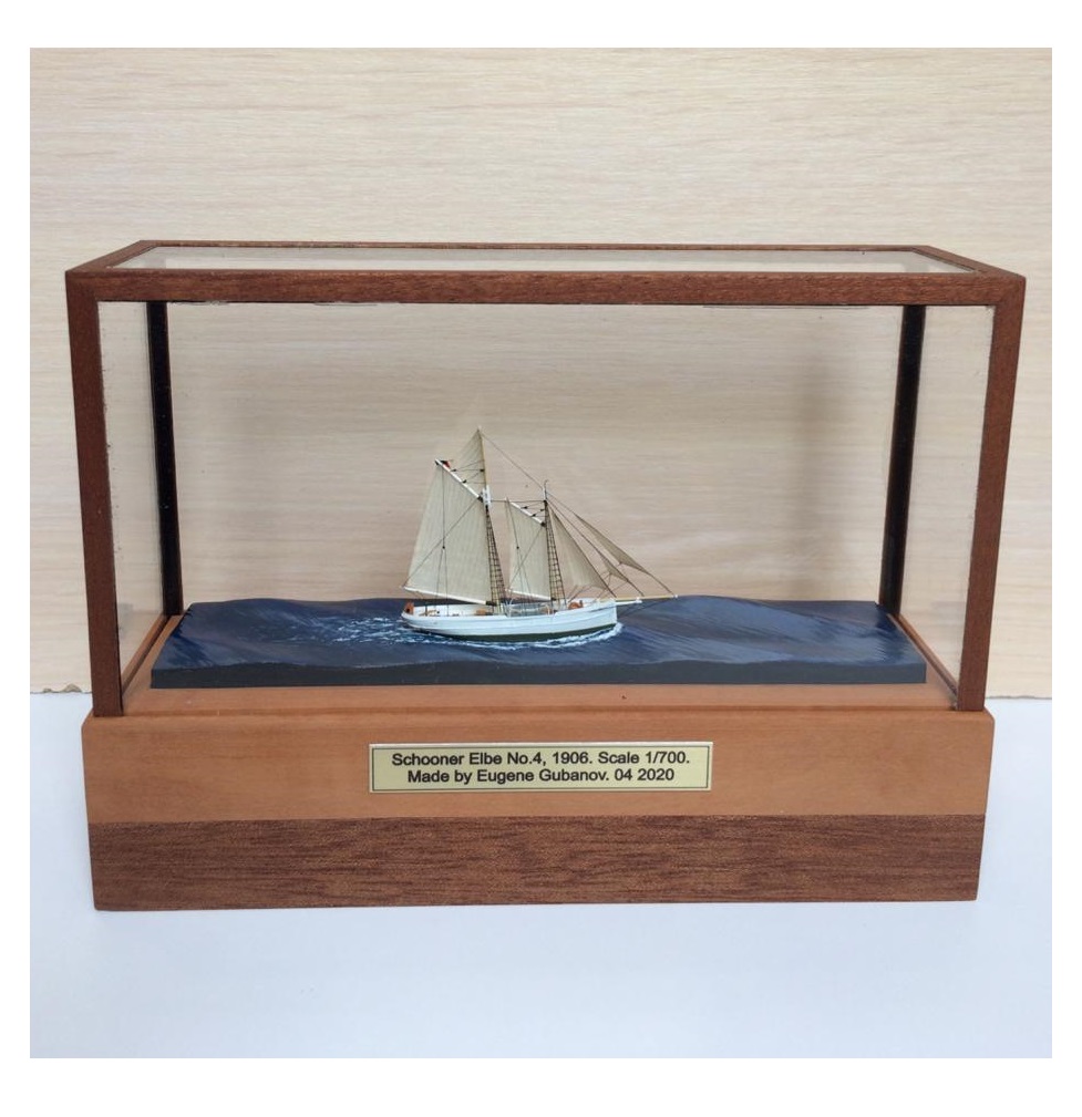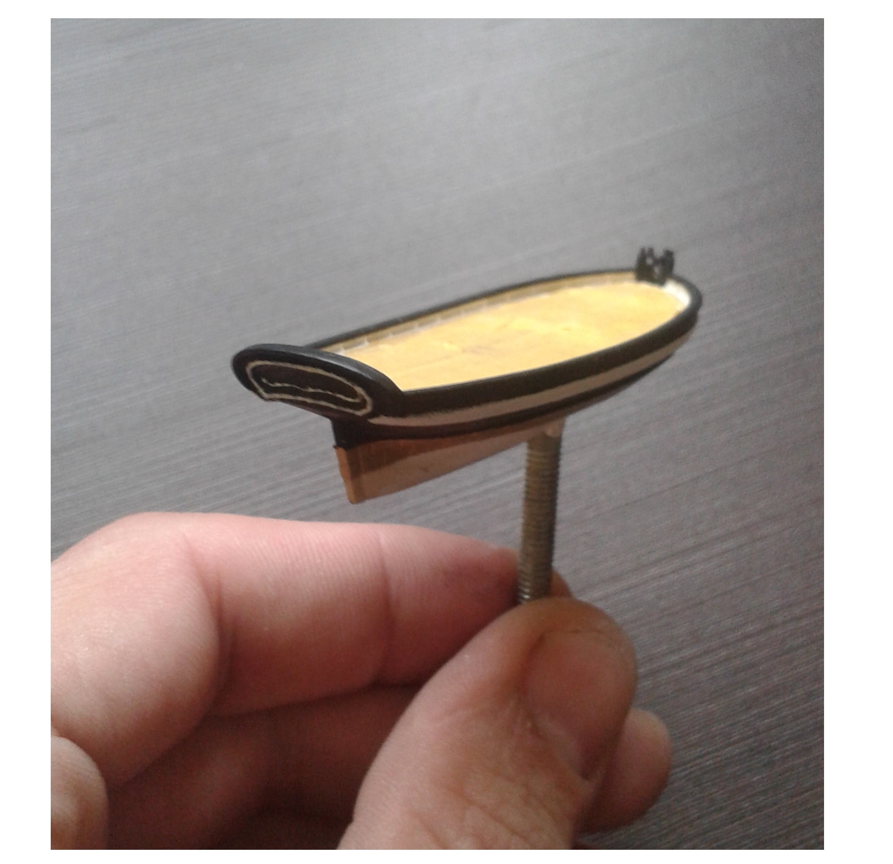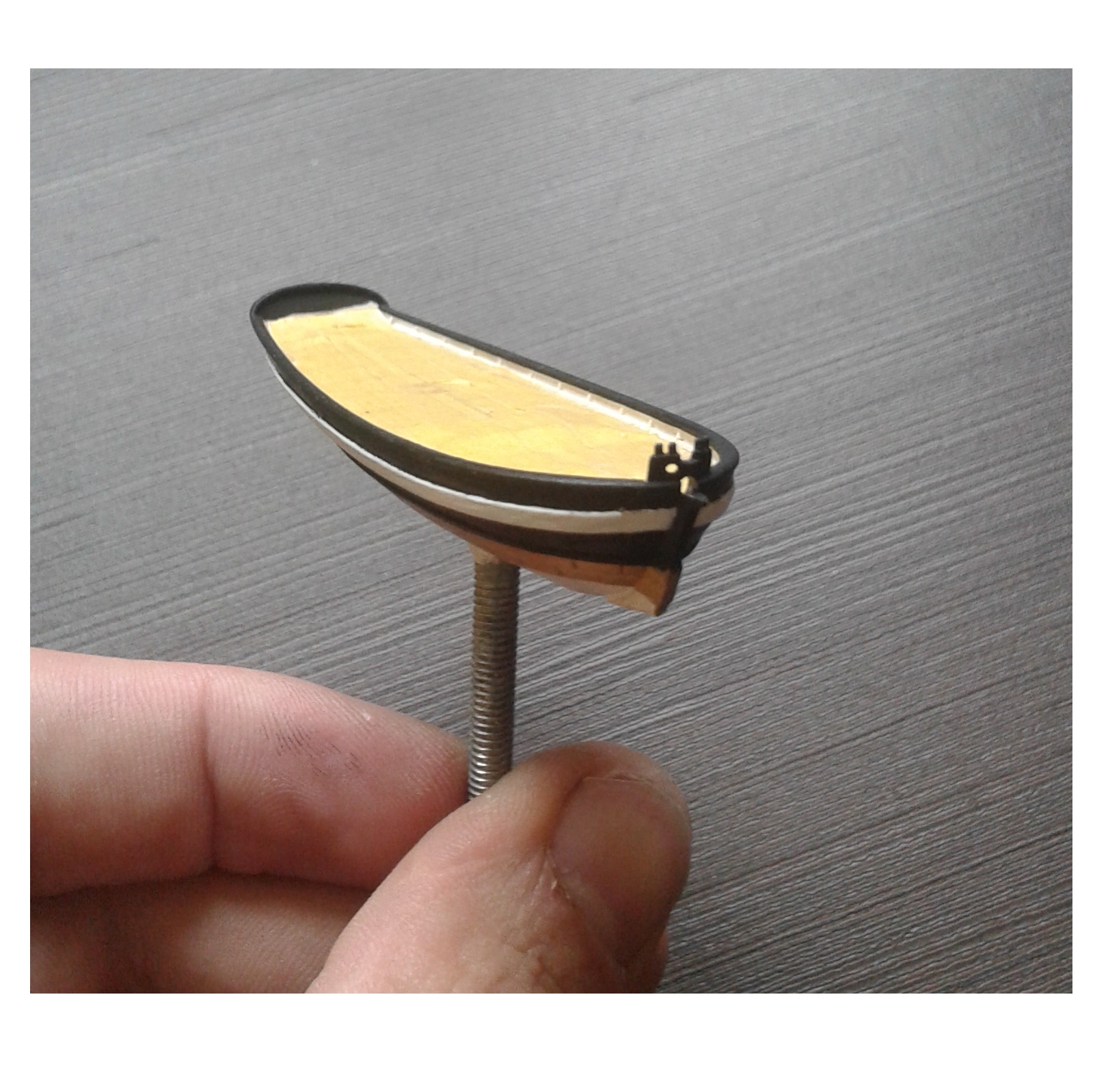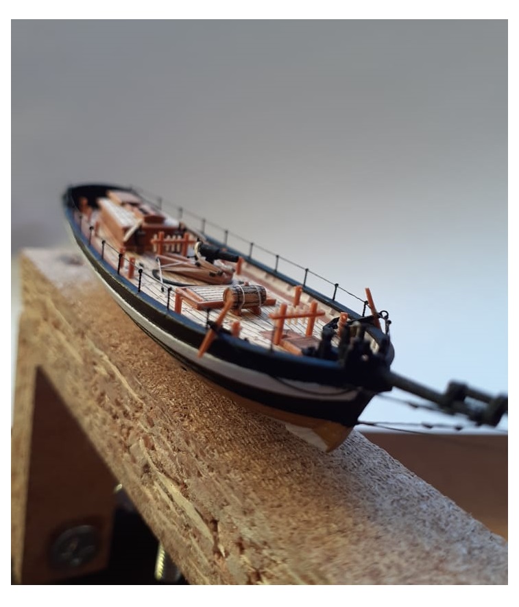 Масштаб 1:192. Судно довольно маленькое, порядка 15 метров. Длинна по палубе около 7,5 см. Черновой корпус из липы, палуба наборная - светлый граб и розовая груша. Доски шириной 1мм, гнул в кондукторе по линии борта и собирал в пакет отдельно правую и левую по диаметральной плоскости, далее все на черновой корпус. Ватервейсы из розовой груши, тоже цельногнутые, распаривал и гнул поэтапно до получения необходимого изгиба. Конопатка между досок - тонкая черная бумага. После сборки палубе придал погиб и подправил седловатость, отцикливал.