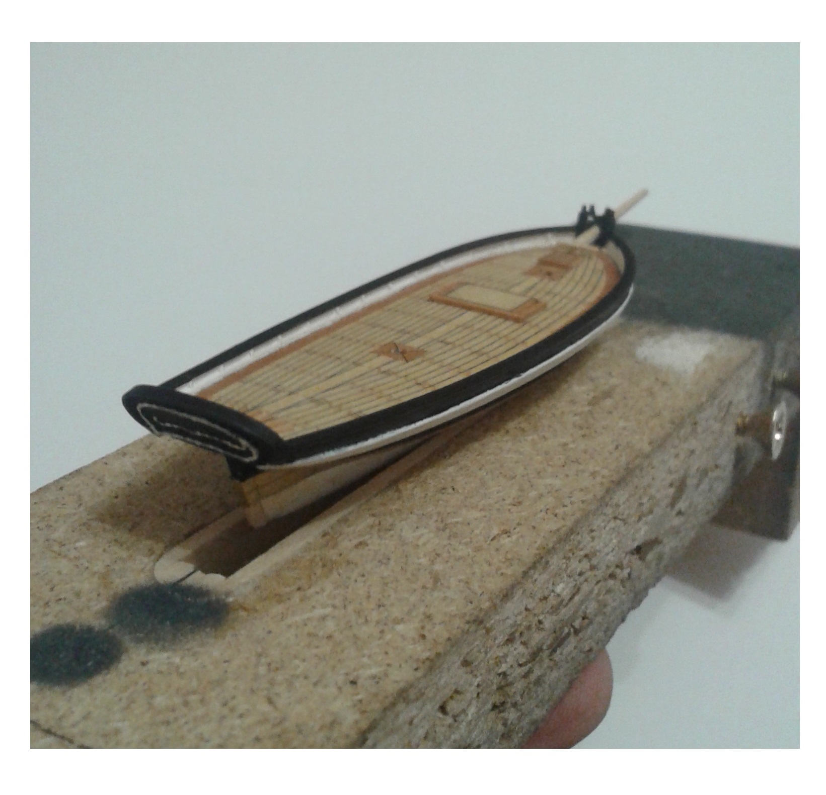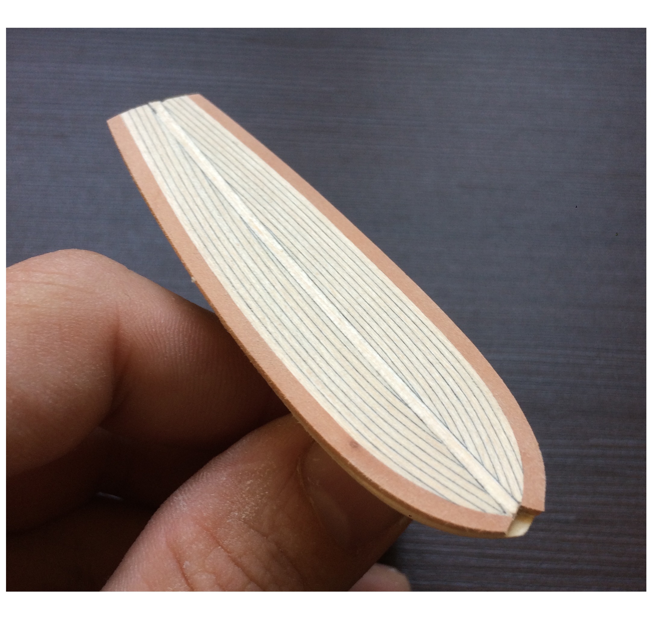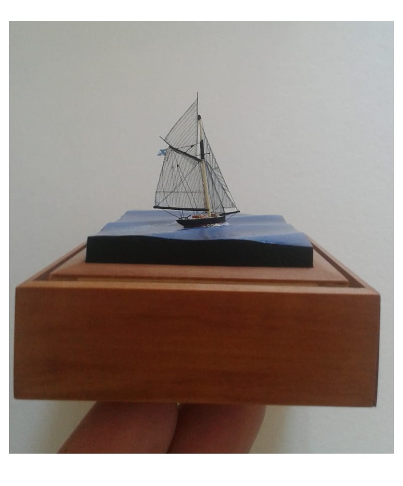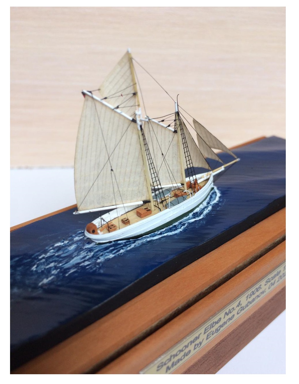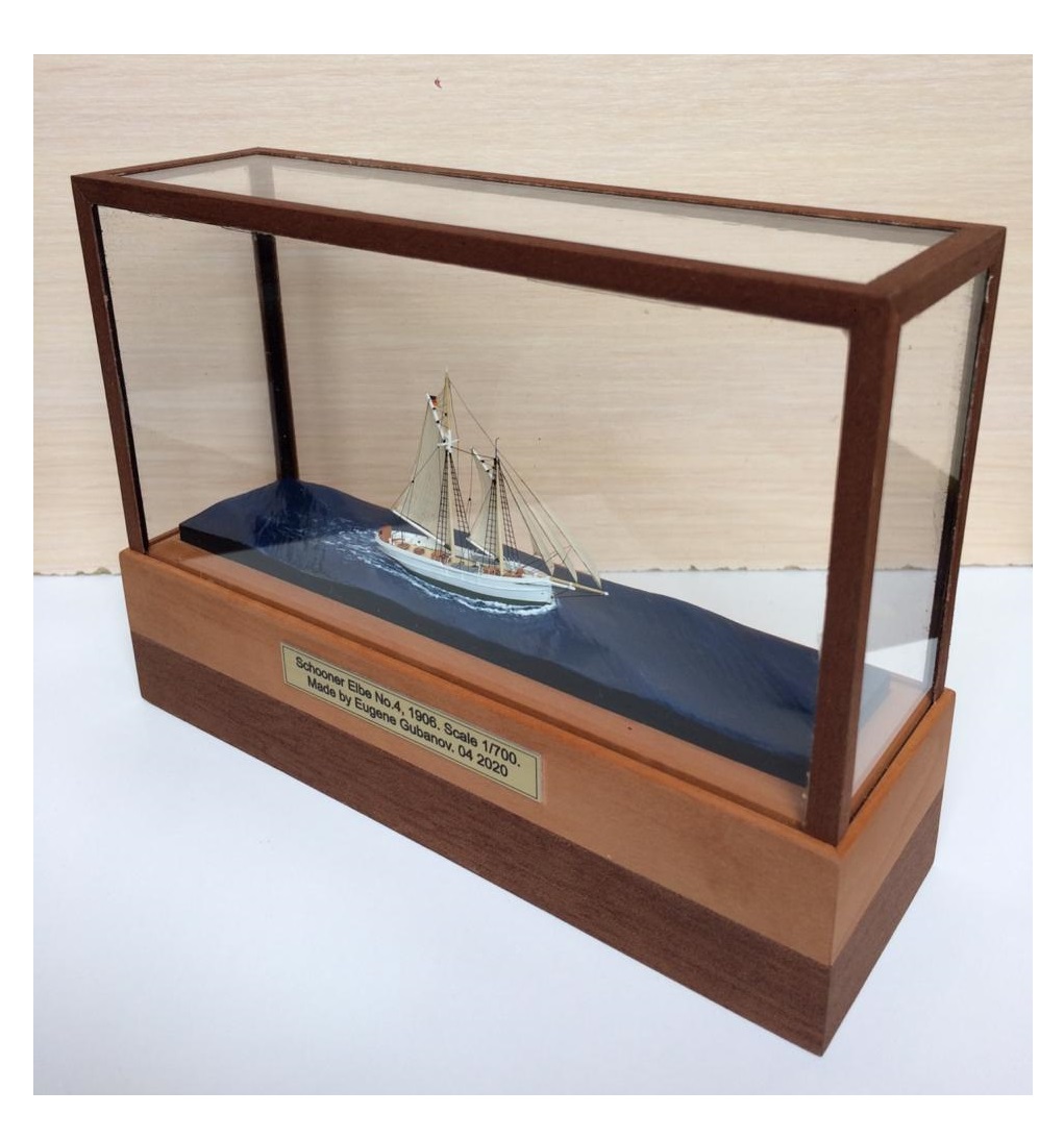 Масштаб 1:192. Судно довольно маленькое, порядка 15 метров. Длинна по палубе около 7,5 см. Черновой корпус из липы, палуба наборная - светлый граб и розовая груша. Доски шириной 1мм, гнул в кондукторе по линии борта и собирал в пакет отдельно правую и левую по диаметральной плоскости, далее все на черновой корпус. Ватервейсы из розовой груши, тоже цельногнутые, распаривал и гнул поэтапно до получения необходимого изгиба. Конопатка между досок - тонкая черная бумага. После сборки палубе придал погиб и подправил седловатость, отцикливал.