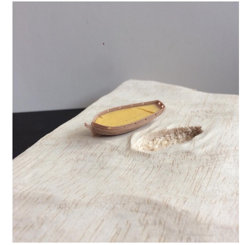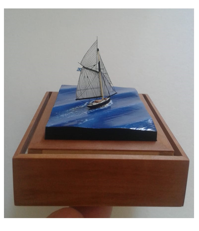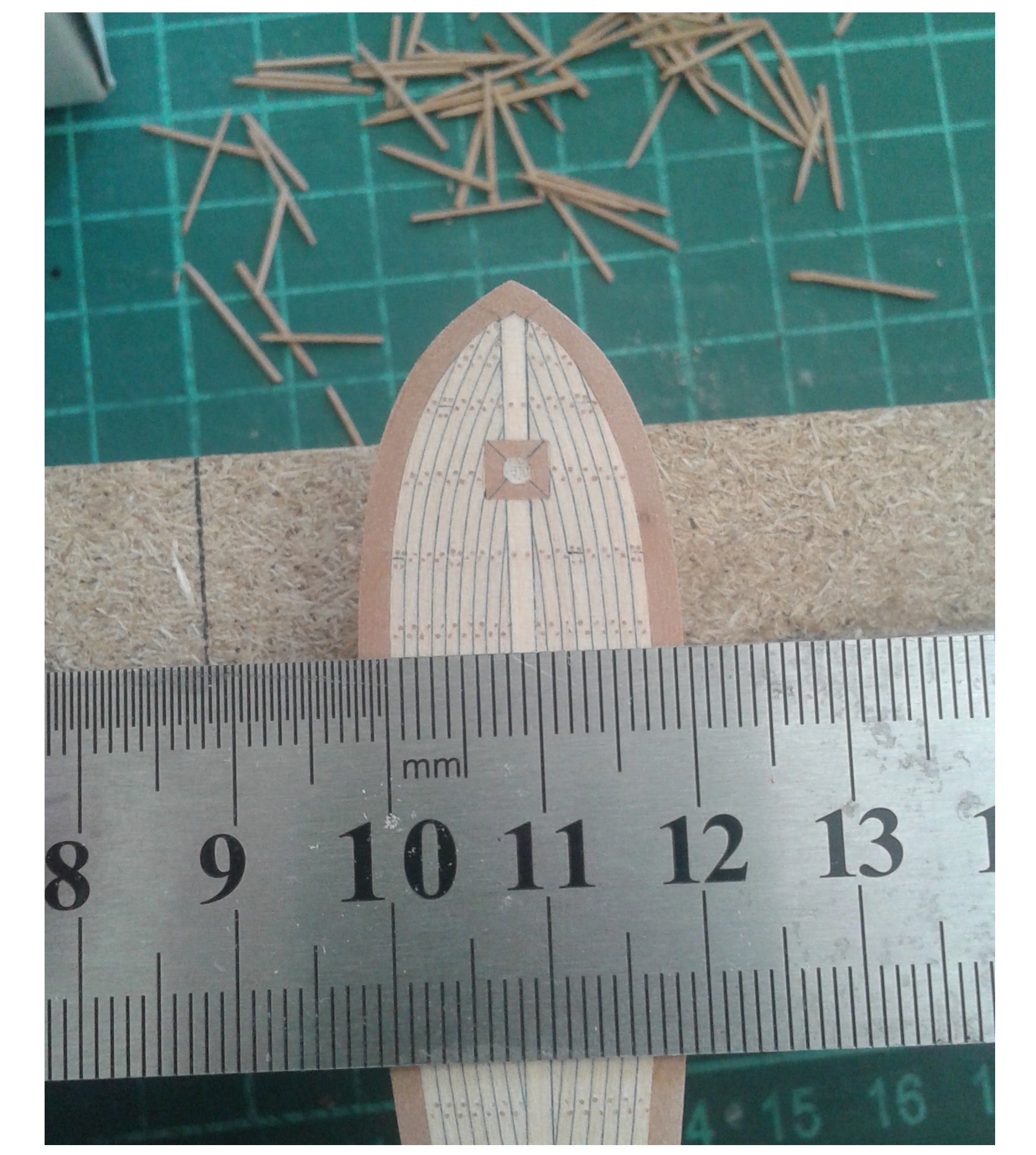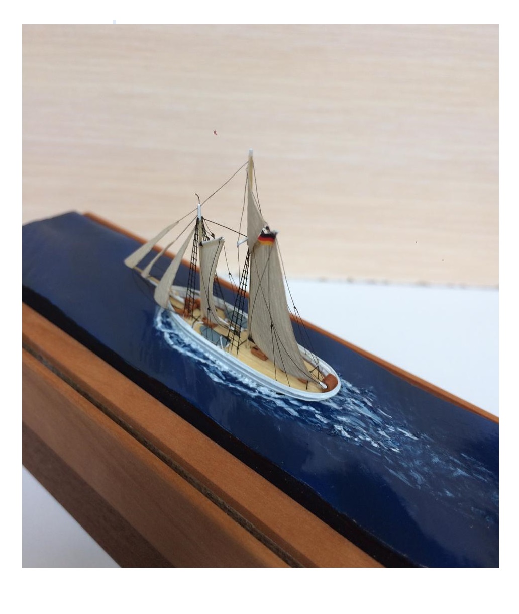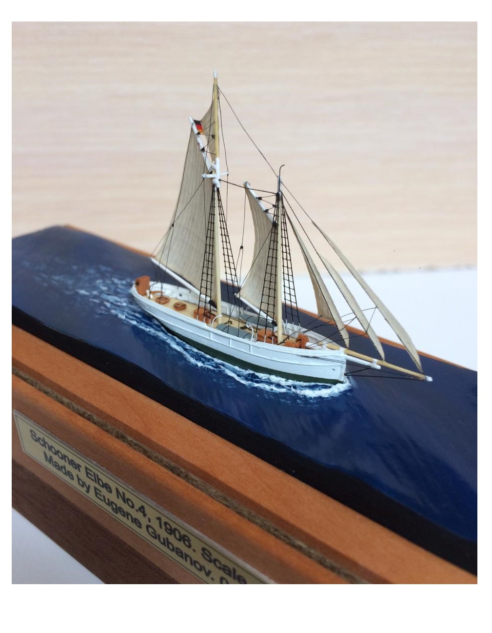 Масштаб 1:192. Судно довольно маленькое, порядка 15 метров. Длинна по палубе около 7,5 см. Черновой корпус из липы, палуба наборная - светлый граб и розовая груша. Доски шириной 1мм, гнул в кондукторе по линии борта и собирал в пакет отдельно правую и левую по диаметральной плоскости, далее все на черновой корпус. Ватервейсы из розовой груши, тоже цельногнутые, распаривал и гнул поэтапно до получения необходимого изгиба. Конопатка между досок - тонкая черная бумага. После сборки палубе придал погиб и подправил седловатость, отцикливал.