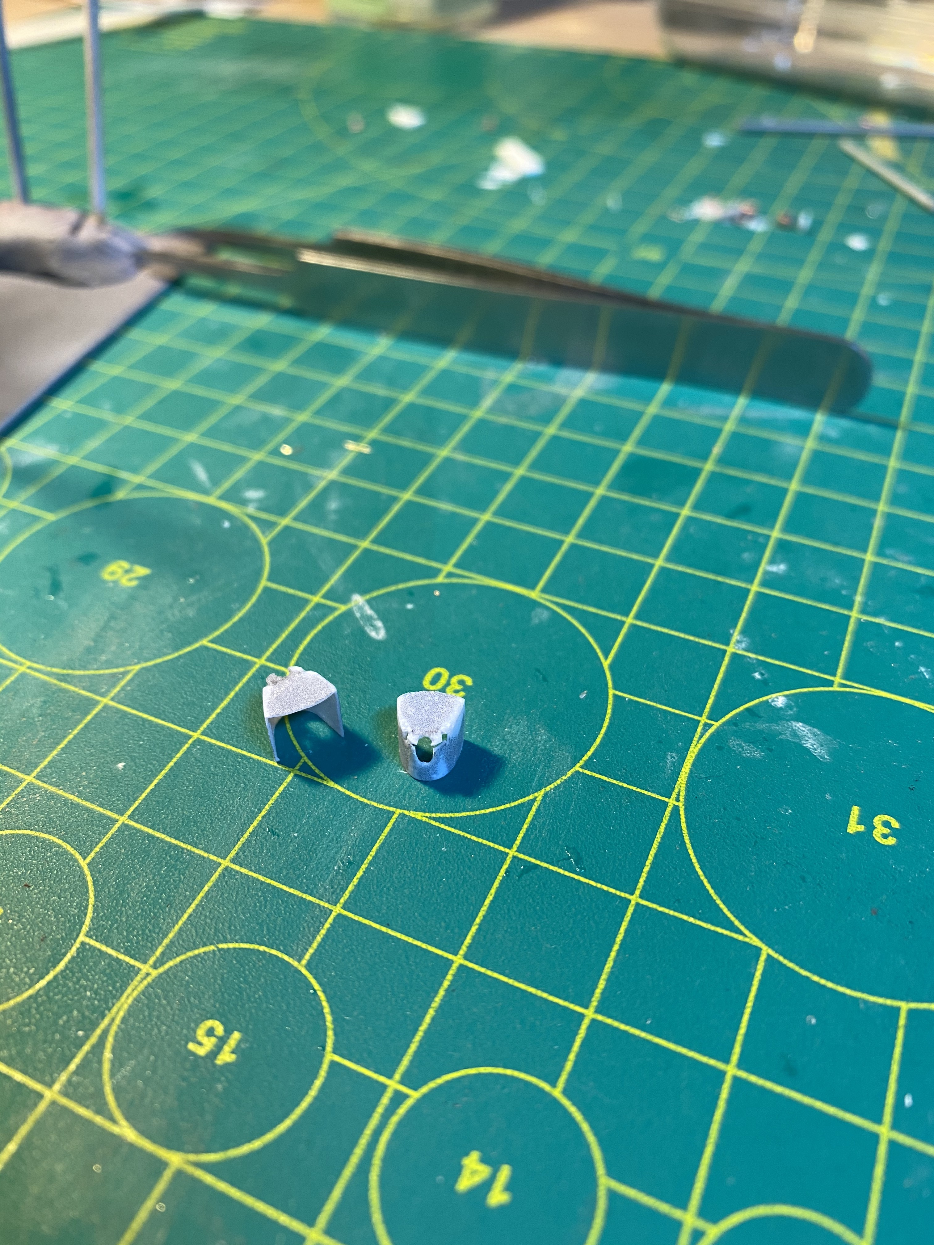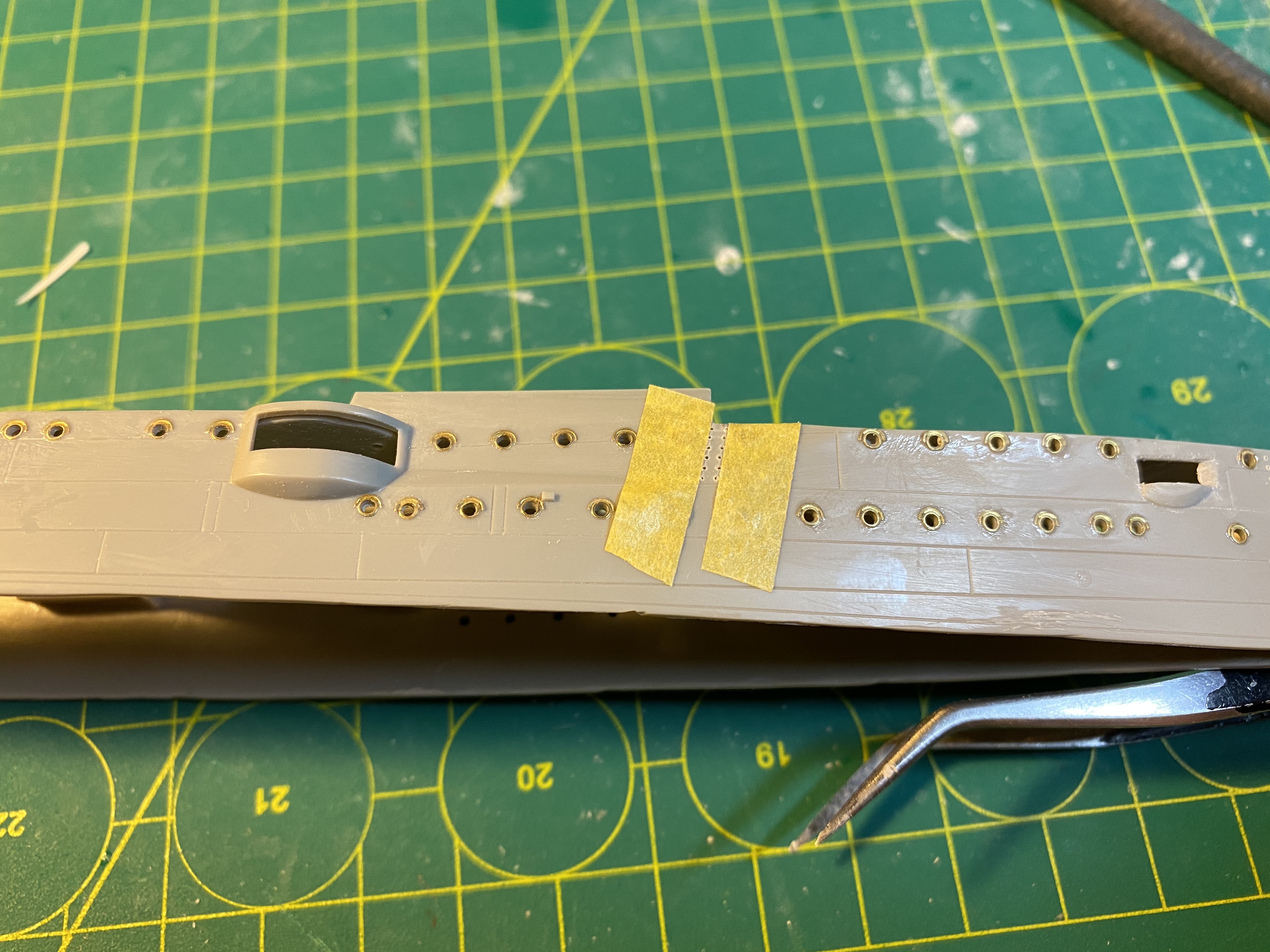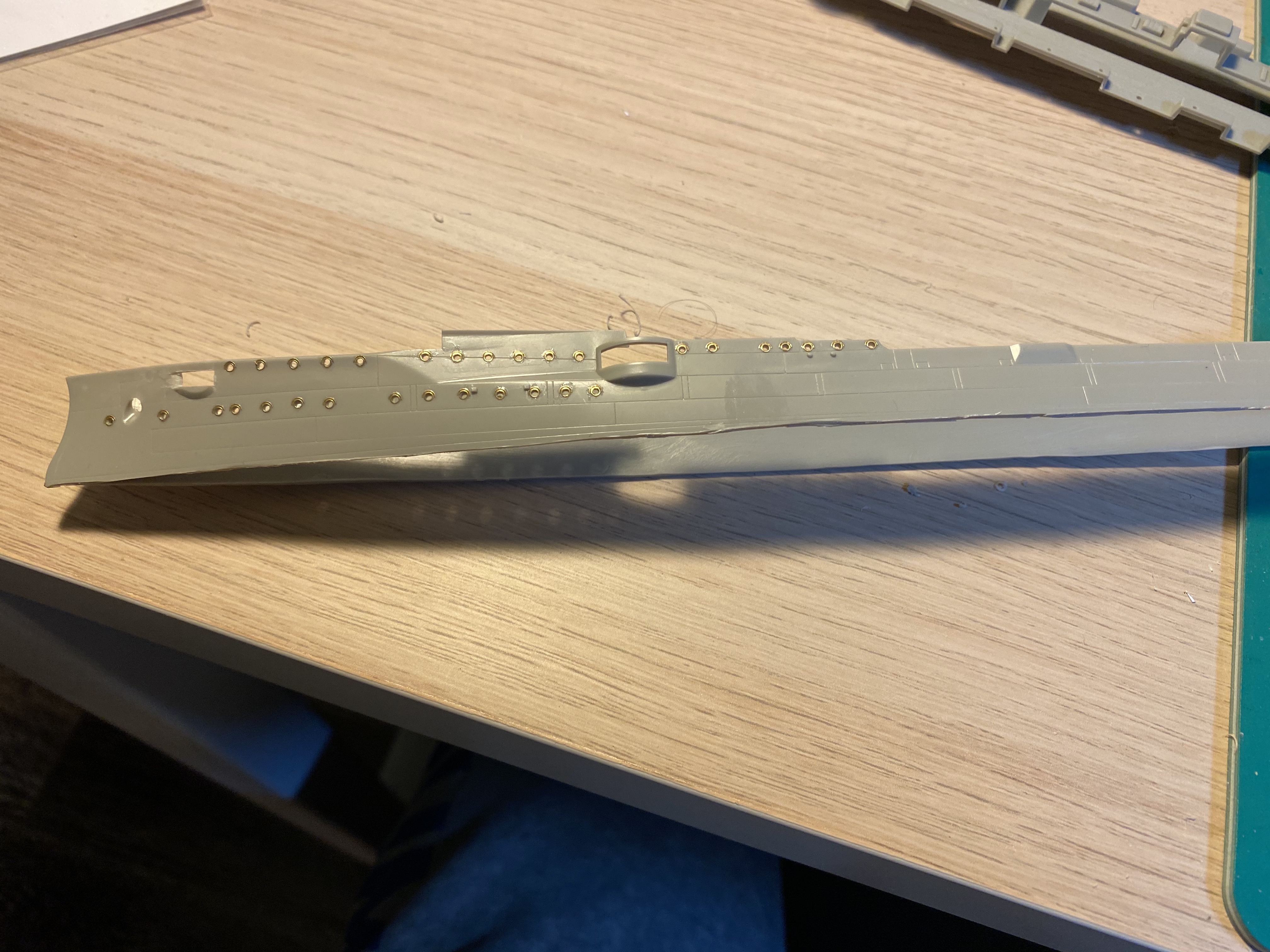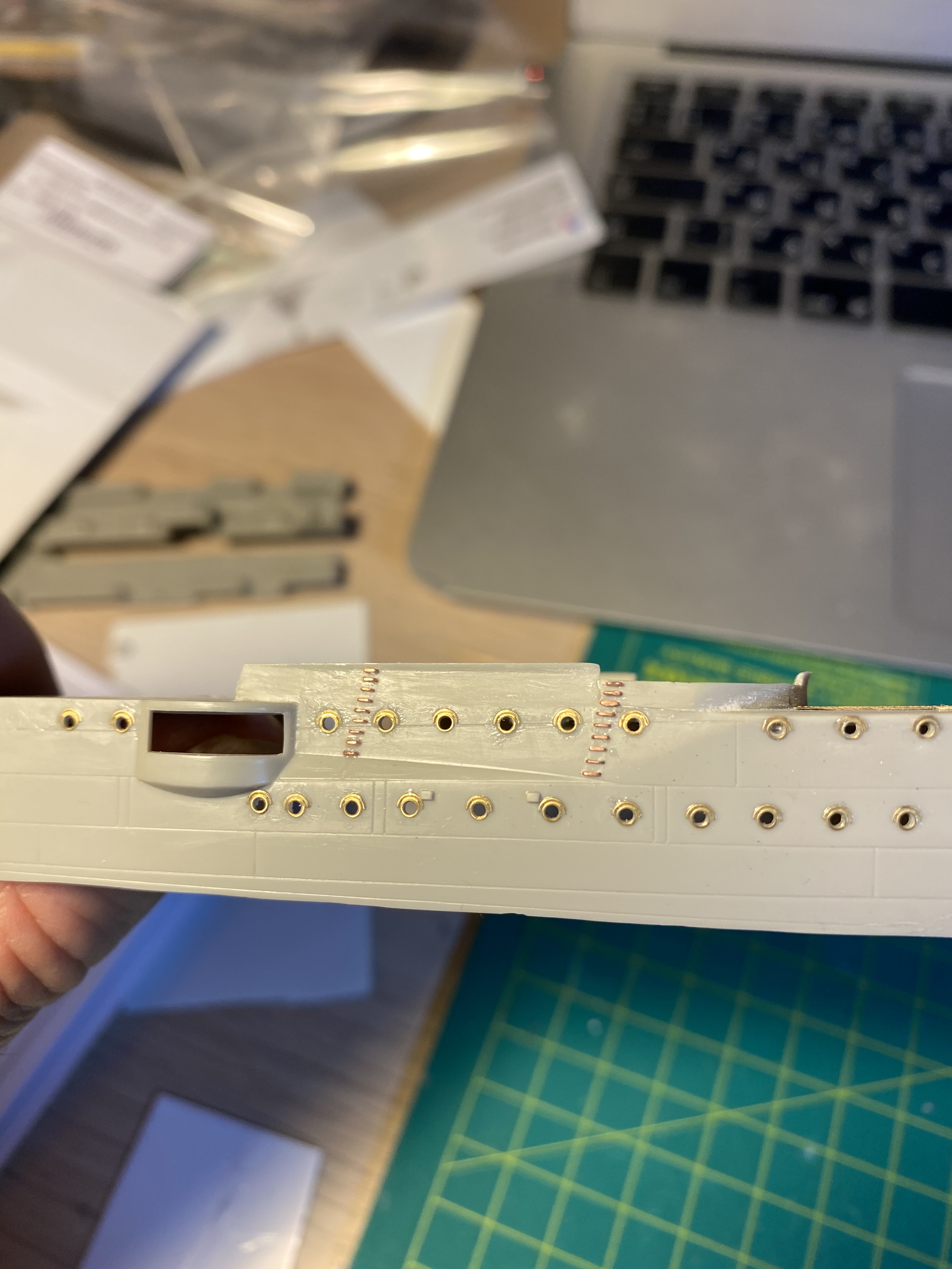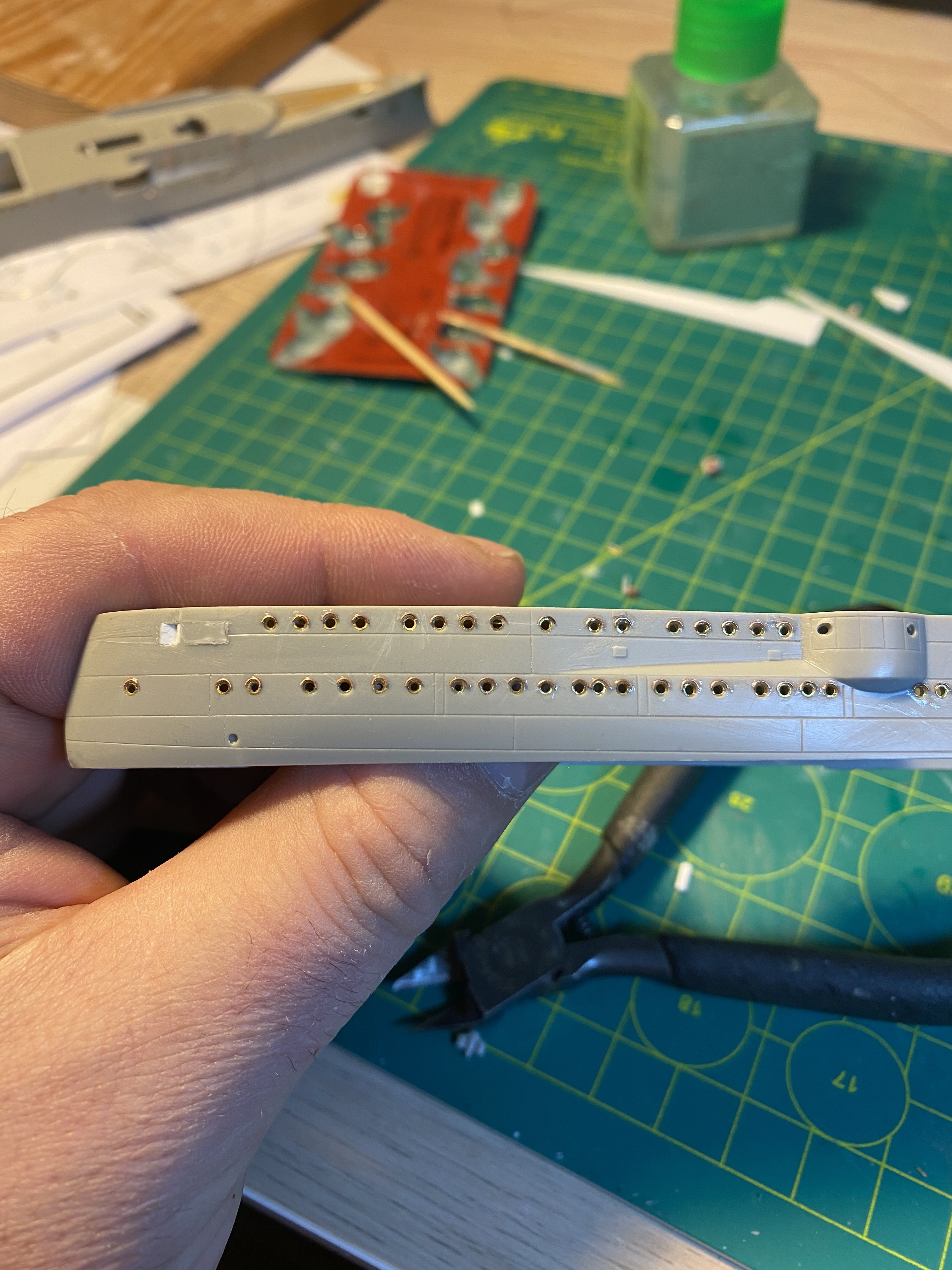 Насверлил дырок для скобтрапов на Эмдене, сделал их из проволоки, на Дрездене, судя по фото скобтрапов снаружи на корпусе не было.