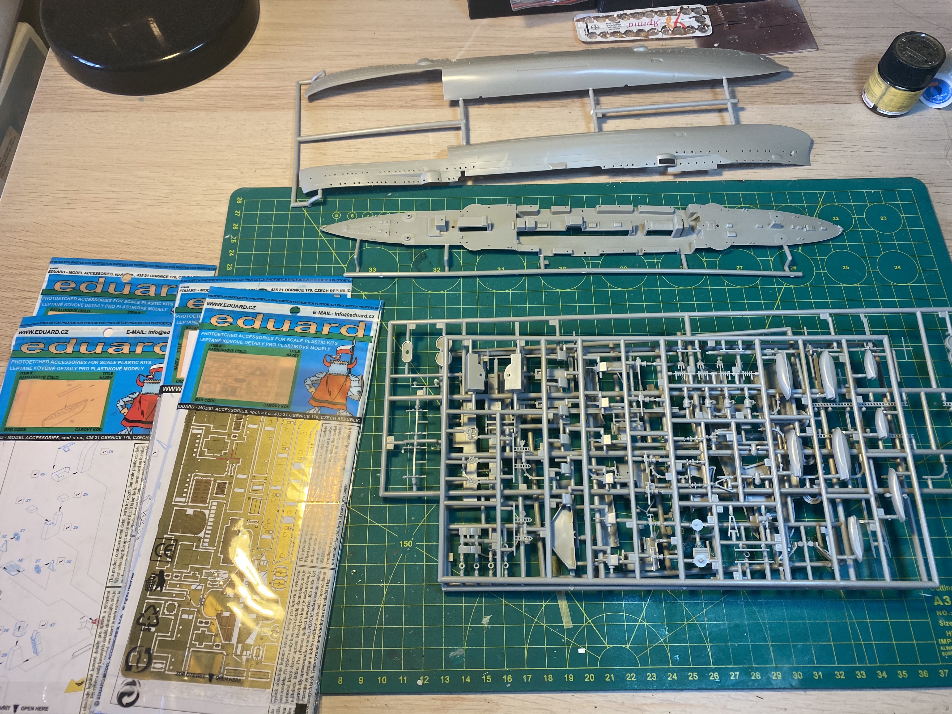 Использую два набора фототравления от Eduard для этой модели, рассмотрел их не очень внимательно, оценю в процессе. Много деталей из закромов, травления от North Star Models и не только, ЗИПовские орудия, Варяг от Звезды - как донор шлюпок.