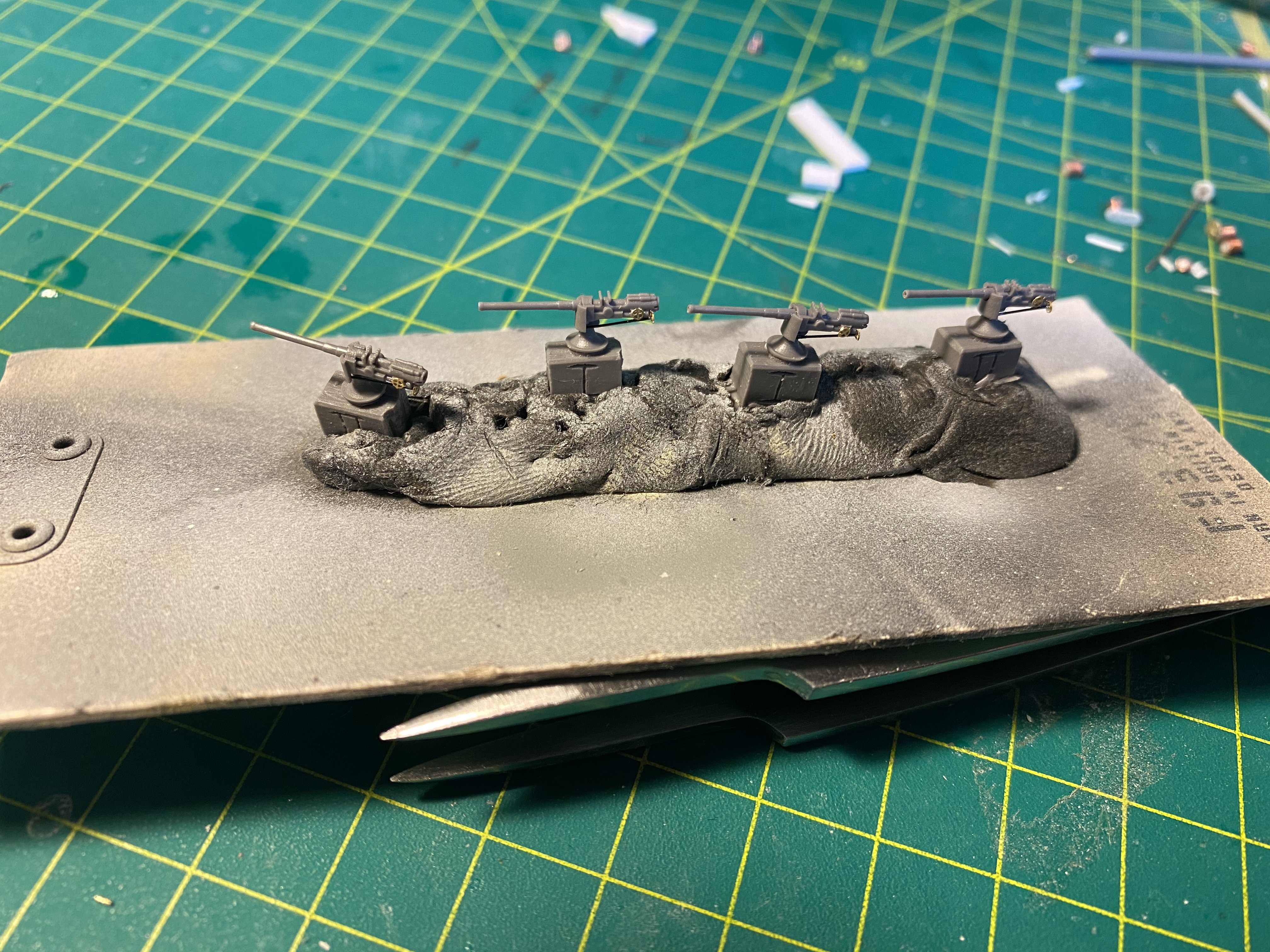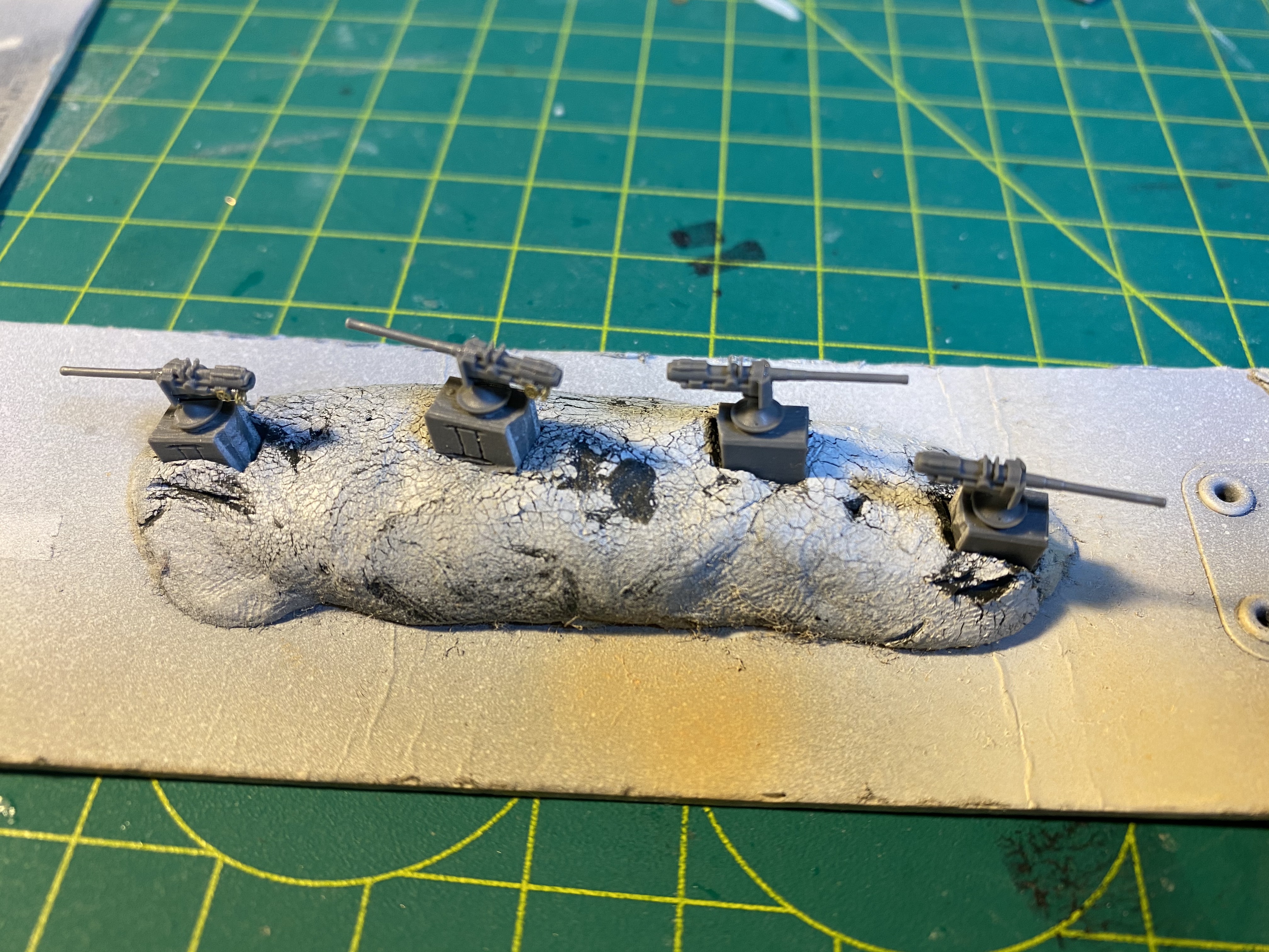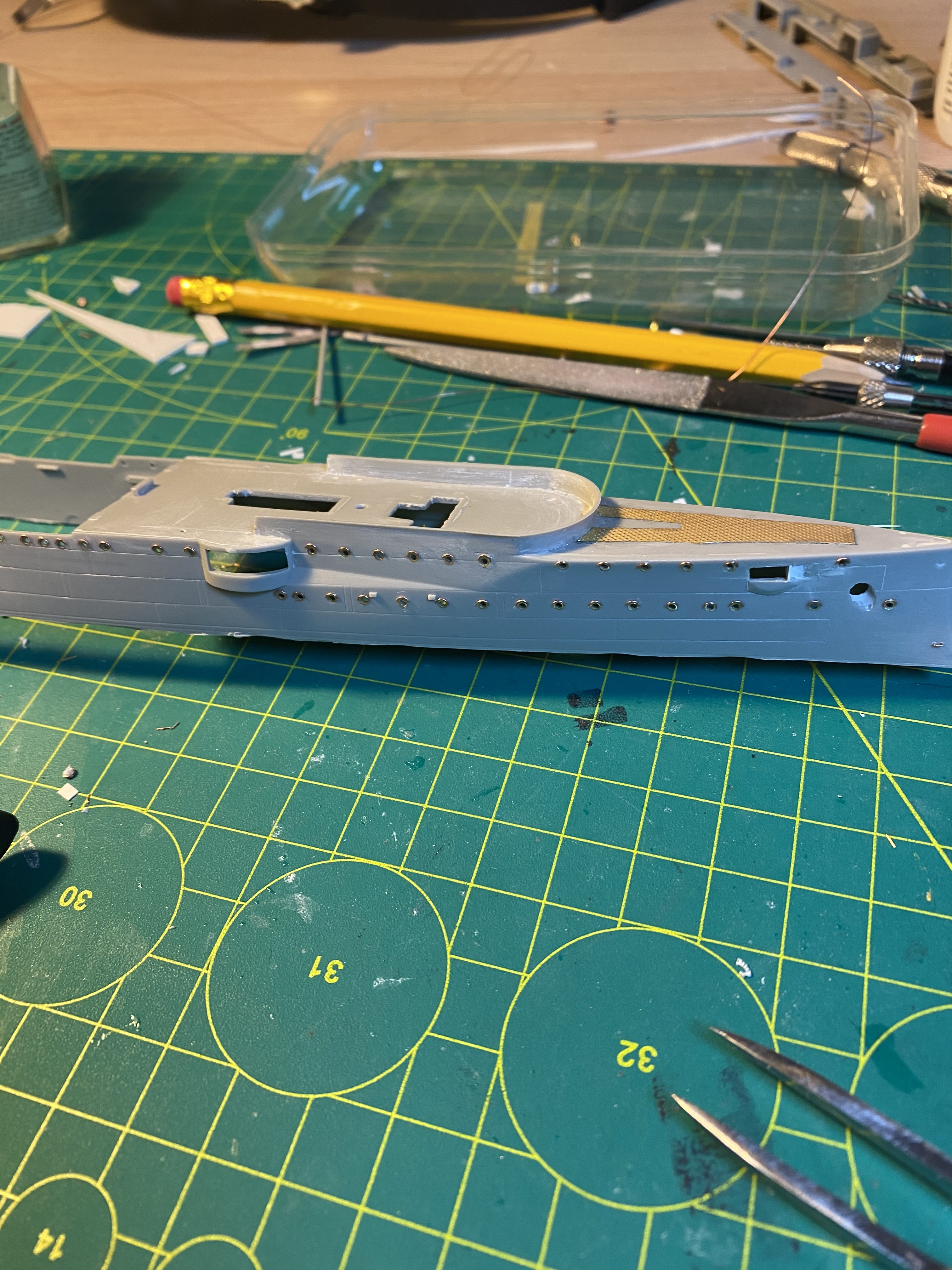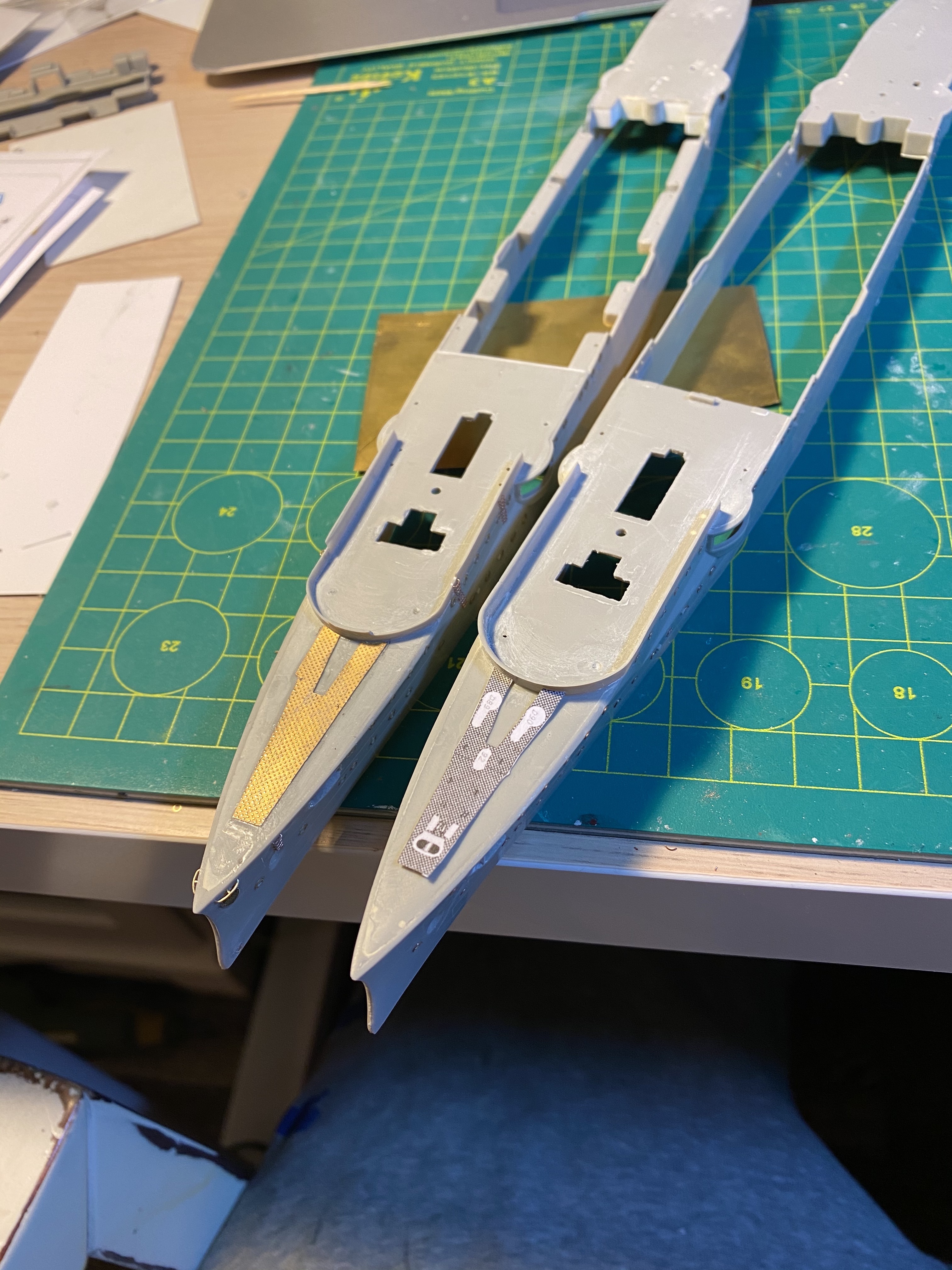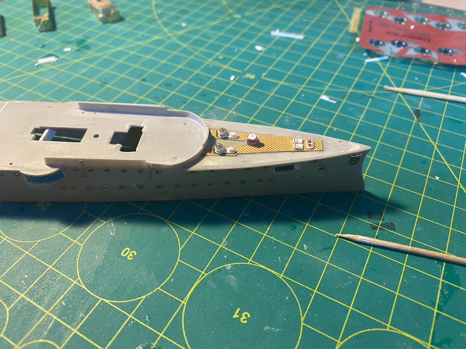 Все якорное хозяйство, на фордеке под нож, там было рифленое железо. Сделал выкройки из бумаги ( масштабировал в 1/350 из картонной модели) перевел на фототравленную "рифленку".