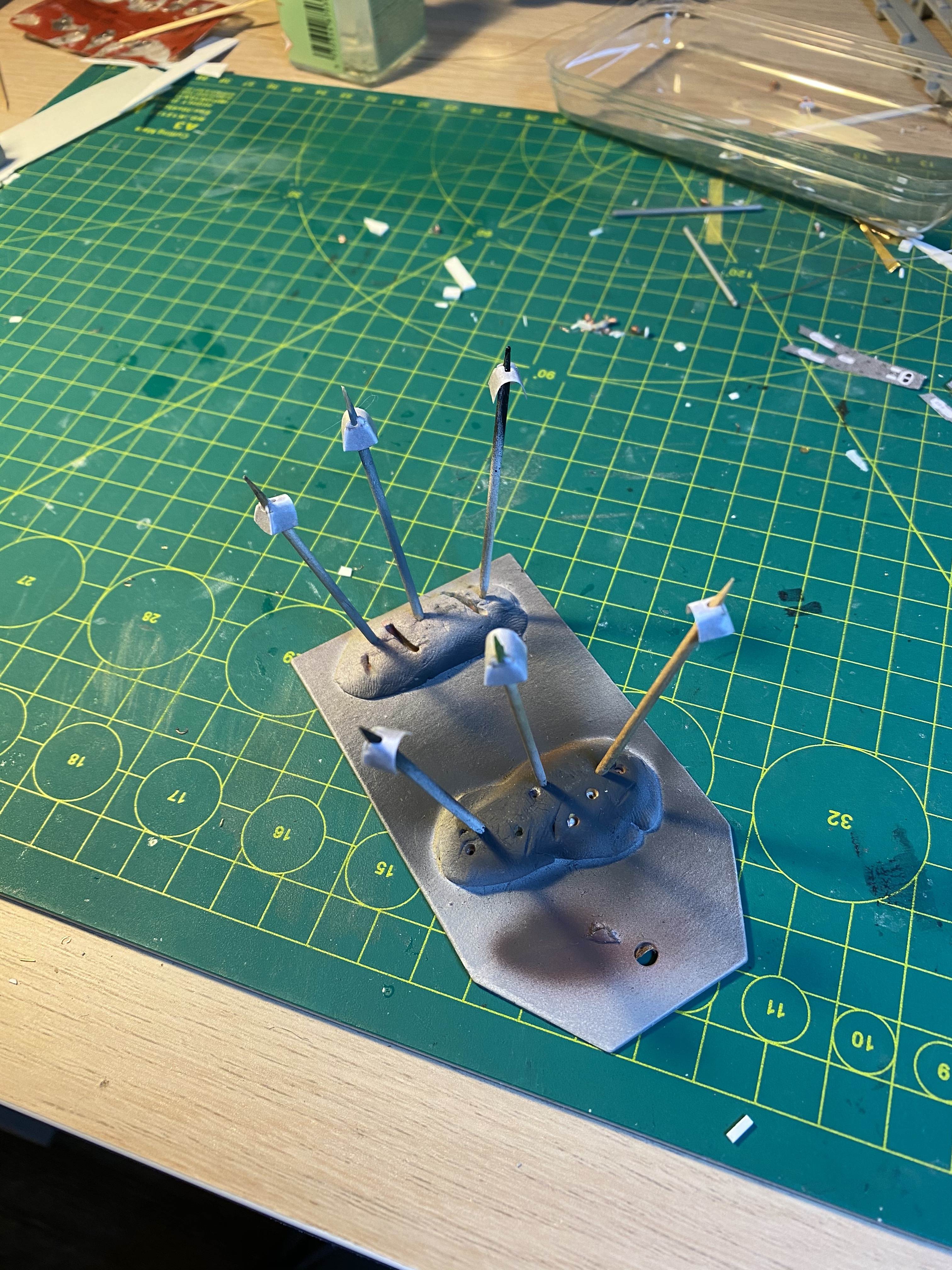 Щиты сделал из бумаги (опять масштабировал в 1/350 из картонной модели) и пропитал жидким цианокрилатным клеем.