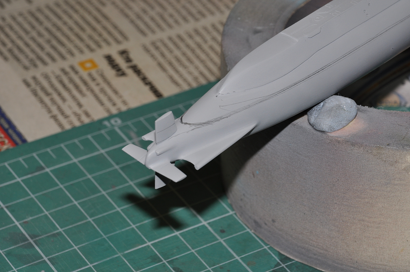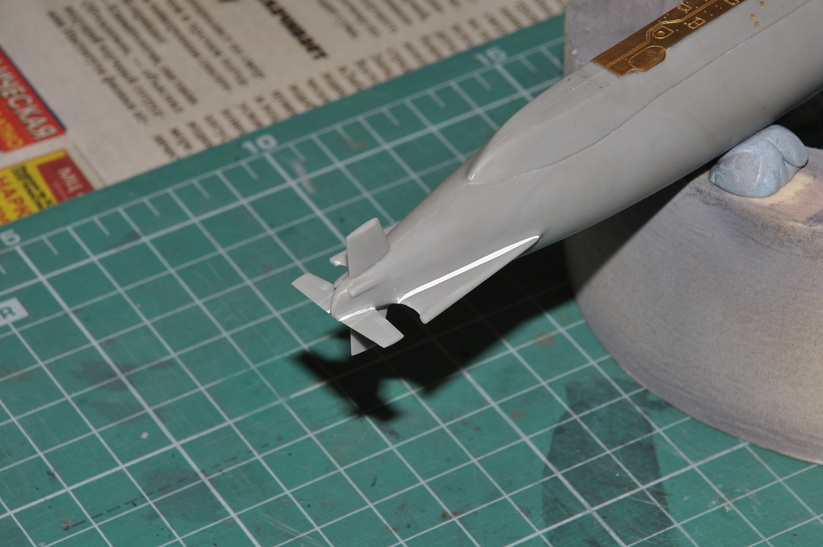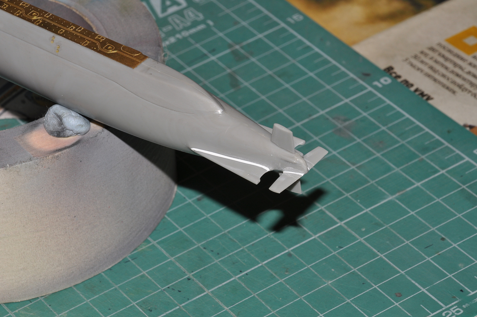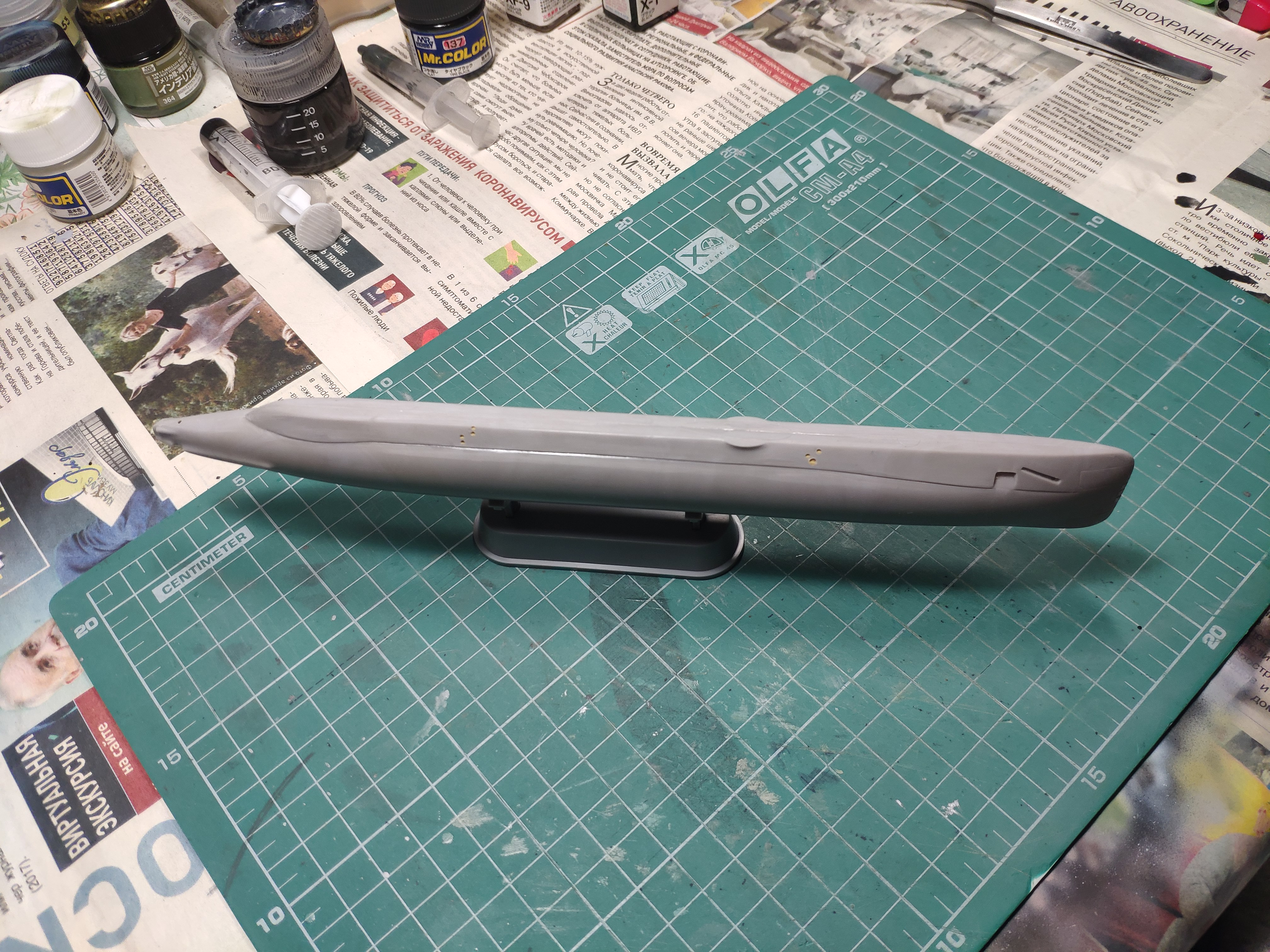 Итак, продолжаю. Победил таки узел соединения обтекателей гребных винтов с корпусом. Все вывел, щелей нет. Загрунтовал