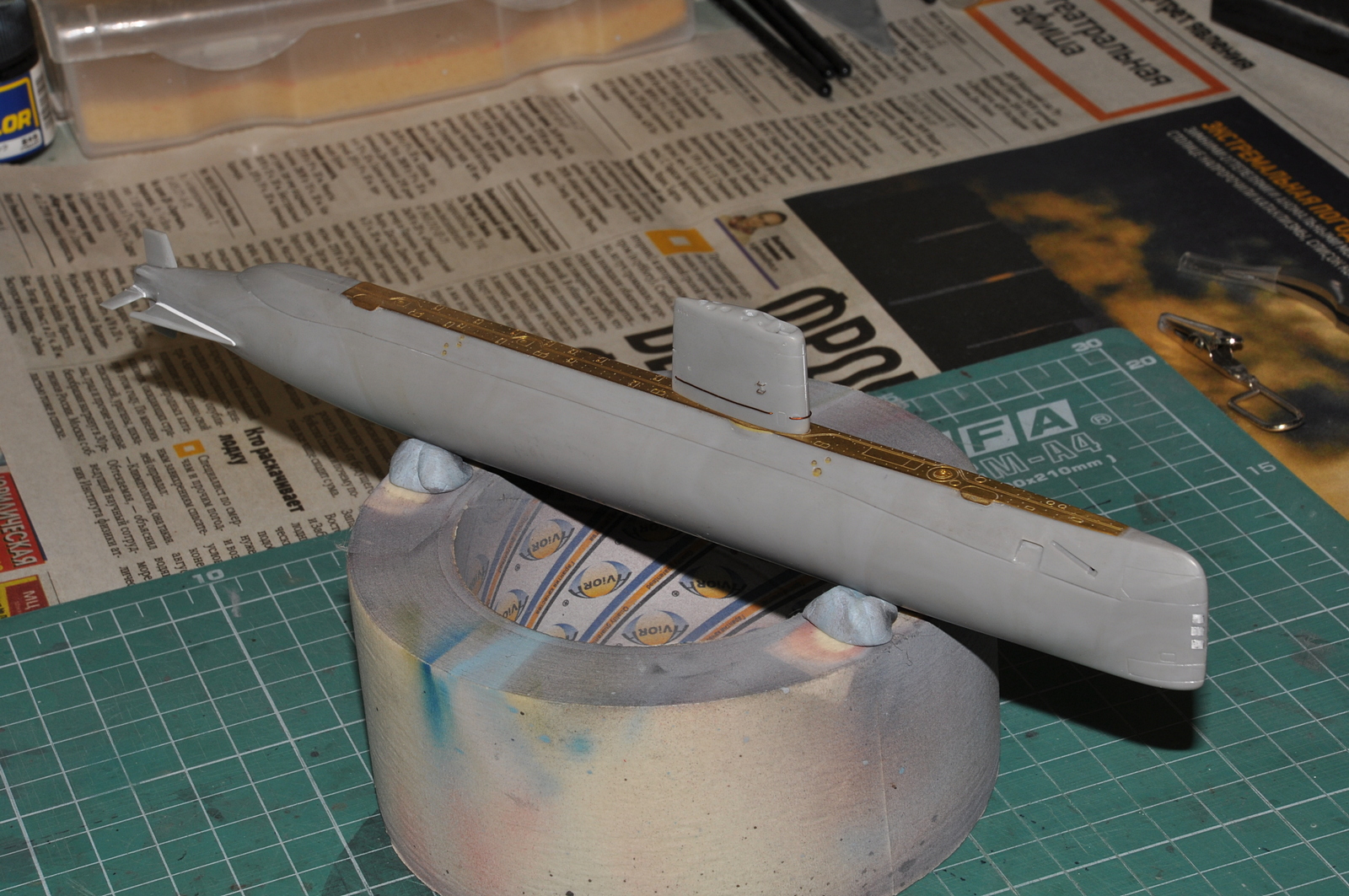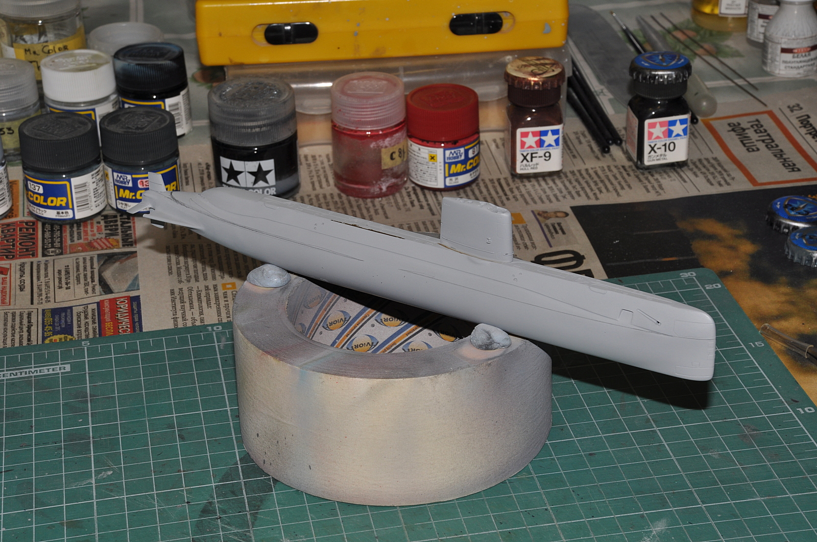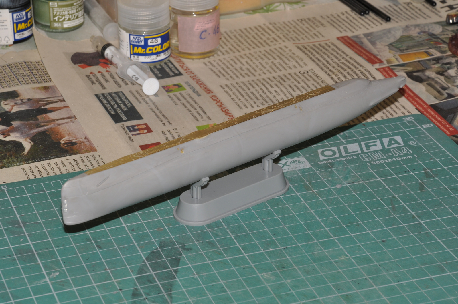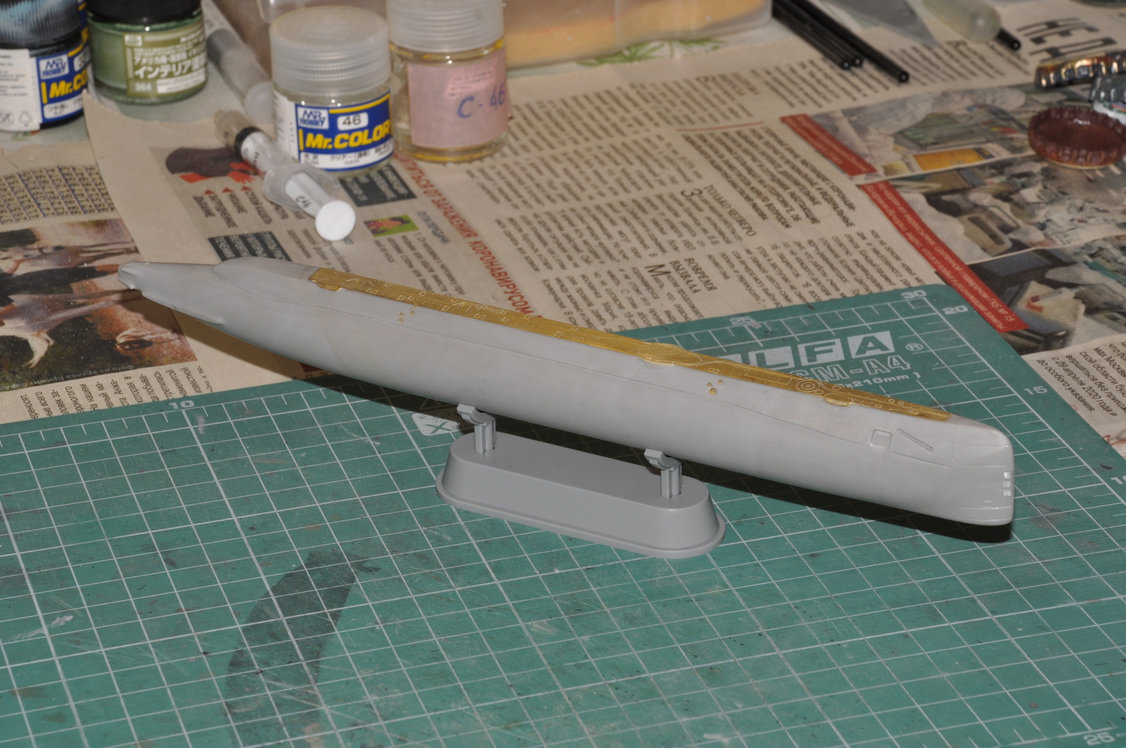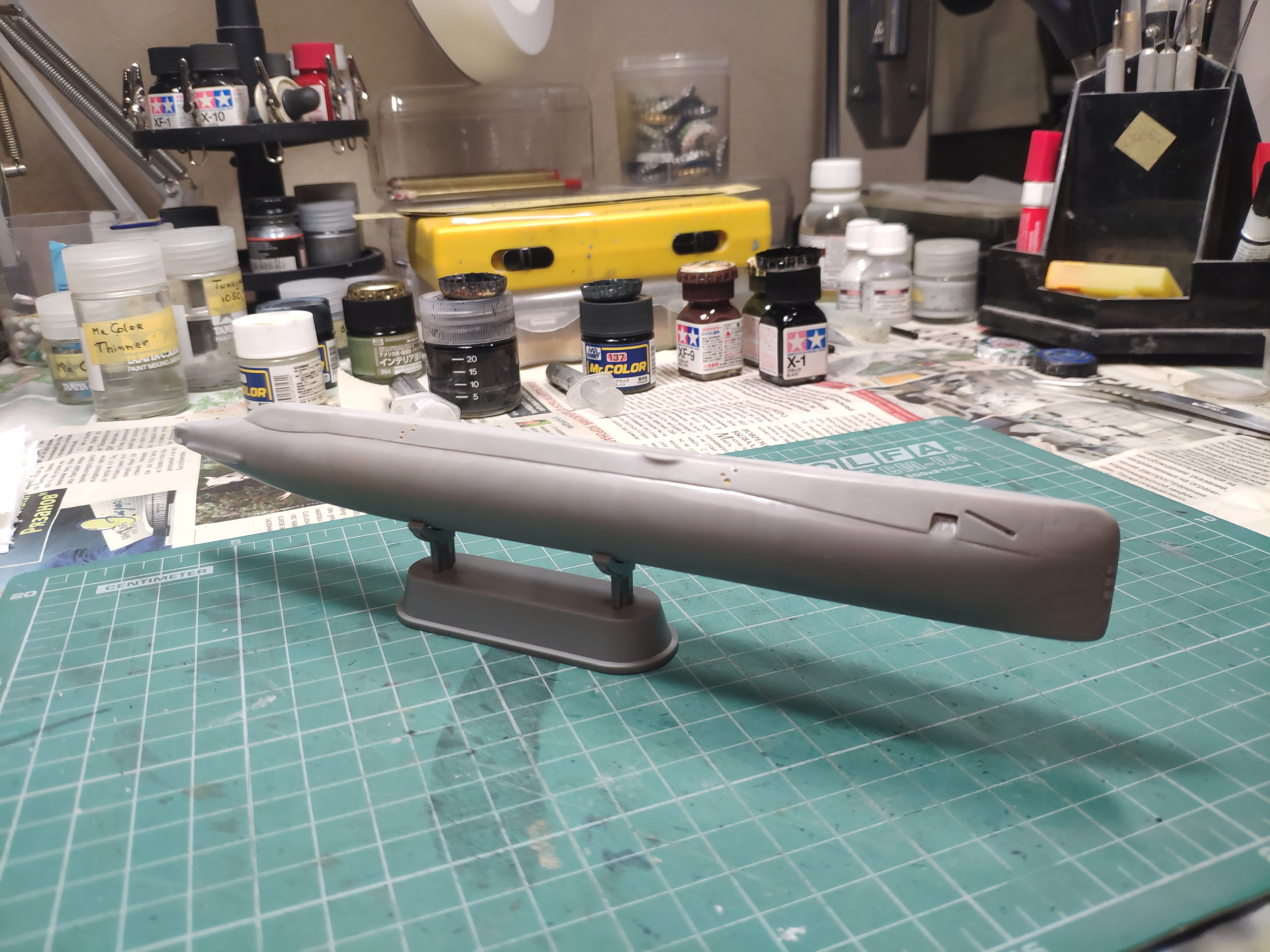 Итак, продолжаю. Победил таки узел соединения обтекателей гребных винтов с корпусом. Все вывел, щелей нет. Загрунтовал
