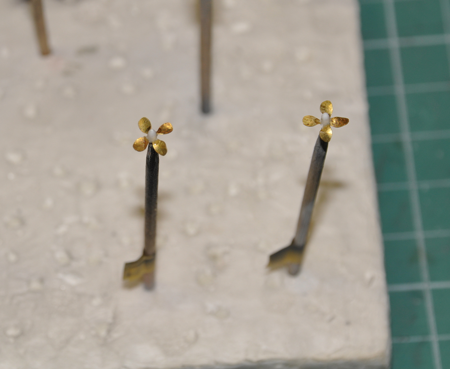 Продолжаю воевать с Микромиром. Выточил из прутка 1,0 мм новые ступицы винтов. Так же как и у "Наутилуса" травленые лопасти отделил от ступицы и по одной приклеил на новые, предварительно изогнув их как у прототипа.