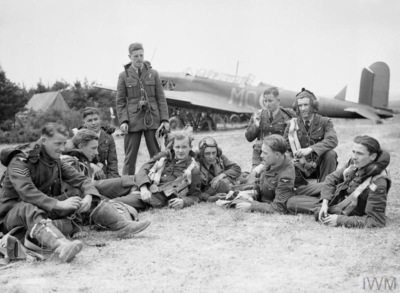 Экипажи легких бомбардировщиков "Battle" из состава 226-й эскадрильи RAF после перебазирования из Реймса, аэродром Фо-Вильсерф, Франция, май 1940 года.