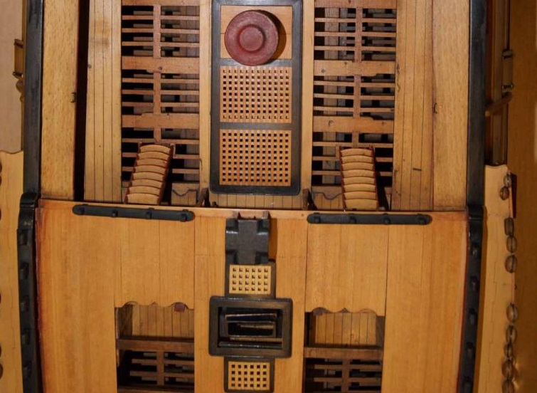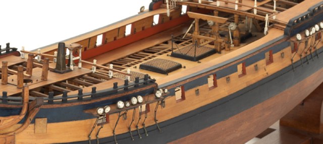 2. Дуб. Не забываем - на этой модели 1758 года на детали нанесена соответствующая краска, есть, например, имитация сурика там, где он должен быть (силовые элементы), минеральная охра (тоже по местам) и тд. Это не просто модель, это модель самого сэра Томаса Слейда для предъявления Тайному Совету Адмиралтейства, в период, когда Томас Слэйд буквально совершал революцию в английском кораблестроении.