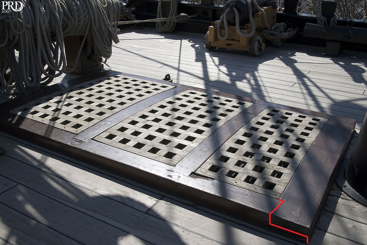 Поперечные ДП детали комингсов (3) имели погибь, и рустерная решётка тоже имела соответствующую погибь. В непогоду люки укрывались просмоленной парусиной, и погибь способствовала быстрому стеканию воды с люка. В отличии от погиби, седловатость на люках отсутствовала. Леждесы решётки (4), соответственно, имели погибь, а продольные маленькие планки (карлингсы решётки 5) были простыми брусками.