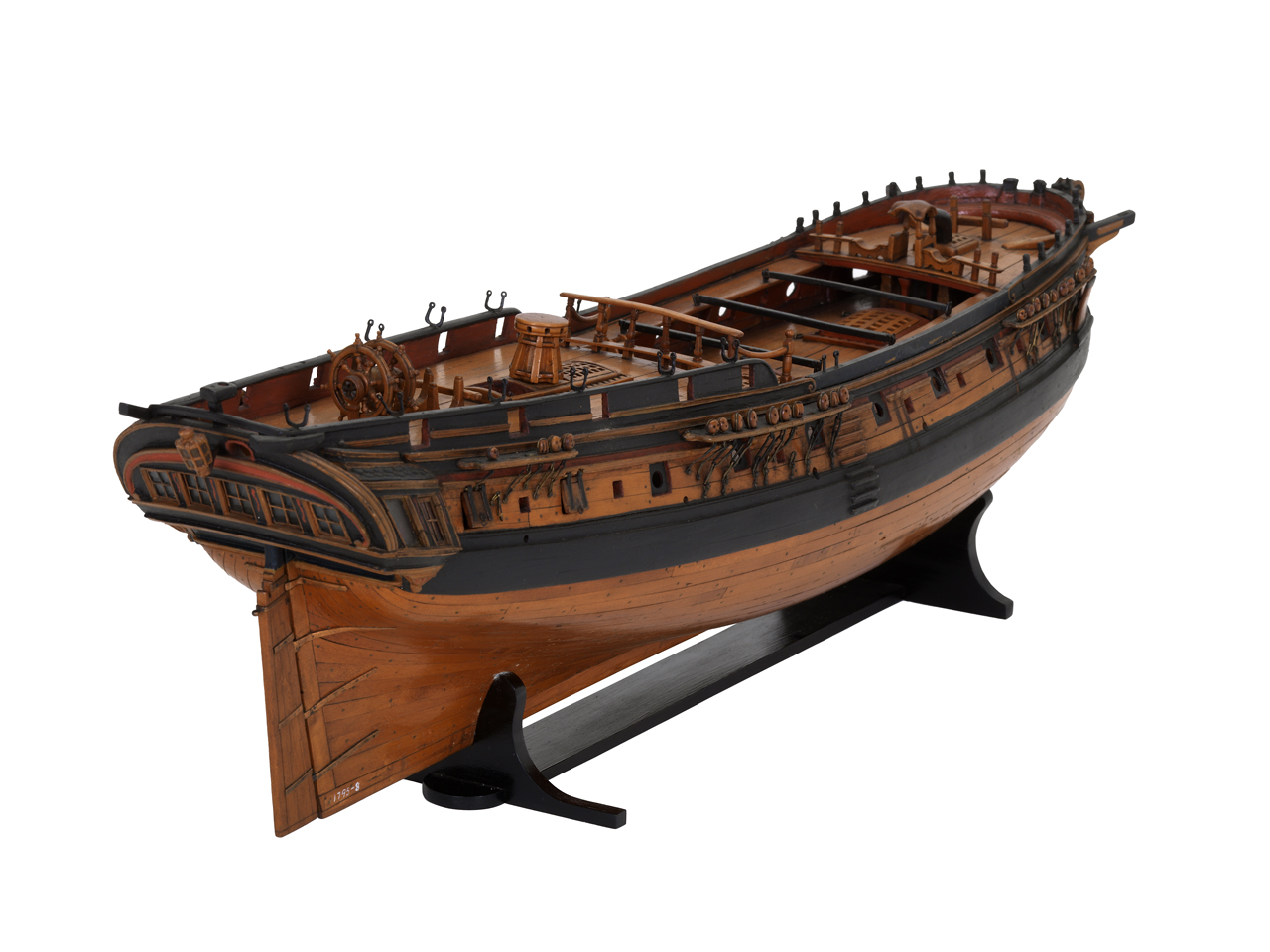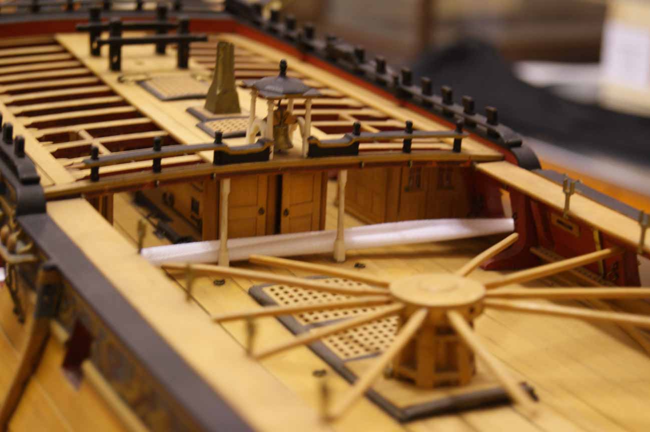 Тут такое интересное дело... На большинстве кораблей шестого ранга штурвальные колёса отсутствовали вовсе: использовались тали для управления открытым румпелем. Вот так выглядели большинство кораблей шестого ранга, то есть, шлюпы и им подобные (на модели утерян румпель, но вы видите оголовок руддера и соответствующее отверстие в нём):