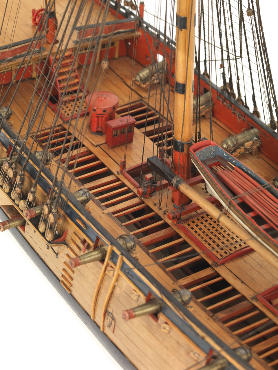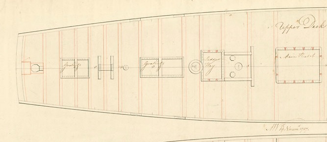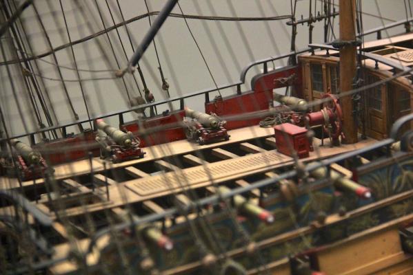 А могло быть такое, что был сокращён откат у второго ряда пушек (те, что ближе к корме)? Например, при помощи укорачивания брюка? Я так понимаю, что пушки были не столько для боевых действий, сколько для подачи звуковых сигналов при входе в порт и т.д.(всего то калибр 4 фунта)