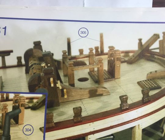 3. Битенги в районе фок-мачты в который упирается бушприт указаны одинаково и у Мак Кея, и на архивных чертежах. В инструкции Артезании указан дополнительный элемент, но похоже это ошибка данной инструкции (фото 9). Вывод - остаются только битенги, в которые упирается бушприт.