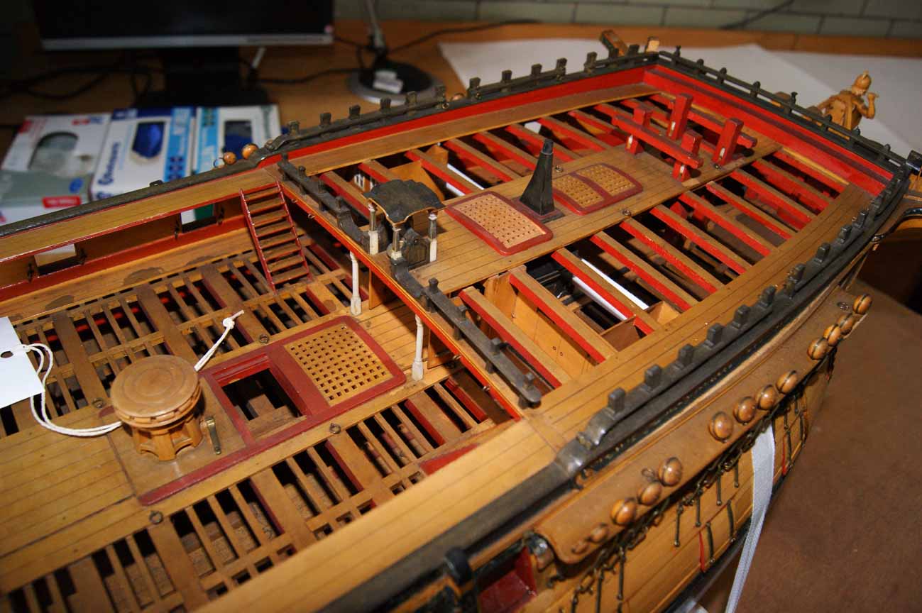 Кстати, вантовые утки на бизань-вантах как раз традиционная английская корабельная архитектура. Просто у ахтердека обычно не делали сплошной фальшборт во избежание паразитной парусности и без того высокой надстройки. Нет фальшборта - нет и кофель-нагельных планок.