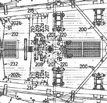 1. Битенги с кофель-нагельными планками в районе бизань-мачты считаю необходимо упразднить, поскольку их нет на архивном чертеже, а также их наличие реально затруднит использование 2-го ряда пушек. К тому же наличие в этом месте кофель-нагельных планок вдоль фальш-бортов решает задачу крепления ходовых концов бегучего такелажа (на чертеже есть свободные места).