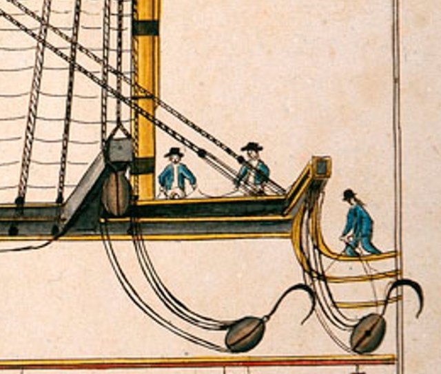 Якорь висит только на якорном канате, значит, он висит прямо под клюзом и буквально касается борта. Нам нужно взять якорь на кат. Но кат-блок на кат-балке находится совсем в другом месте. Чтобы подвести гак кат-блока к рыму якоря, мы будем тянуть его с гальюна с помощью кат-штерта. Ловля якоря гаком кат-блока всегда была опасной и трудной задачей, особенно на больших кораблях, где приходилось использовать ручной труд буквально на месте стыковки гака с рымом.