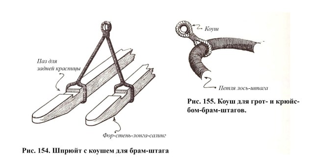 Теперь мы не цепляем что-то к снасти, а, наоборот, снасть цепляем к чему-то. Опять у нас есть нагрузка, опять у нас есть условие - необходимость легкого снятия. Например, бакштаги, элементы стоячего такелажа бушприта, будут иметь такие коуши с гаками. Так как они заводились на участок борта, подверженного воздействию препятствий, эти бакштаги должны были быть легкосъёмными.