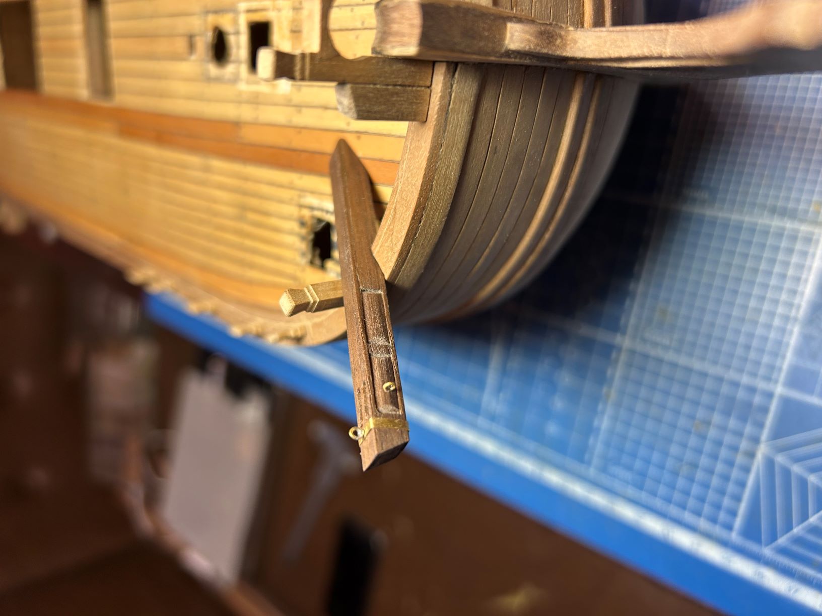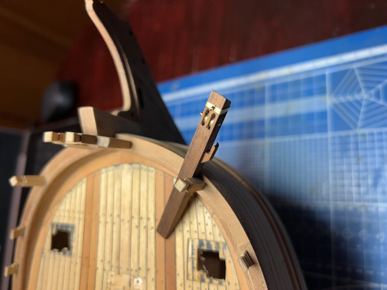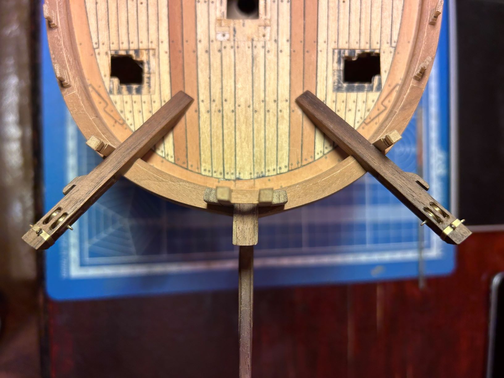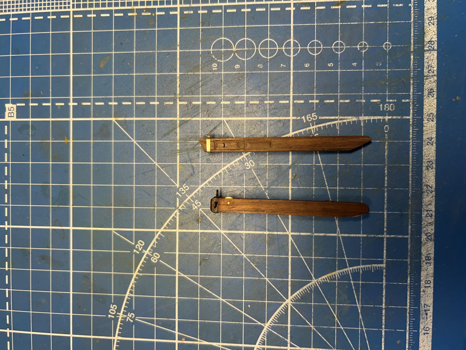Позднее все латунные элементы будут зачернены, та часть кат-балки которая будет находится за бортом будет окрашена в черный, та что внутри - покрыта маслом (затирована). Также на торцах будут декоративные накладки (буду заказывать вместе с декором).