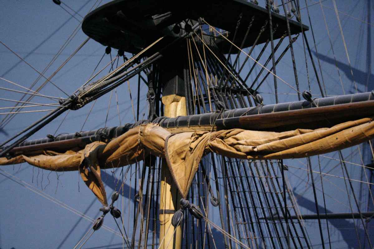 На фото: шкентель мачт-талей, подвязанный к первой ванте: