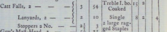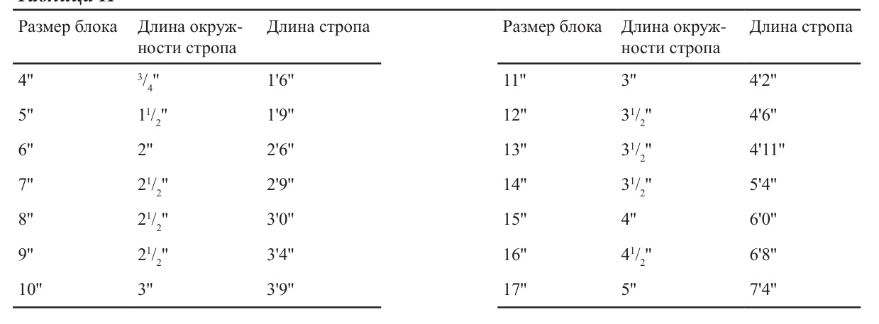 Я тут пробовал разобраться с размером пертулиня по таблице Стила. Ничего не понял. Вот видно, что сам лопарь (ходовой конец) кат-тали имеет размер 3 дюйма, длина 54 дюйма, имеет 3-х шкивный блок с оковкой 15 дюймов в количестве 2-х штук.