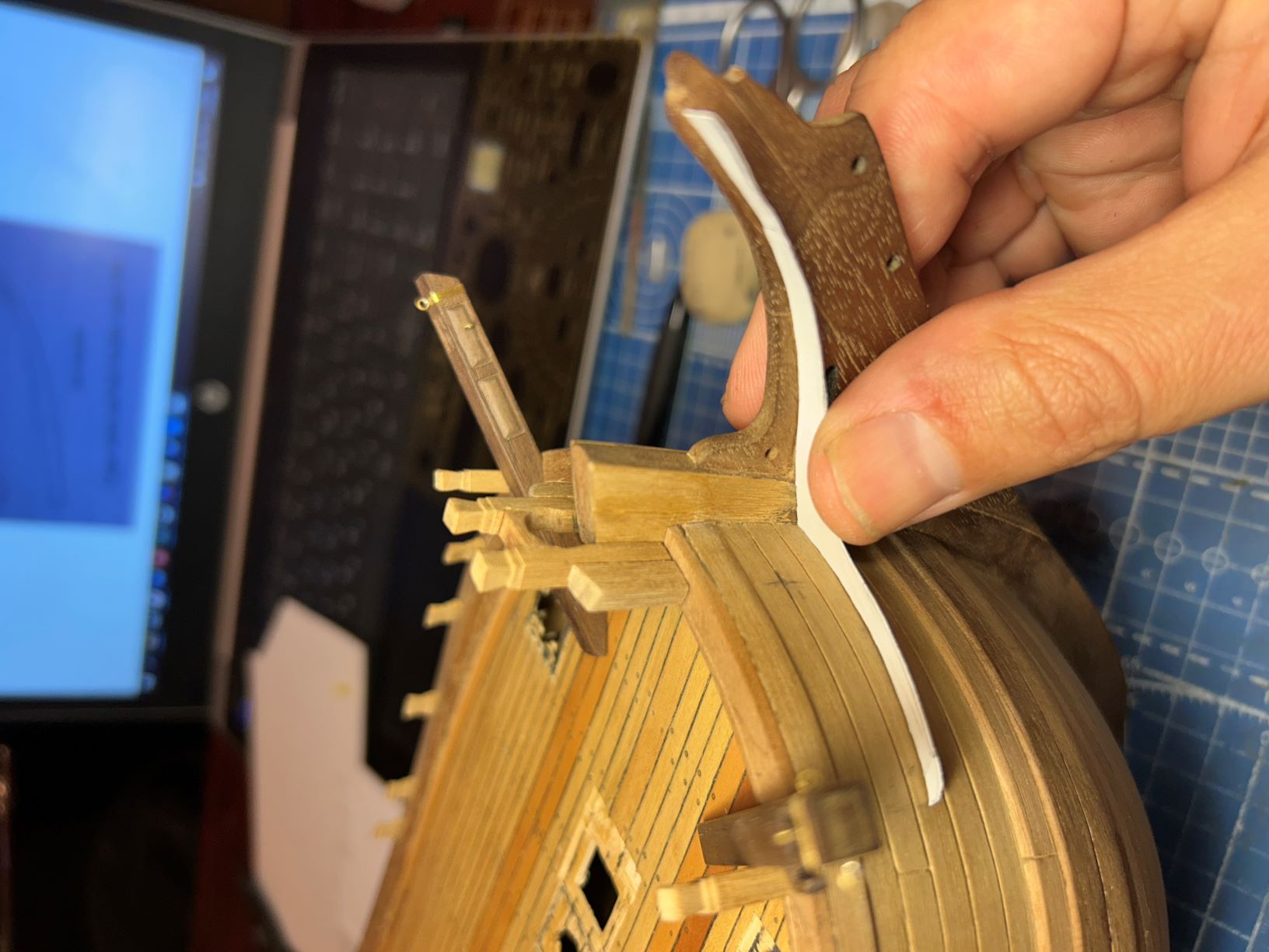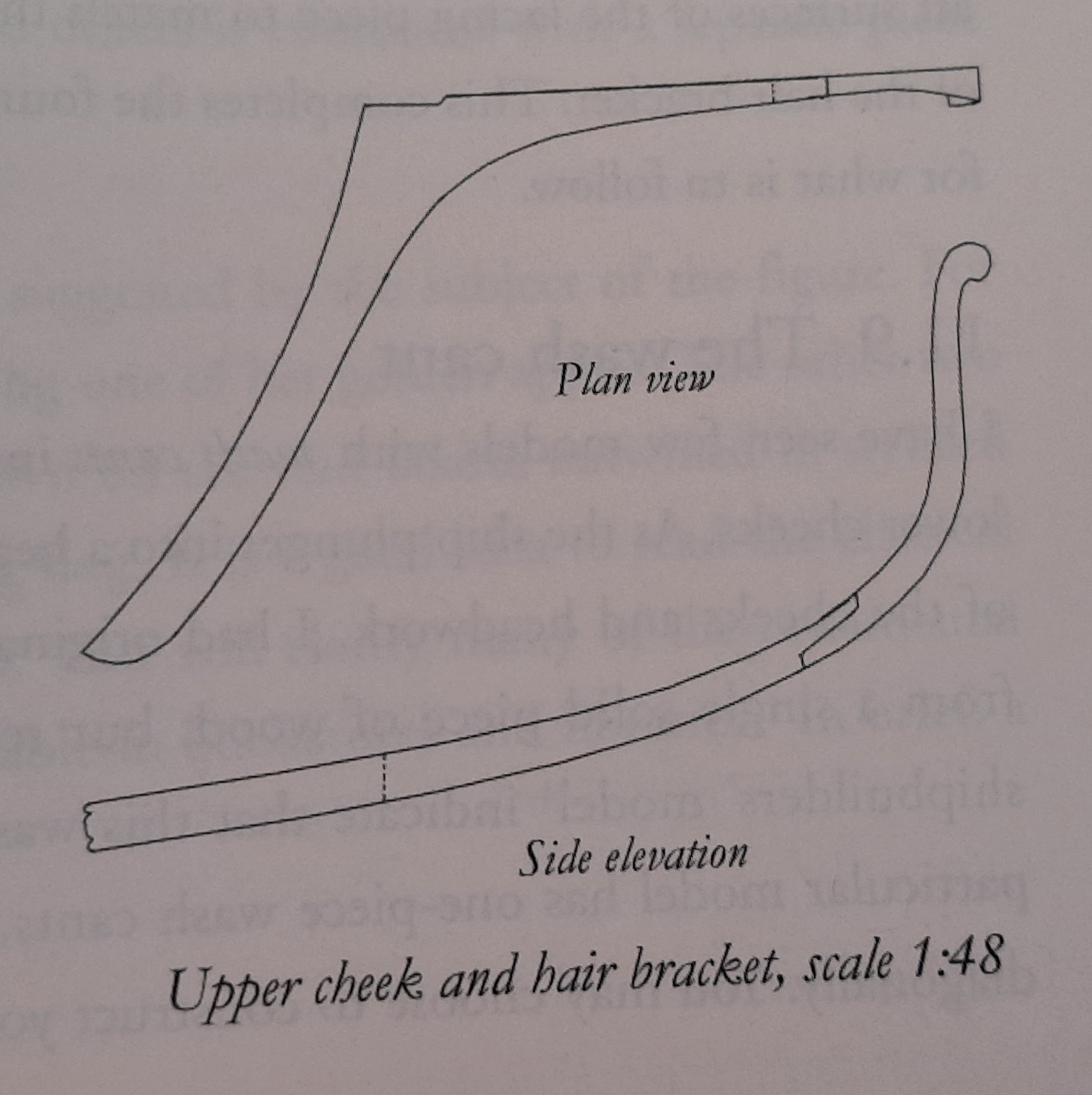 Самая большая проблема - в поперечном сечении чиксы имеют заужение в княвдигед. Поэтому варианта два: либо делать эту деталь методом бутерброда (как Игорь ранее показывал, такой же вариант предлагает Михаил Безверхний) либо пробовать делать это фрезой вручную по торцевой стороне элемента. Пока не определился, буду думать. Первый вариант кажется более технологичным, но общая габаритная толщина чиксы в широкой части составляет всего 5,5 дюймов (3 мм в моём масштабе). Если средняя часть будет 2мм, то на боковые останется по 0,5мм (фактически шпон). И это повторюсь в широкой части, в узкой ситуация ещё хуже. Поэтому технологически я не представляю как можно достичь желаемого результата методом бутерброда.