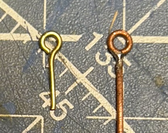 Отдельный вопрос - внешний вид рыма. Раньше я не уделял внимания этой детали пока не посмотрел видео Андрея Кудина. Стало понятно, копийность готовых рымов оставляет желать лучшего - обратите внимание какие большие радиусы при переходе из стержня на окружность. Отдельный касяк - разрыв кольца и стержня с противоположной стороны. В общем недоразумение, а не рым. Решил изготавливать сам и вот совсем другой результат. Изготовляю колечки и далее припаиваю к стержню с использованием паяльной пасты. Очень удобный материал, классическим припоем я думаю так не получится. Для понимания, на кат-балке использовались рымы с внутренним диаметром 0,7-0,8мм.