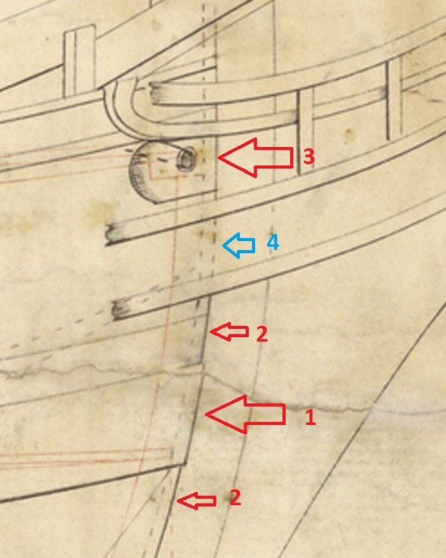 Итак, давай посмотрим на архивные чертежи. Смотрим на линию стыка двух поверхностей обшивки борта и форштевня (малые красные стрелки, позиция 2). Вернёмся к бархоуту (позиция 1) - видишь, он упирается в форштевень? Как мы это узнали, а по линии стыка: мейн-вельс толще обычной обшивки, и мы видим соответствующее преломление линии стыка, ступеньку (поз.1). Поднимемся опять к подклюзовой губе (позиция 3) - здесь линия стыка обшивки с форштевнем не меняется, хотя должна быть немалая ступенька, соответствующая толщине губы.