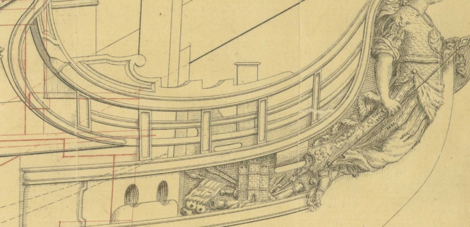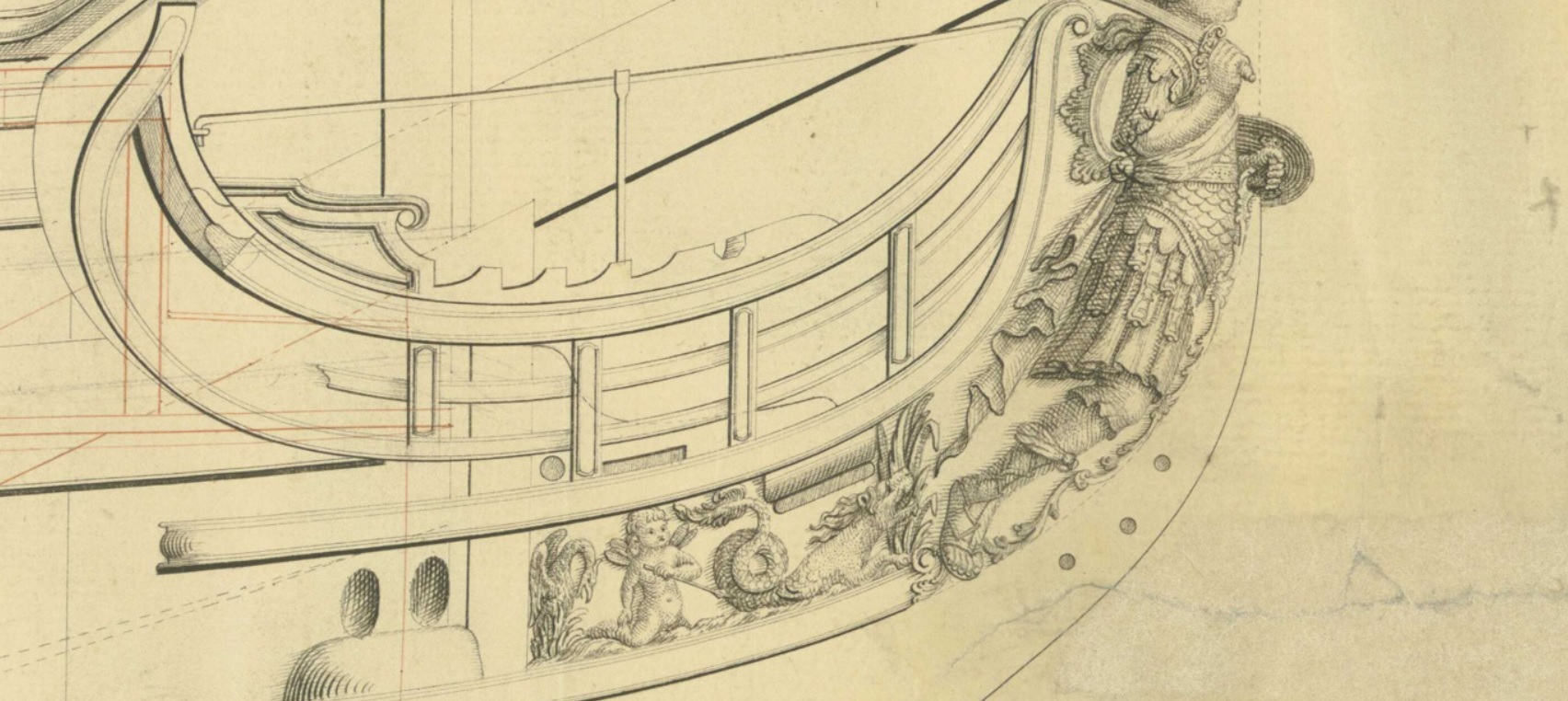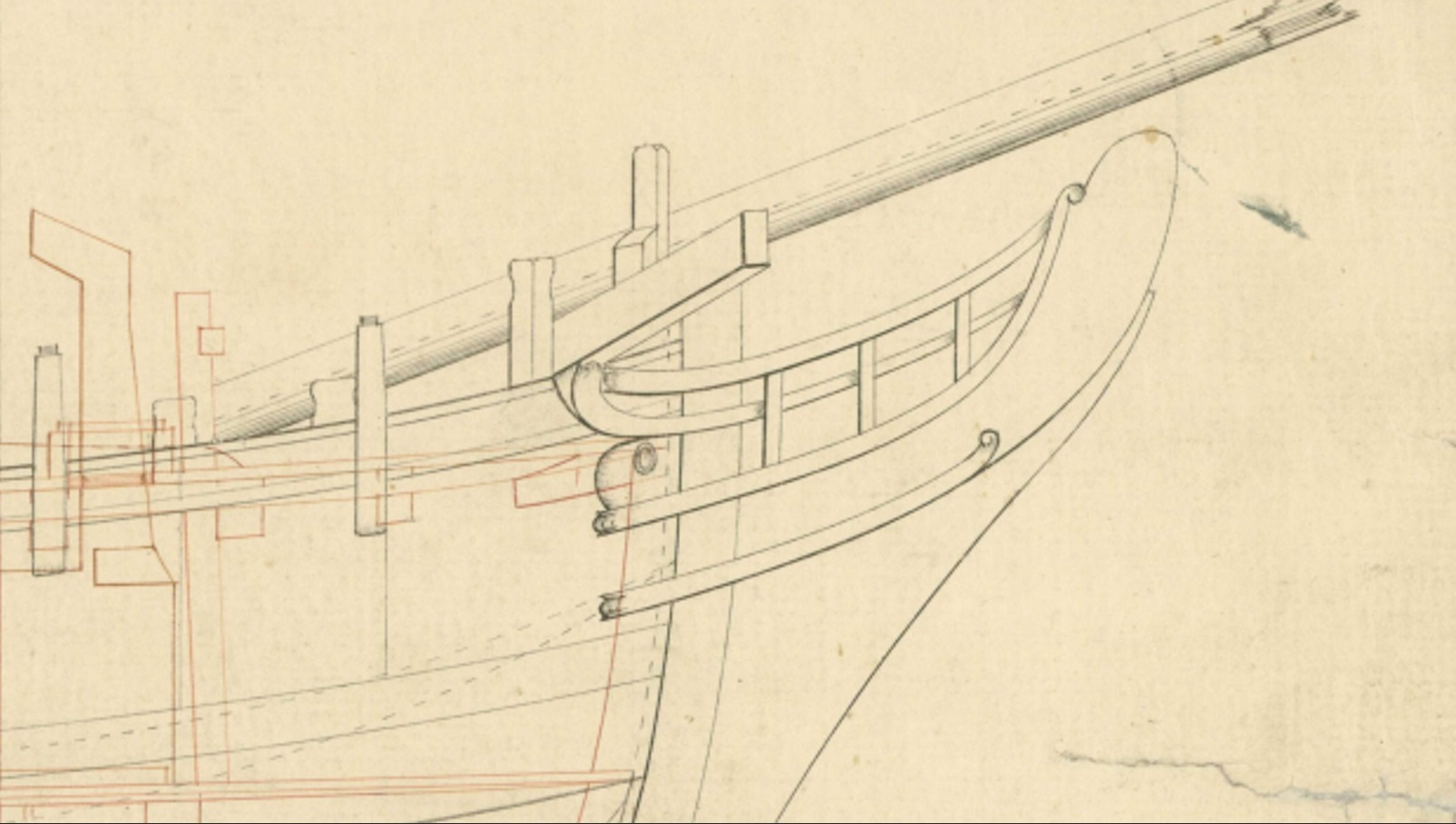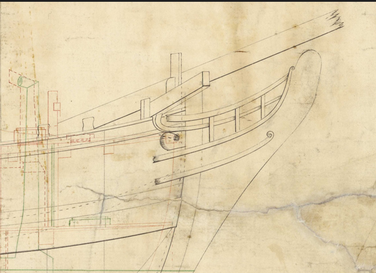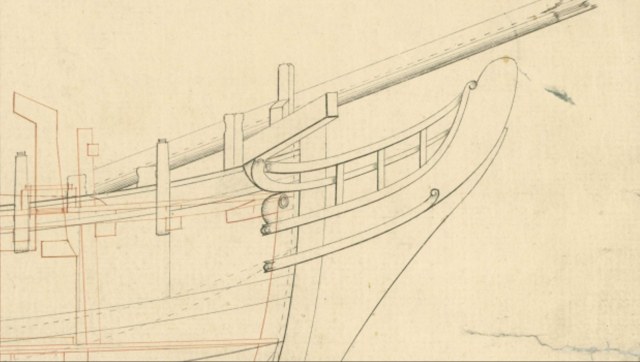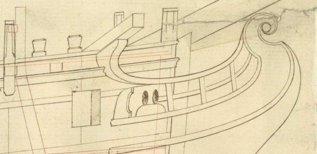 *про мальчика: в те годы мастерам и тем более Сюрвейерам Флота (в Англии эту должность писали с заглавной буквы, я вынужден вторить) просто не хватало времени на всякого рода мелочи, с которыми справлялись бы толковые деревенские мальчишки-подмастерья, за жалкие копейки выполнявшие всю второстепенную работу. Например, обвести линии на чертеже. Девочек считали тупыми неспособными на столь ответственную работу. Общепринятая практика тех лет, перенятая у художников: мастер или Сюрвейер Флота чертили чертёж карандашом, потом на заседании Комитета эскизный проект обсуждался, вносились корректировки, а потом чертёж отдавали подмастерьям обводить тушью. Это породило столько интересных моментов на чертежах! Иногда так интересно наблюдать, что, где и как изменялось, исправлялось, отвергалось, и, конечно же, интересно находить ошибки, когда мальчик слишком увлёкся и завел линию далеко или обвёл то, что не нужно. Так уж повелось, что карандаш по понятным причинам уже не стирали с обведенного чертежа, и этот нюанс, наличие черновика и конечного варианта на одном листе одновременно, - отличная пища нам, потомкам, для изучения.