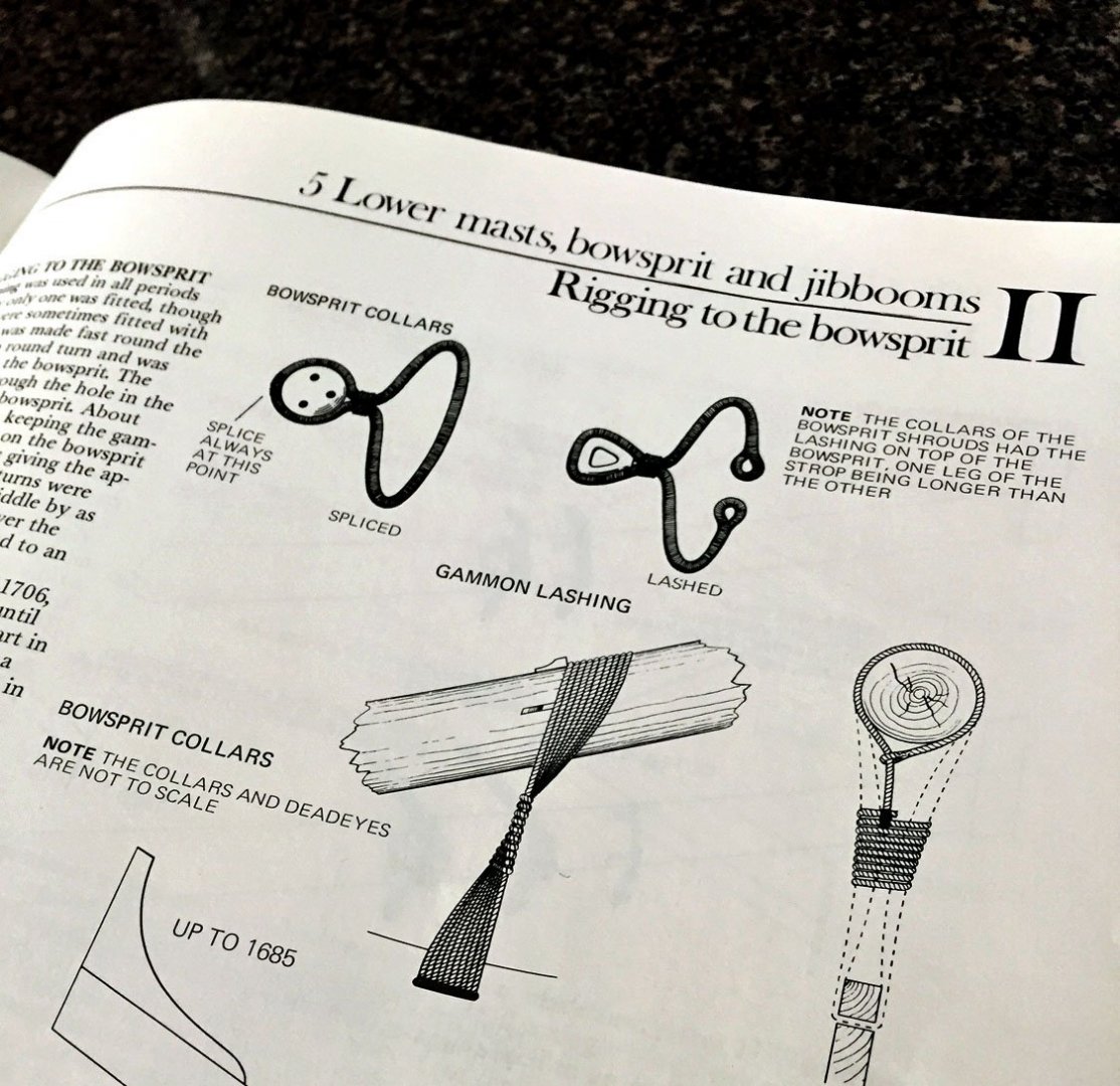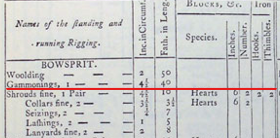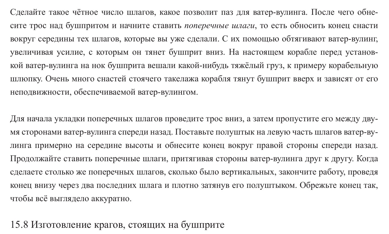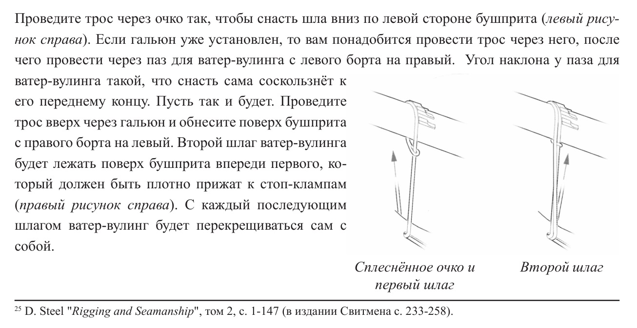 Кстати, легко запомнить, почему постоянный ватервулинг проходил в условной второй секции, между первым и вторым шпангоутами, а не ближе к корпусу, в третьей секции, между вторым и третьим шпангоутами: там у стандерс-индигеда как раз начинается сочленение рук, и в этом сочленении делался гат (отверстие) для проводки петли штаг-крага фока-штага. Если мы тут протащим ещё и ватервулинг, будет очень трудно обслуживать - да вообще заводить! - эти снасти стоячего такелажа в столь сильной тесноте. Но в аварийной ситуации нет выбора. Отверстие, понятно, сделано заранее - в критической ситуации это будет сделать весьма проблематично. Надо отметить, что два отверстия для ватервулинга в княвдигеде - это всё-таки роскошь для кораблей высоких рангов.