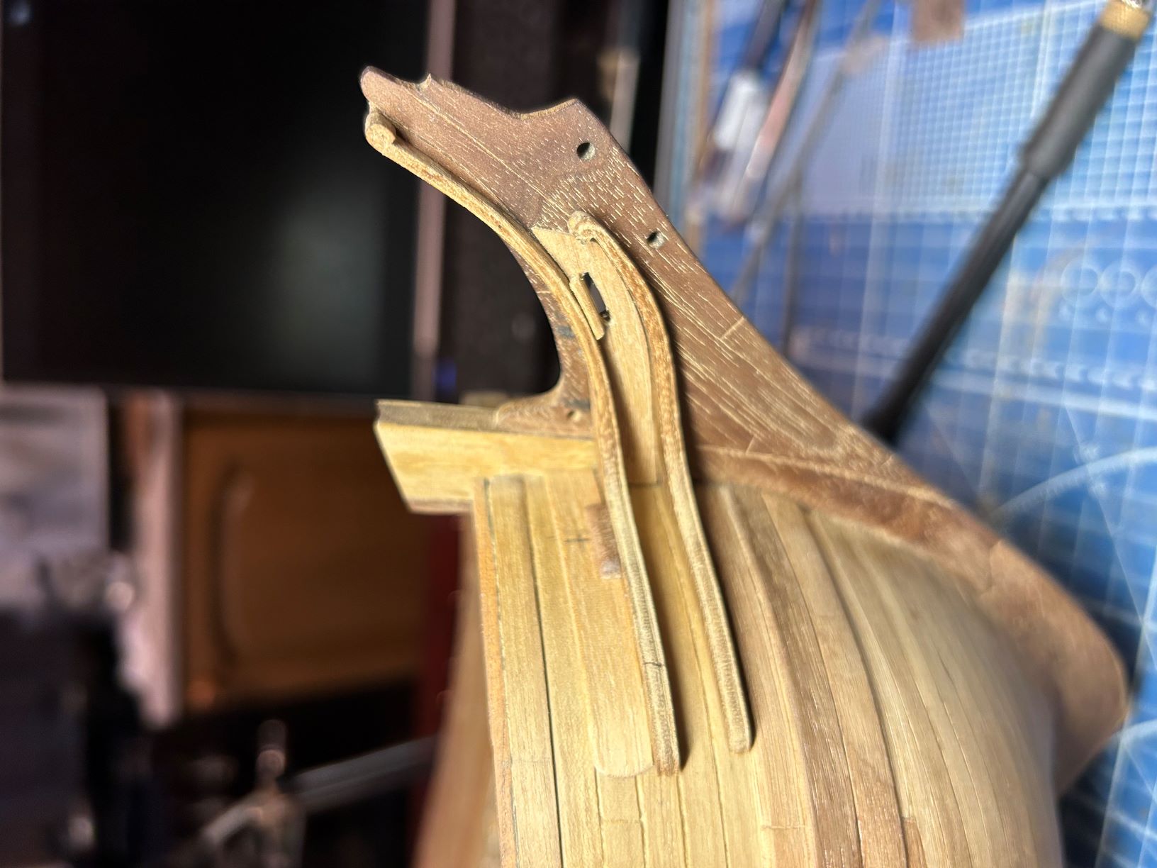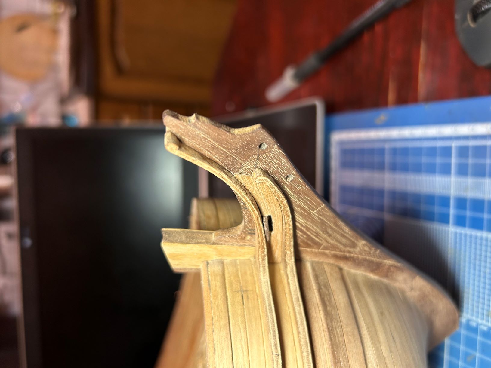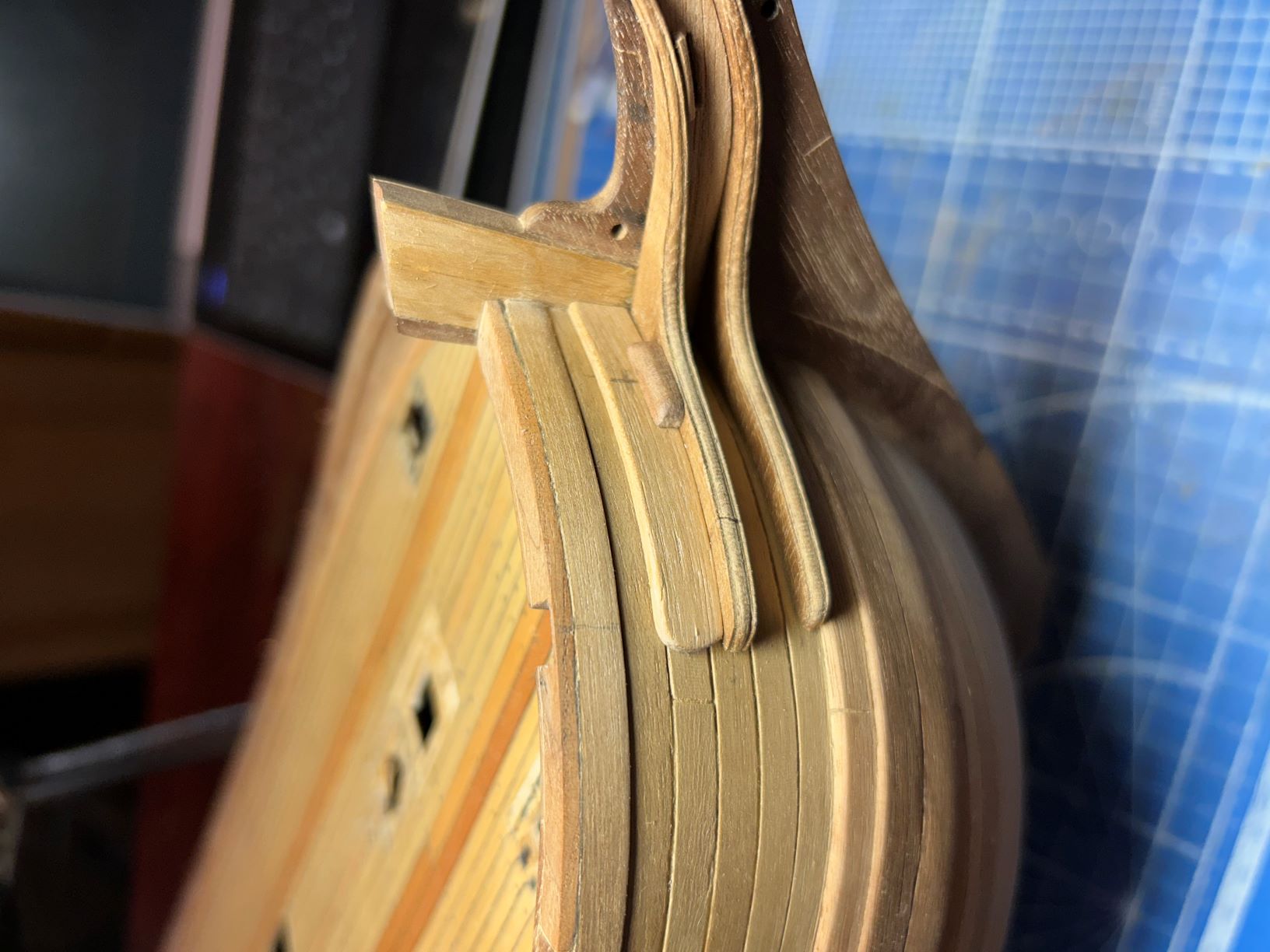 На фото модели Минервы видно, как невельвудс доходит до форштевня и упирается в него, а подклюзовая губа, мягко закрыв край клюза, на этом и заканчивается - а что ей делать в нише между бортом и форштевнем, там нет для неё работы.