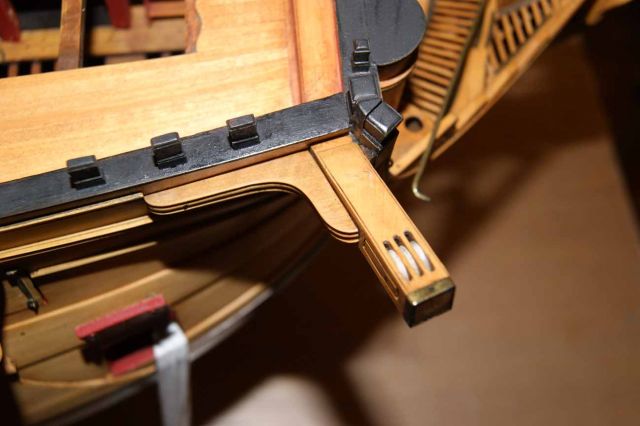 Если вернуться к модели шлюпа из прошлых сообщений, то у него верхний регель тоже имеет на передней вертикальной поверхности фасон, повторяющий фасон сапортуса (соединён с ним в один элемент) и чикс. И тоже упрощённый. Вот такой же фасон и на верхнем регеле Баунти. Но, это да, на Баунти верхний регель помощнее и посерьёзней, конечно:
