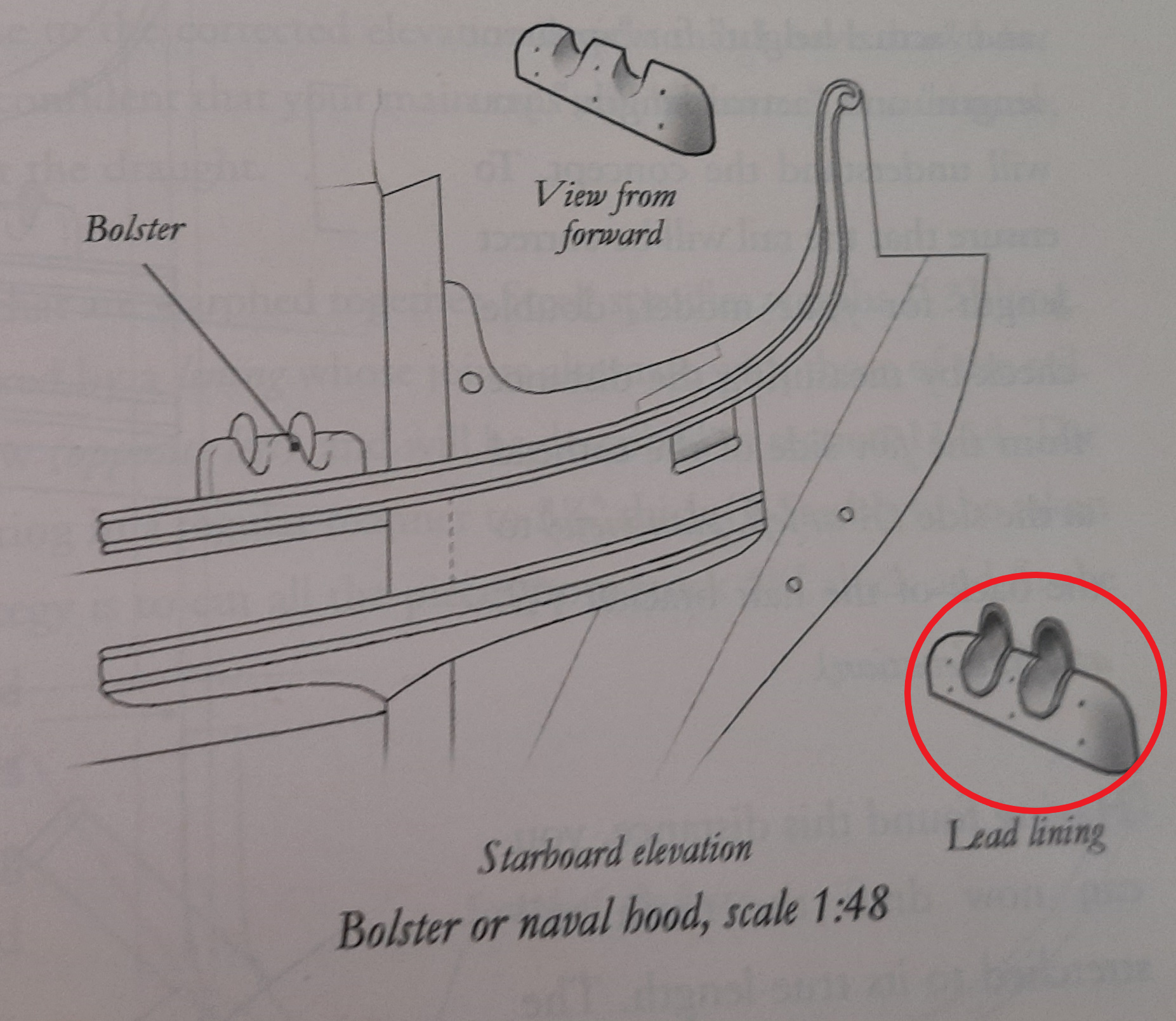 Поэтому на чертеже Баунти как раз всё есть, отлично всё видно, и показан ответ на твой вопрос: и конструкция клюза, и наличие свинцовой оболочки канала клюза и развальцовка свинцовой трубы - от этих размеров и танцуем, и других не будет.