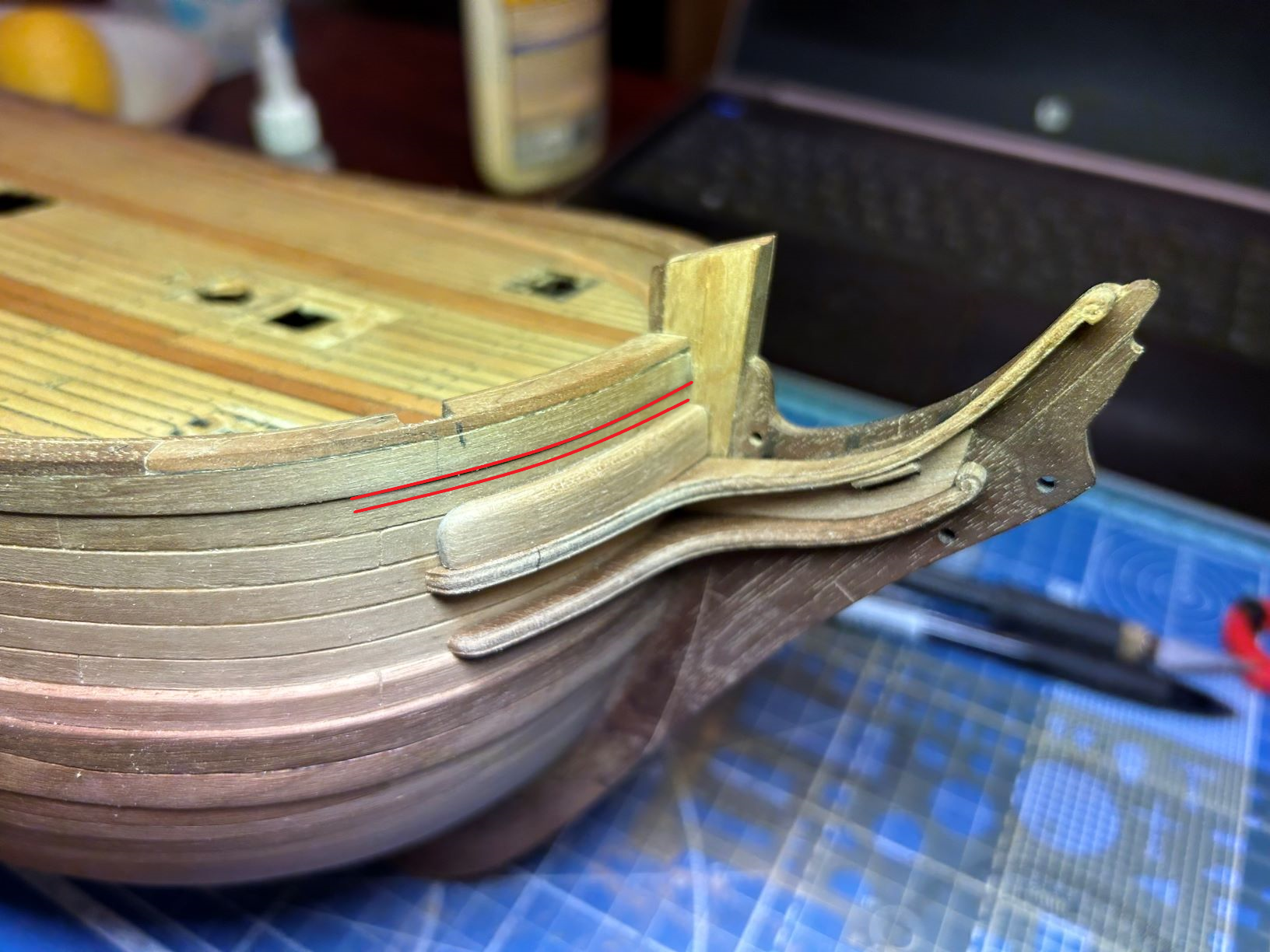 На раннем чертеже, если уж очень увеличить, то можно даже (якобы) разглядеть рядом с кромкой губы и кромку невельвудса. Но это скорее просто мальчик так рисовал, я хз. Но, если это всё-таки невельвудс, то у тебя будет сначала планка, и только потом закруглённая деталь сверху(то есть, губа) - а это совсем по-другому изменит восприятие губы - она станет визуально как минимум в два раза тоньше. Тем более, губа не доходит до форштевня, и там толщину тоже будет видно - но, понятно, уже на фоне невельвудса, а не простой обшивки, а это в два раза худее.
