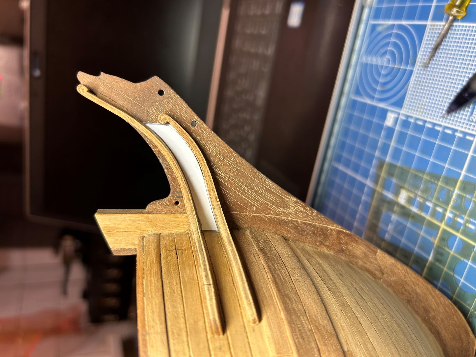 Сделал доску-усилитель между чиксами из рейки толщиной 1мм изогнув её на ребро (предварительно, конечно, сделал шаблон из картона). Игорь рекомендовал сделать толщиной 0,5мм, но мне показалось маловато и посмотрев некоторые фото моделей решил сделать потолще. Вроде простая деталь, а провозился пол дня. Установил также валик в районе проводки ватер-вулинга. Не знаю надо ли было делать или нет (где то установлен, где то отсутствует), но если учесть его функцию - устранение резкого перегиба ватер-вулинга, в моём случае он необходим. Больше всего сомнений возникает в части толщин рук чикс как со стороны корпуса так и со стороны княвдигеда. Когда добавляются другие элементы такие как эта доска-усилитель сомнения увеличиваются. На некоторых моделях разница толщин этой доски и чикс минимальна и даже валик не нужен. На других моделях - наоборот разница больше и валик присутствует. Но у меня валик получился ещё больше чем на этих моделях. То ли толщина рук чикс большая, то ли толщина доски-усилителя недостаточная?