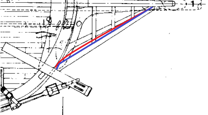 2. На архивном чертеже (вид сверху) элементы гальюна отсутствуют, есть изображение в Анатомии МакКея. МакКей показал верхний регель на виде сверху абсолютно прямым. Но при таком варианте в месте контакта регеля с корпусом мы получаем крайне малое пятно контакта. Так и хочется немного завернуть край регеля параллельно борту и тем самым увеличить пятно контакта двух поверхностей (красная линия). Мне кажется и на виде сбоку на архивном чертеже просматривается некоторый поворот края регеля на нас. Правда это противоречит классическому виду верхнего регеля, который должен быть абсолютно прямым. Второй вариант сделать регель прямым (по классике) просто сточить торец регеля под нужным углом (синяя линия). Как правильно поступить?