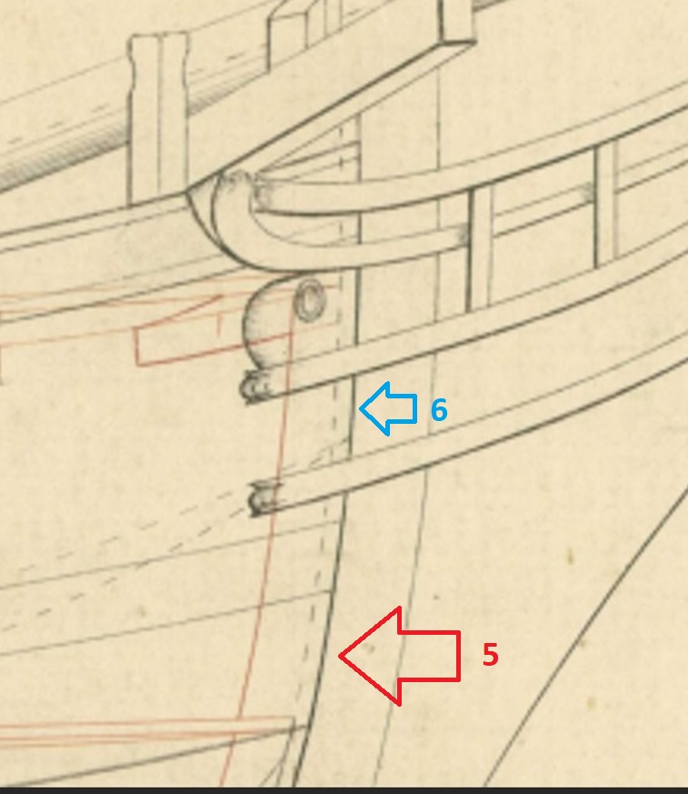 Мы только что смотрели летний чертёж, а вот на позднем всё ещё хуже, там и мейн-вельс "исчезает". Смотрим стрелку поз.5: линия стыка не имеет ступеньки, у нас, получается, бархоут одной толщины с обычной обшивкой. Раз и стык мейн-вельса с форштевнем "сошлифовался", то вновь возникает вопрос, а не "сошлифовался" ли стык подклюзовой губы со штевнем, ведь налицо прецедент. И только зная "как там было у других", можно сказать - тут просто небрежность. Бархоуты "сошлифовывались" и на многих других чертежах, так что нам не привыкать.