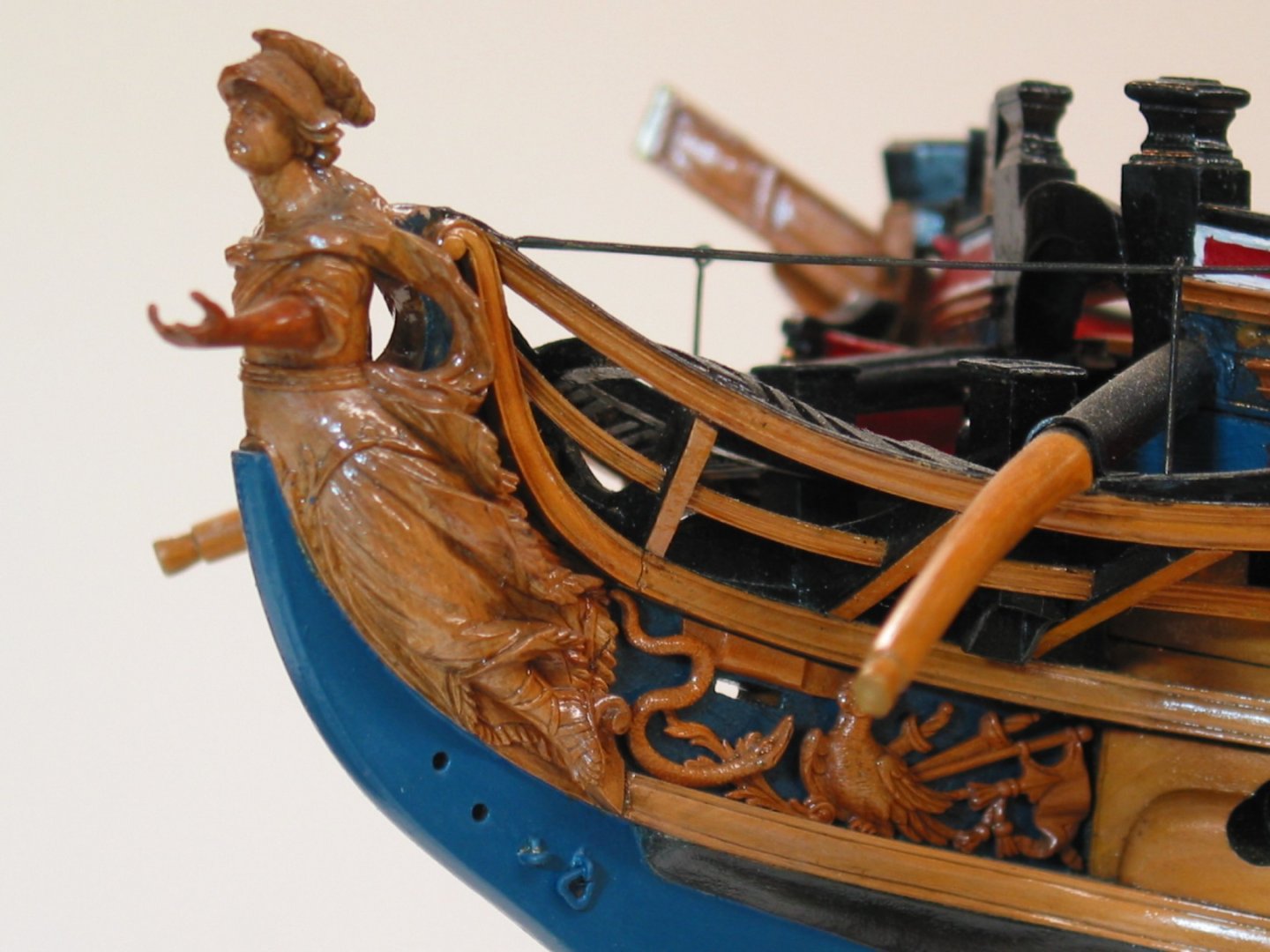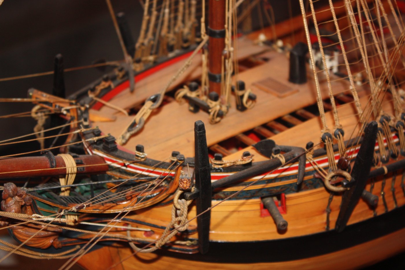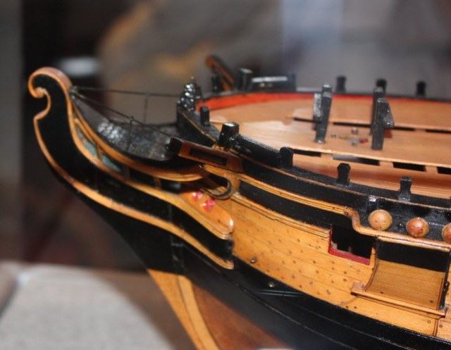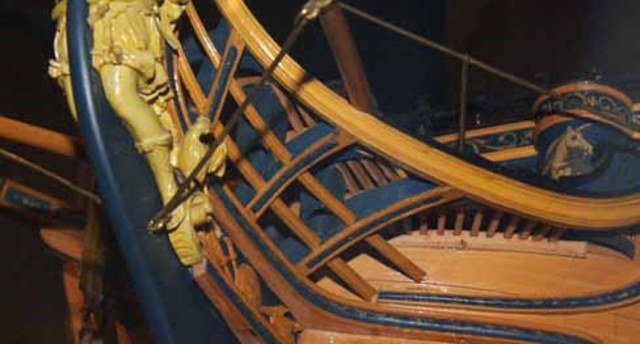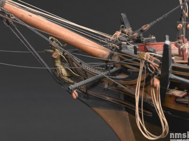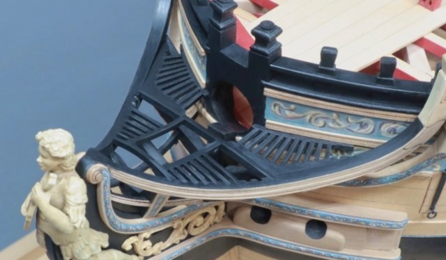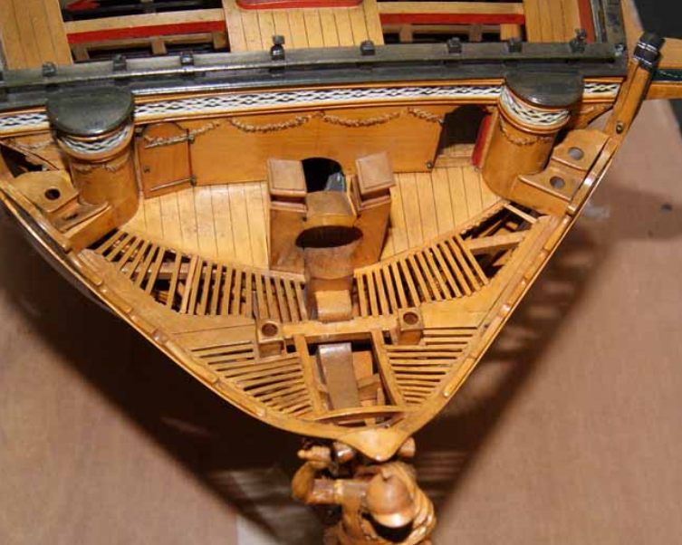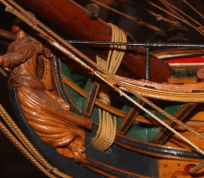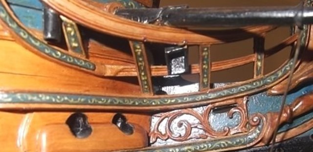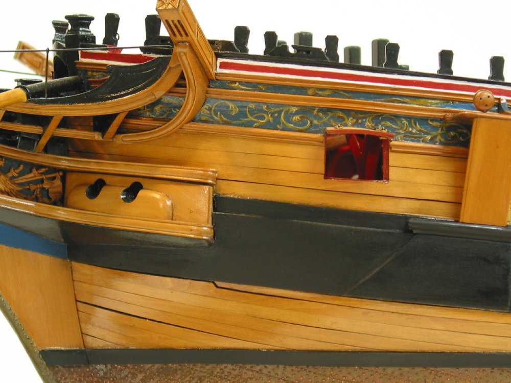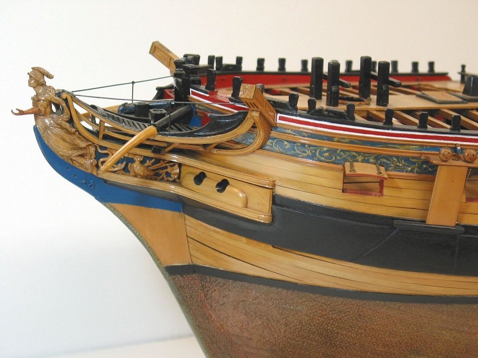 В том то и дело, что на одних чертежах рисунок есть, на других - нет. И можно было бы подумать, что эти чертежи также упрощены как и чертёж Баунти, но при этом на них присутствуют другие украшения в том числе и носовые фигуры. Также просмотрев множество музейных моделей я обнаружил, что и на них есть накладки шпангоутов без рисунка. Привожу несколько примеров, хотя и согласен, что большинство моделей имеют рисунок. С другой стороны Баунти довольно скромный проект, может и действительно не было никаких укрошательств в этой части?