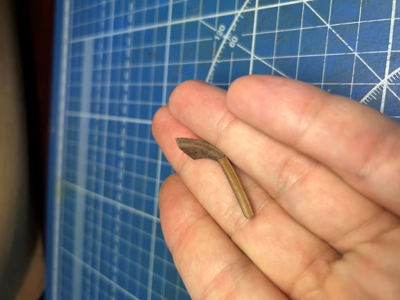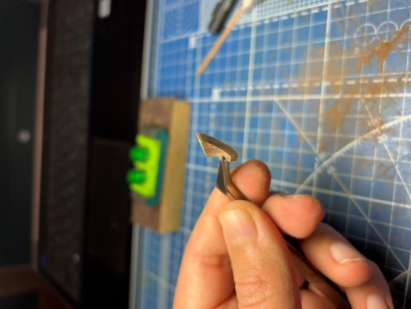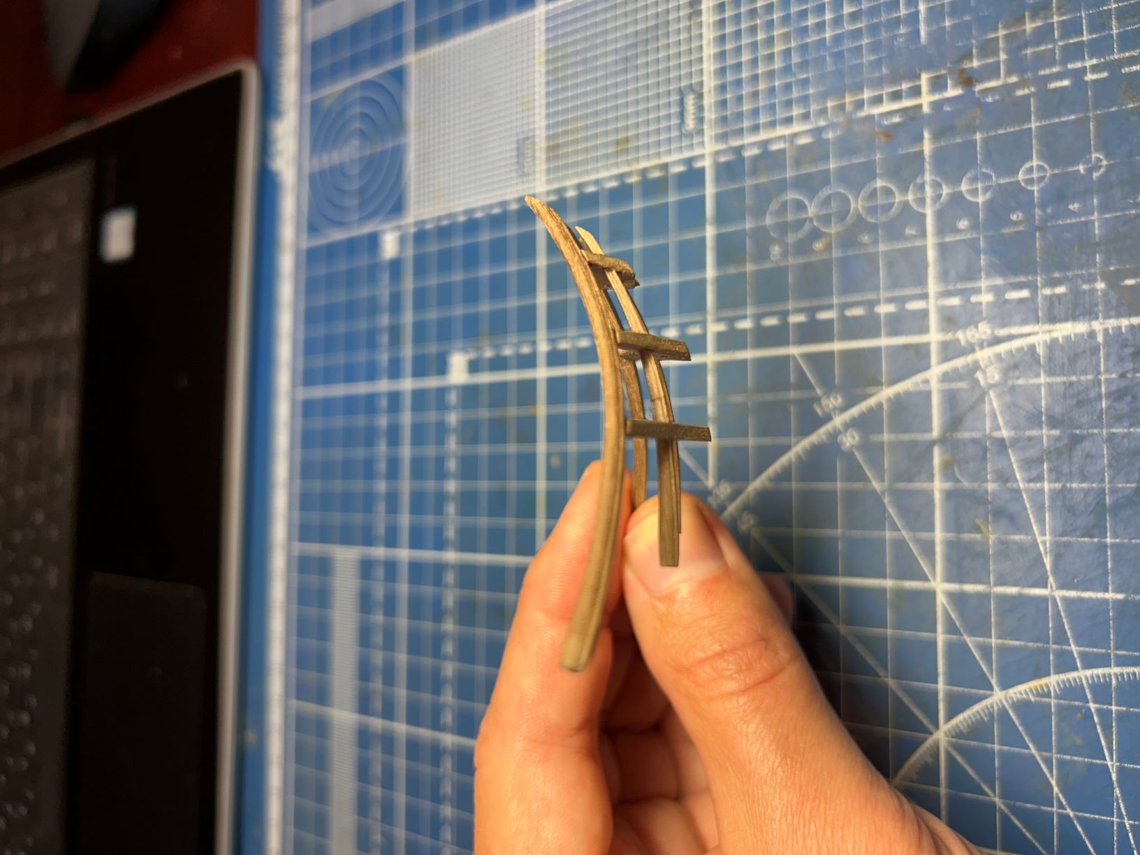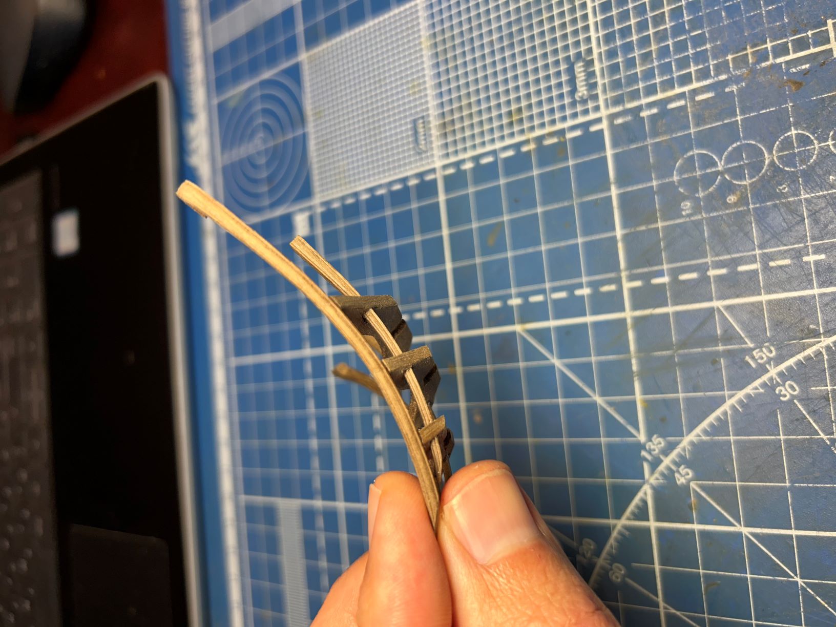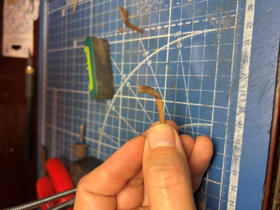 4. Стыкуем полученный элемент с прямой рейкой формируя хвост сапортуса (в моём случае орех 3х3мм) и обрабатываем как один элемент.
