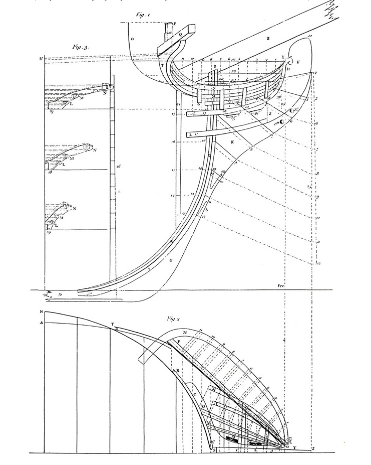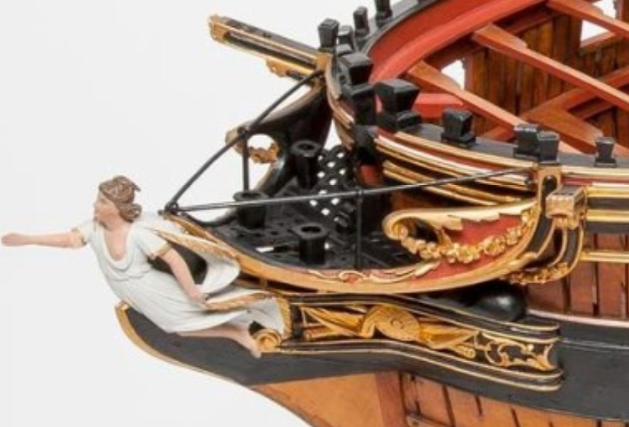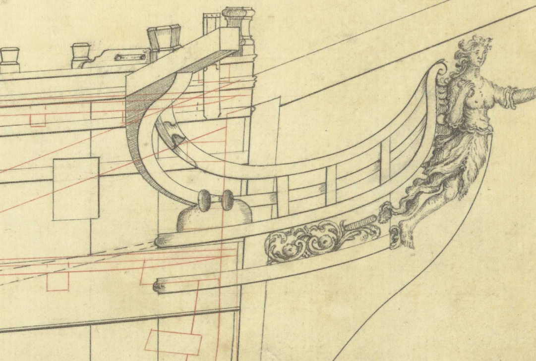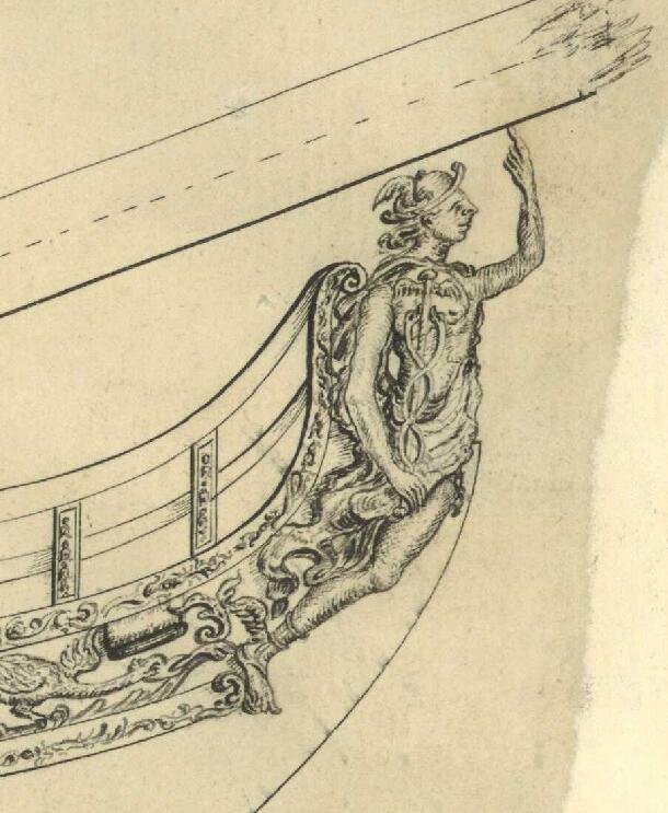 И можно было бы подумать, что эти чертежи также упрощены как и чертёж Баунти, но при этом на них присутствуют другие украшения в том числе и носовые фигуры